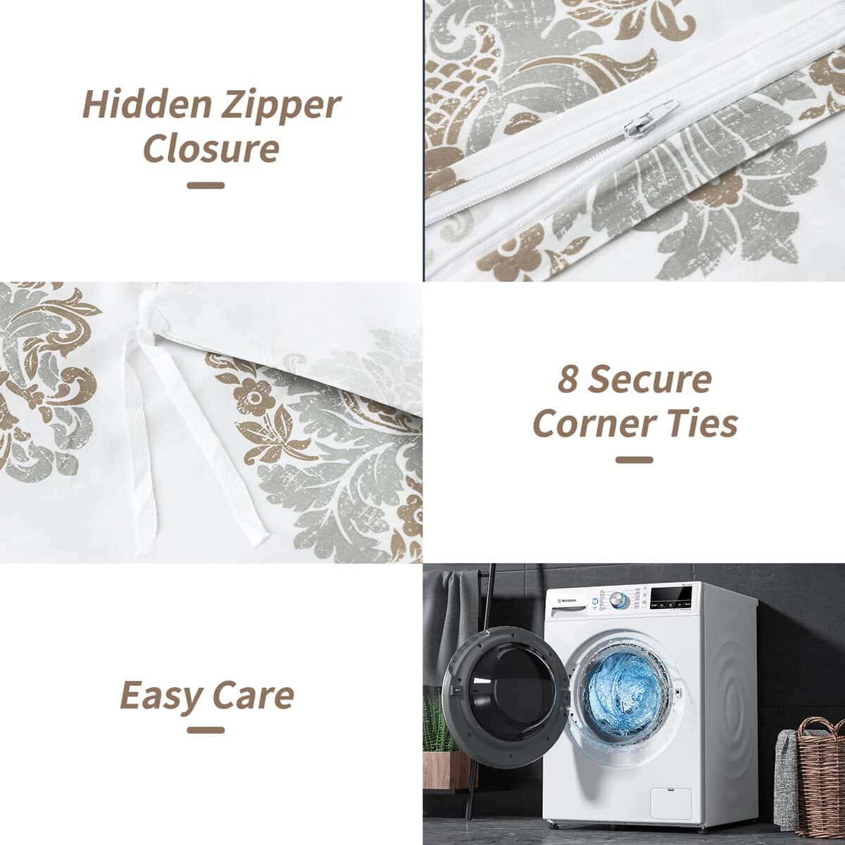 Juego de funda de edredón king de Perhom hecho de algodón 100% certificado por Oeko-Tex Standard 100, garantiza comodidad, transpirabilidad, durabilidad y suavidad. El diseño damasco es elegante, simple y versátil, perfecto para cualquier decoración. La funda de edredón king tiene un cierre de cremallera oculto para una fácil inserción y extracción del edredón, además de 8 lazos de esquina que evitan que el edredón se desplace durante la noche. Esta funda de edredón es lavable a máquina, lo que facilita su limpieza y mantenimiento. El juego incluye una funda de edredón king de damasco de 104″x90″, y 2 fundas de almohada de 20″x36″. ¡No se incluyen edredones ni almohadas en el juego! Si tienes alguna pregunta sobre el producto, no dudes en contactar con nosotros, estaremos encantados de ayudarte.