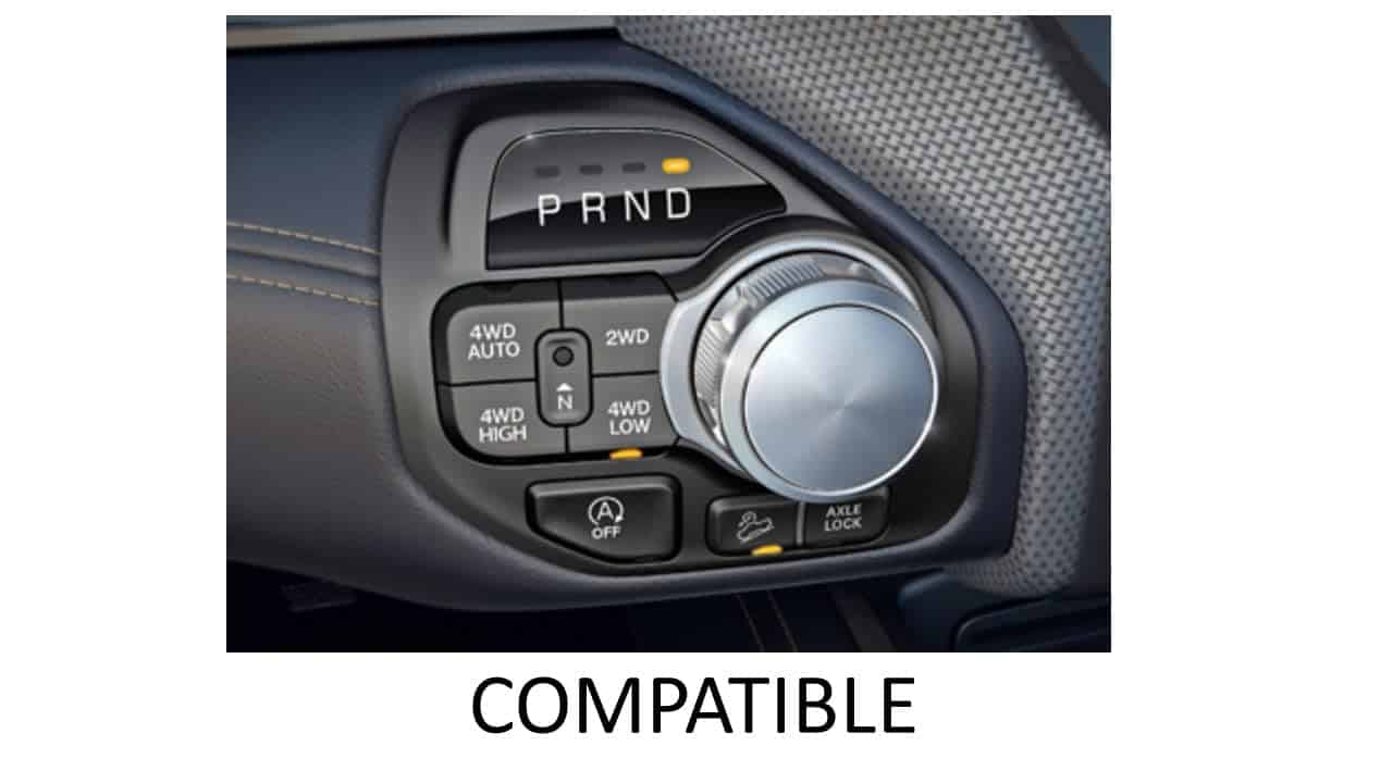 Diseñado específicamente para la mayoría de las camionetas RAM 1500, 2500 y 3500 equipadas con un selector de marchas automático giratorio montado en el tablero. No es compatible con modelos RAM Classic o camionetas RAM 2025+. Se ajusta de forma segura utilizando puntos de montaje de fábrica.
