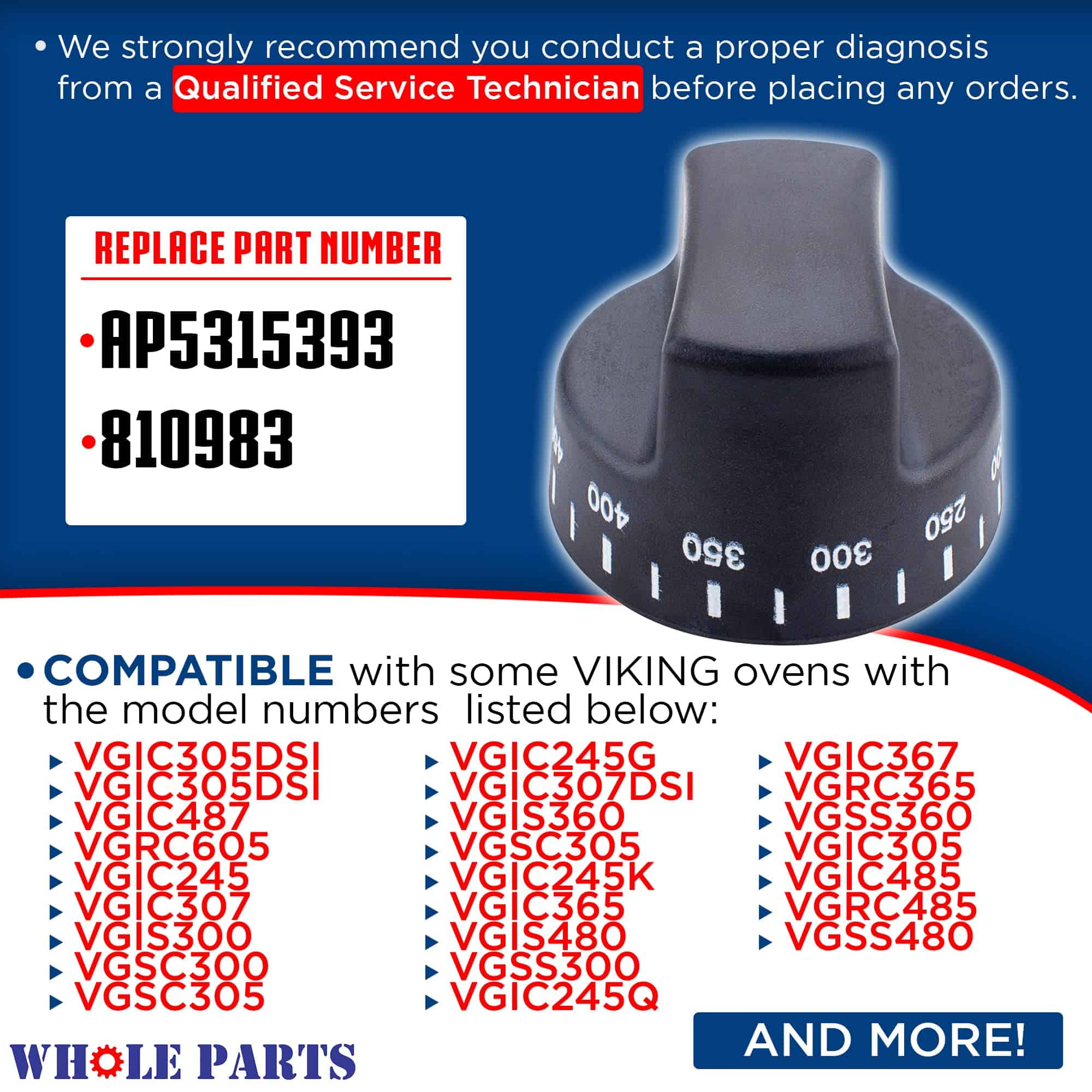 Perilla de termostato para horno Whole Parts PB010099. Esta pieza reemplaza a AP5315393, 810983. Modelos compatibles incluyen pero no se limitan a SVGIC305DSI, VGIC305DSI, VGIC487, VGRC605, VGIC245, VGIC307, VGIS300, VGSC300, VGSC305, VGIC245G y más. FABRICADO Y PROBADO para funcionar tan bien como las piezas originales de la marca OEM, pero a un mejor valor que una pieza comparable del fabricante original. CALIDAD, DURABILIDAD, FUNCIONALIDAD a un precio razonable tanto para el reparador profesional como para las reparaciones de bricolaje de los electrodomésticos de cocina. Ofrecemos una garantía de fabricación de 2 años para garantizar la satisfacción del cliente al 100%. INGRESE SU MODELO para verificar que este modelo sea compatible con su electrodoméstico, asegúrese de verificarlo. No recomendamos pedir piezas basadas únicamente en imágenes. Recomendamos realizar un diagnóstico adecuado con un técnico de servicio calificado antes de realizar cualquier pedido.