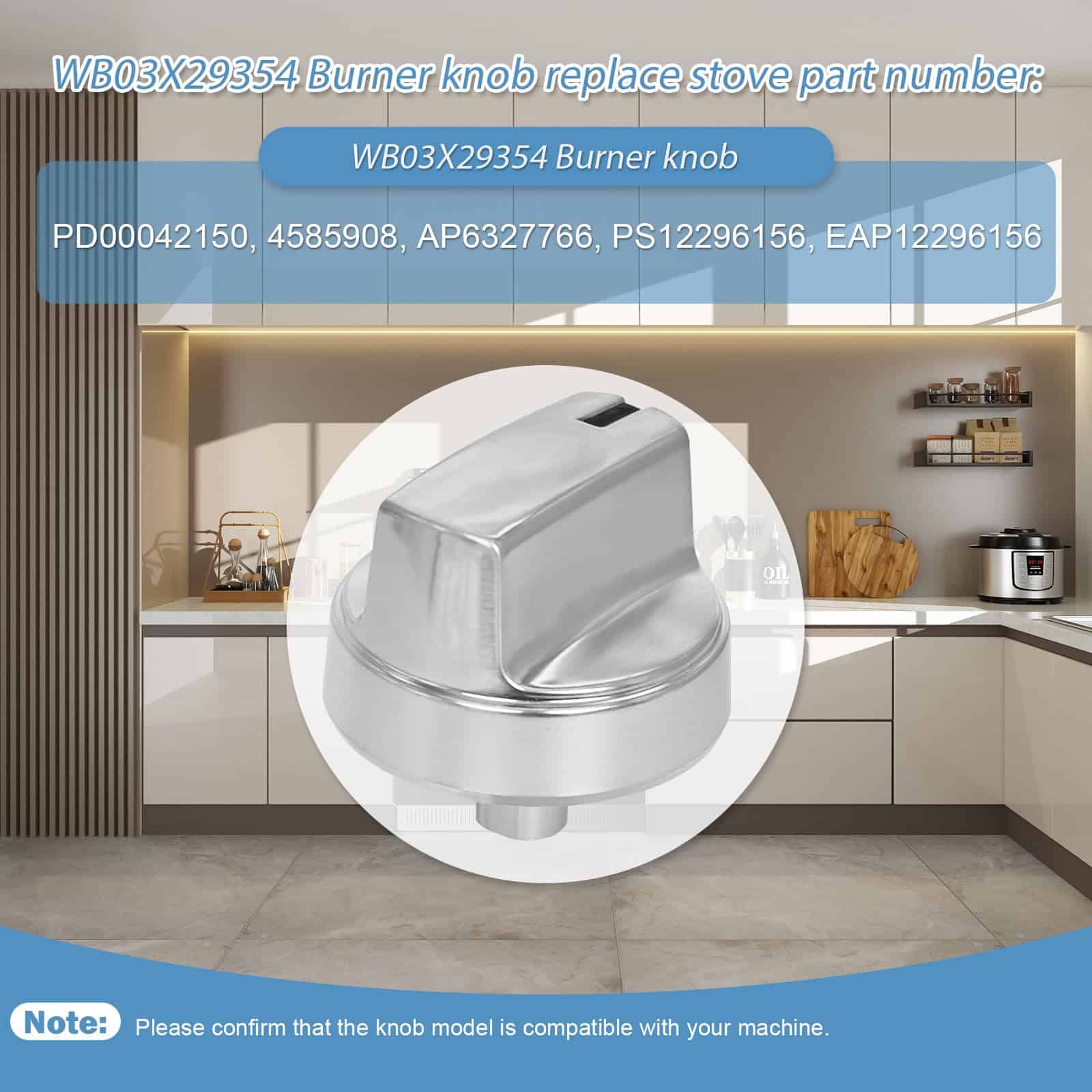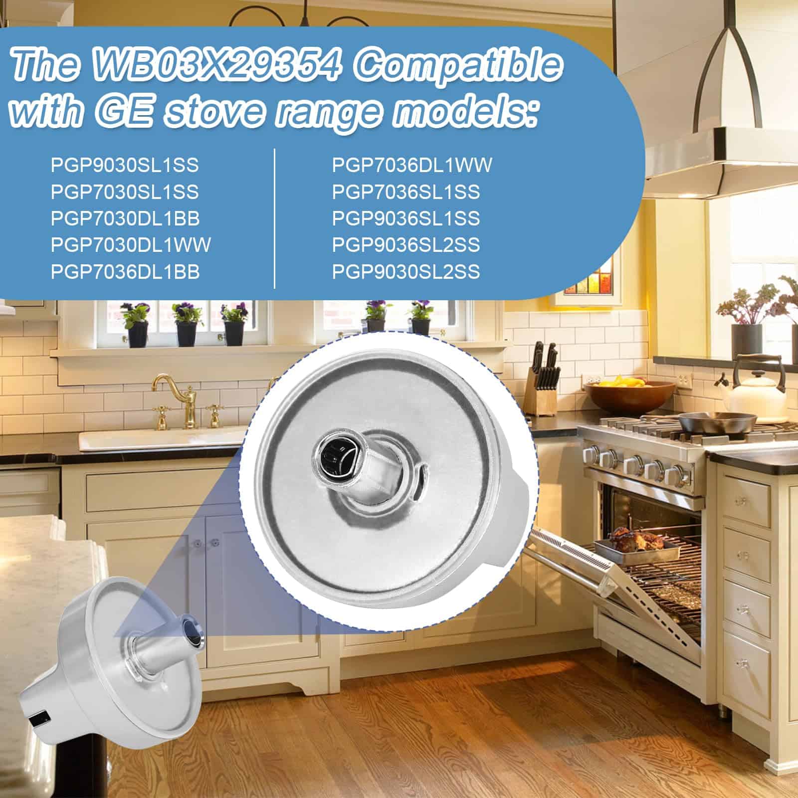 Perilla para Cocina de Gas WB03X29354 Control de Quemador de Superficie de Cocina Reemplaza PD00042150 4585908 AP6327766 PS12296156 EAP12296156. Ajuste fácilmente a modelos de estufa GE PGP9030SL1SS, PGP7030SL1SS, PGP7030DL1BB, PGP7030DL1WW, PGP7036DL1BB, PGP7036DL1WW, PGP7036SL1SS, PGP9036SL1SS, PGP9036SL2SS, PGP9030SL2SS, etc. Perilla de alta calidad fabricada con materiales de alta calidad y probada rigurosamente antes de salir de fábrica. Fácil de instalar y no requiere herramientas adicionales. Controla el rango de calor de la cocina de gas.