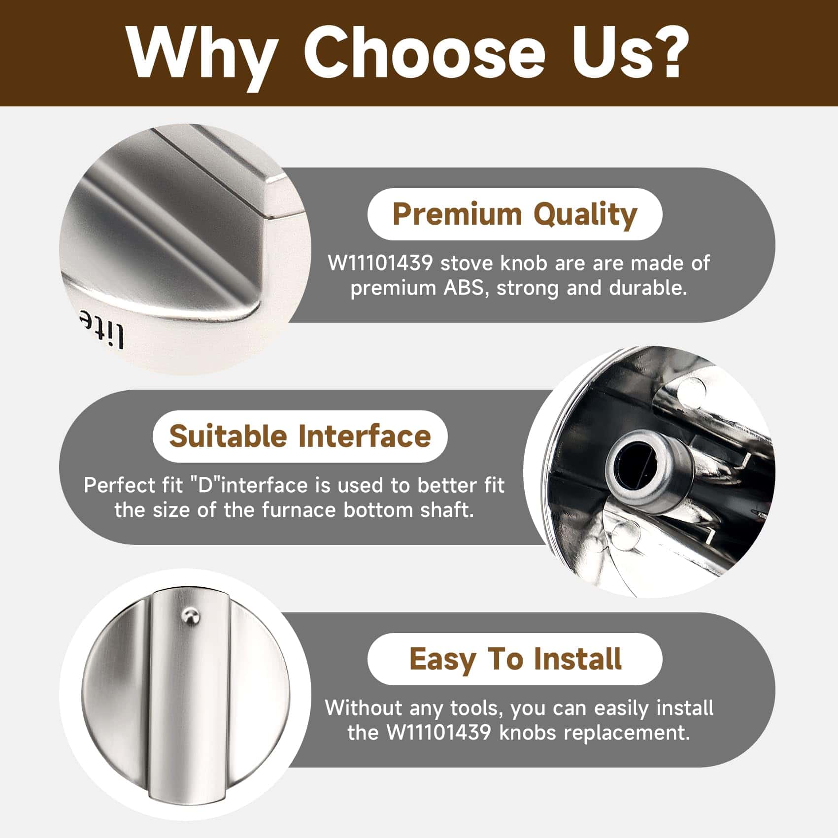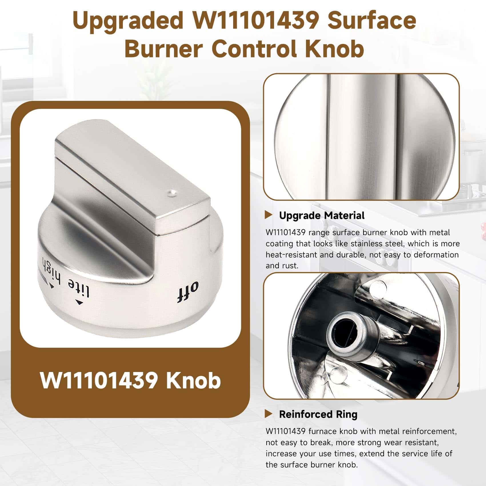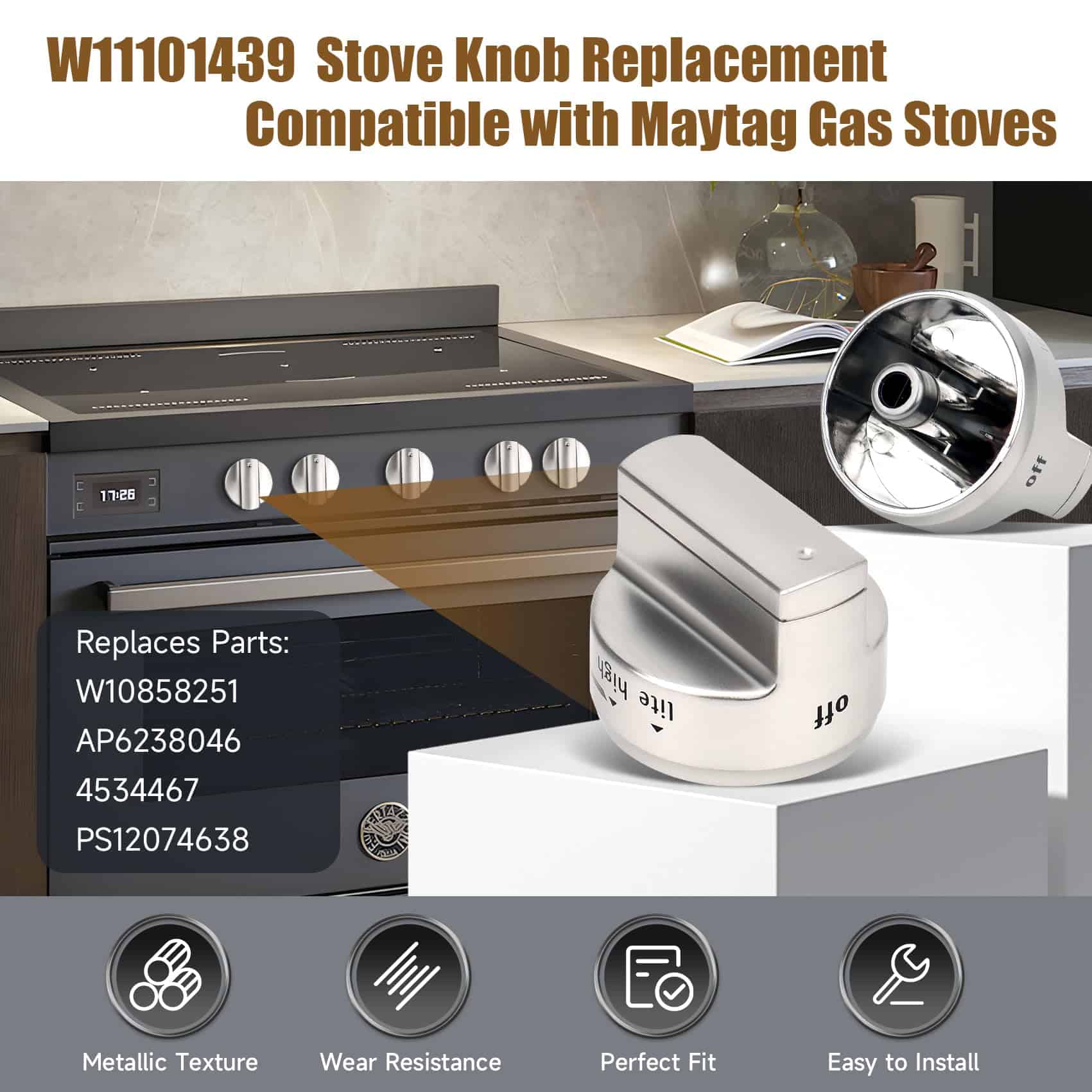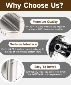 Perillas de control de quemador de superficie mejoradas W11101439, 5PCS Perilla de cocina W10858251 para cocina de gas Whirlpool, Reemplazos de perillas de estufa W11101439 compatibles con maytag MGR6600FW0, MGR6600FZ0, MGR7700LZ0. Las perillas de quemador W11101439 están hechas de material ABS de alta calidad actualizado, con la ventaja de resistencia a la abrasión y alta temperatura. Material metálico interno, puede mejorar la estanqueidad de la perilla D, más duradero, larga vida útil. Compatible con modelos W11101439 Perillas de quemador de rango mejoradas compatibles con maytag whirlpool MGR6600FW0, MGR6600FB0, MGR6600FZ0, MGR6600FZ1, MGR6600FZ2, MGR6600FZ3, MGR7700LZ0, MGR7700LZ1, etc. Reemplaza los números de parte La perilla de control de quemador W11101439 mejorada puede reemplazar los números de parte W10858251, 4534467, AP6238046, etc. y otros modelos de la serie. Si no sabes si nuestras perillas W11101439 son adecuadas para tu máquina, contáctame y lo encontraré por ti. Fácil instalación Fácil de instalar y quitar la antigua perilla de rango W11101439 tirando directamente de su poste, controla perfectamente el rango de calor de las perillas de estufa W11101439. Rigurosamente probado, es resistente y fácil de instalar, ahorrando dinero y tiempo. Servicio postventa Las perilla de quemador de rango W11101439 encajan perfectamente con tu horno de gas, pueden proporcionar resultados de cocción perfectos. Contamos con un equipo profesional de servicio postventa, si tienes alguna pregunta sobre las perillas W11101439 para maytag, contáctanos primero y podremos ayudarte a resolverlas perfectamente en 24 horas