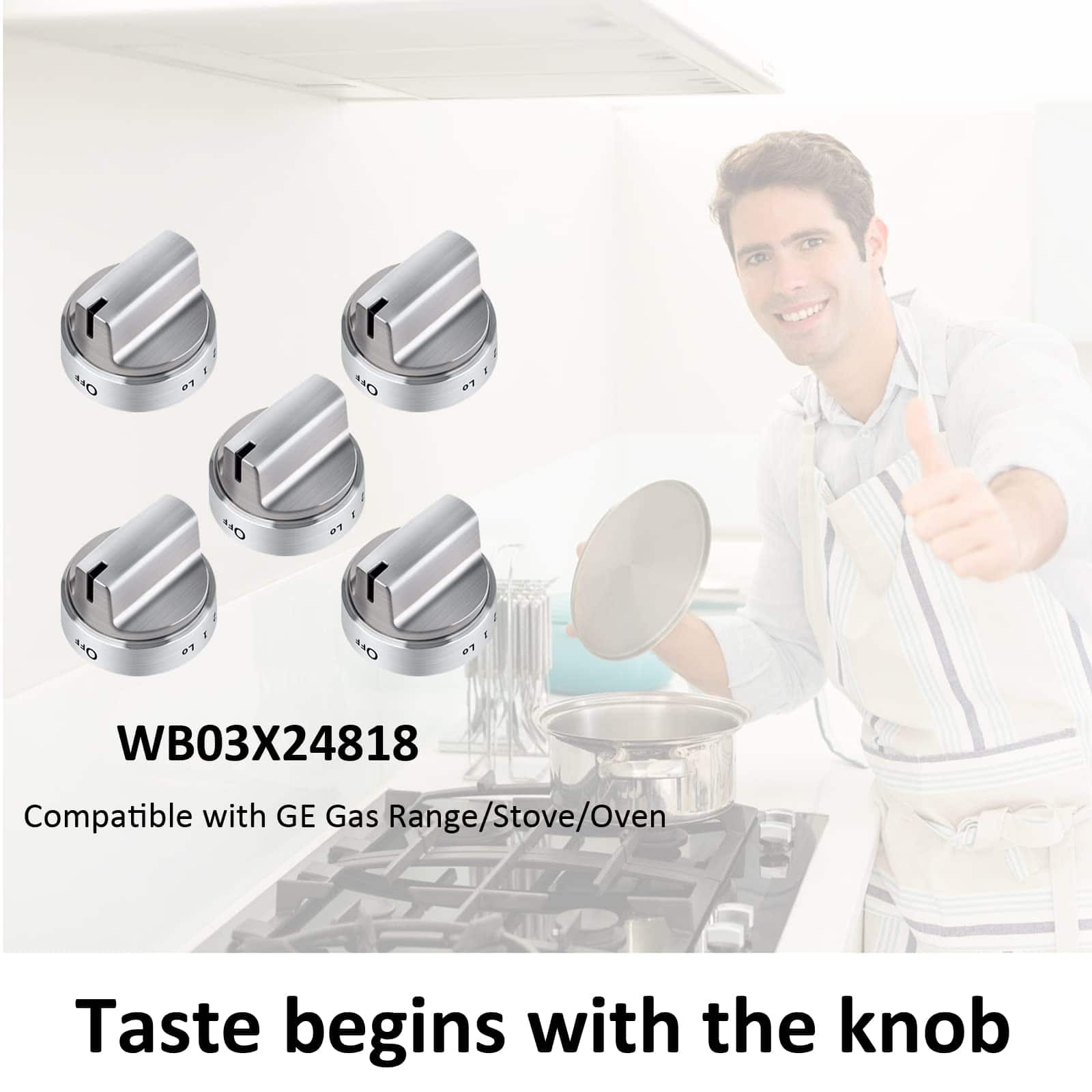 Las perillas TURNEGOO WB03X24818 funcionan para estufas, hornos o cocinas a gas Whirlpool. Esta perilla acepta un eje en forma de D. No se necesitan herramientas para completar esta reparación. Una perilla del quemador de la superficie superior de la estufa, un reemplazo directo para sus perillas desgastadas, rotas o faltantes.