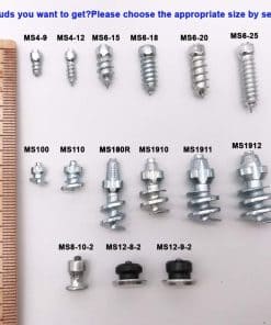 Marrkey es un fabricante profesional de pernos para neumáticos. Podemos producir todo tipo de espárragos antideslizantes: MS4 9, MS4 12, MS6 15, MS6 18, MS6 20, MS6 25, MS8 30, MS12-8-2, MS12-9-2, MS180R, MS100, MS110, MS1910, MS1911, MS1912, MS8-10-2, etc. (Información detallada consultar en las imágenes) Pueden ser utilizados en bicicletas, scooters, vehículos todo terreno, montacargas, vehículos todo terreno, automóviles, camiones de carga y descarga, tractores, botas, zapatos de senderismo y zapatos de trabajo, etc. Materiales: Espigas de los pernos: Carburo de tungsteno 100% (WC-80% + Co-10%, Dureza: 90 HRA o 1300HV TRS Mpa: (N/MM2): 1660) Cuerpo de los pernos: acero al carbono Superficie de los pernos: galvanización Uso Sostenible Este tipo de pernos para neumáticos con rosca son fáciles de instalar, se pueden sacar y volver a poner en el próximo invierno. Atención: Es importante elegir el tamaño correcto, debes conocer la profundidad del patrón de la banda de rodadura de tu neumático. La profundidad debe ser mayor a 8.5mm. El proyecto incluye: Espárragos para neumáticos 100 piezas (aproximadamente) Llave de instalación 1 pieza