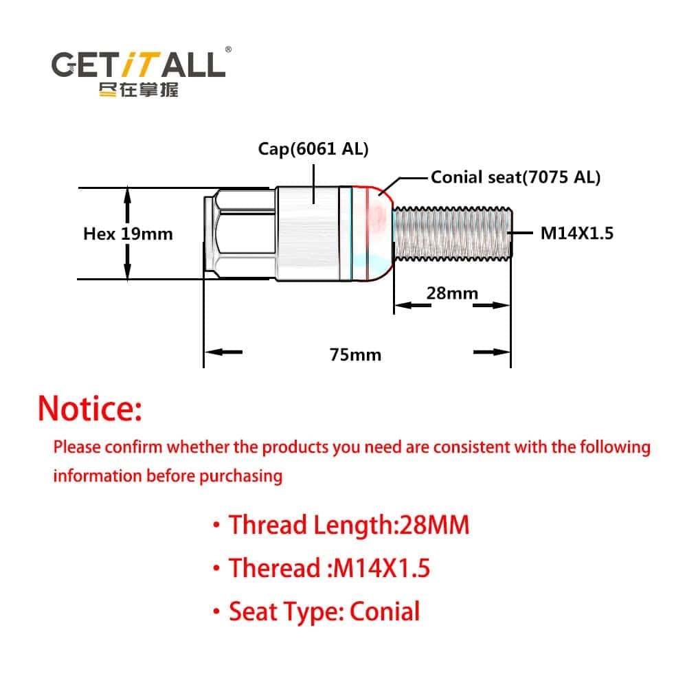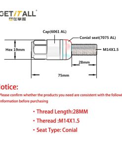4. Especificación: Paso de rosca M14x1.5 | Llave de 17 mm | Vástago de 28mm | Asiento cónico de 60 grados | Longitud de 75mm | Usar llave de mano.