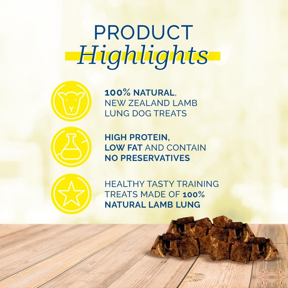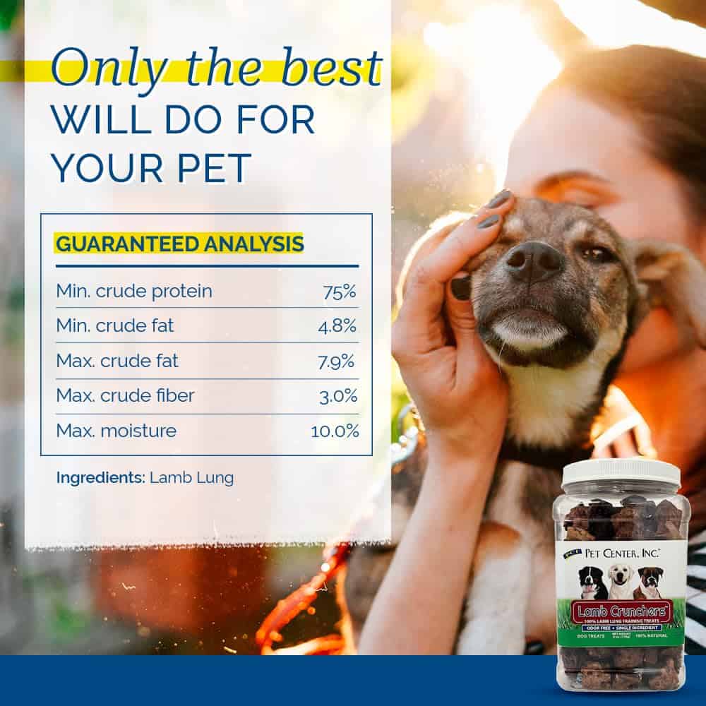 Pet Center, Inc Lamb Crunchers son premios de entrenamiento ideales para perros de todas las edades. Están hechos en los EE. UU. con pulmón de cordero de Nueva Zelanda al 100%, sin conservantes ni aditivos artificiales. Estos premios nutritivos y saludables se curan lentamente para sellar los nutrientes, con un alto contenido de proteínas y bajo contenido de grasa. Aliméntelos diariamente como una adición saludable a los alimentos húmedos y secos para perros, en la cantidad adecuada para el peso de su perro. Los premios para perros de Pet Center, Inc están hechos con ingredientes de alta calidad por amantes apasionados de los animales.