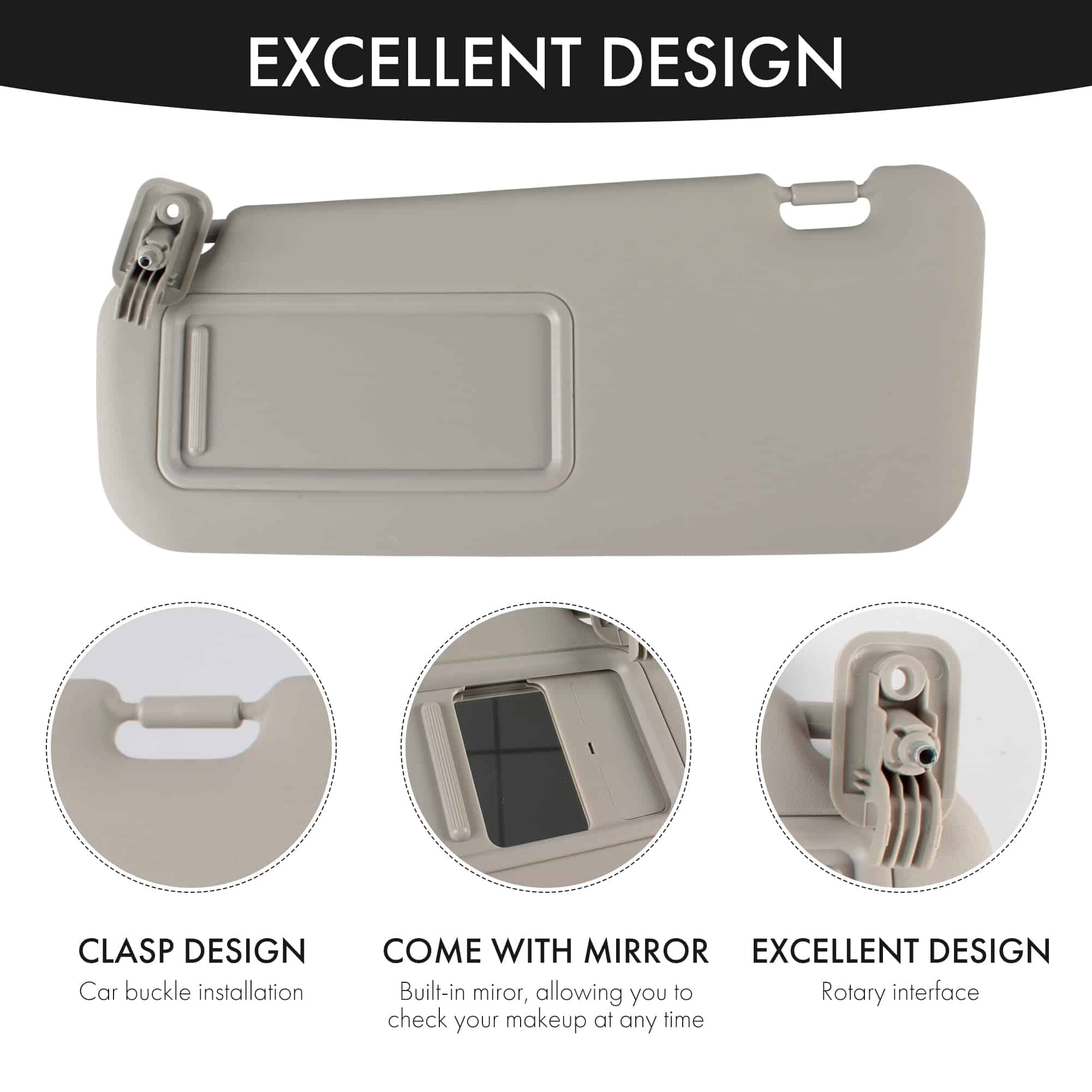 REEMPLAZA NÚMERO DE PARTE Números de Parte de Reemplazo: BBM2-69-320C-75, BBM3-69-320C-75. Antes de ordenar, por favor confirme la compatibilidad y adecuación para su vehículo para asegurar un ajuste correcto. COMPATIBILIDAD Modelos Compatibles: Visera solar del lado del conductor izquierdo delantero, compatible con modelos Mazda 3 del 2009-2012. Asegúrese que esta parte coincida con el año y modelo de su vehículo específico antes de comprar. FUNCIONES MÚLTIPLES Características Incorporadas: Esta visera solar viene con luces y espejos integrados, proporcionando protección integral contra el deslumbramiento del sol desde el frente y el lado. Ayuda a proteger sus ojos contra la luz solar directa mientras conduce, mejorando la visibilidad y la seguridad. FÁCIL DE INSTALAR Instalación Sencilla: Diseñada para una instalación fácil sin necesidad de tornillos. Puede reemplazar directamente su vieja o dañada visera solar. Instale parcialmente la cubierta del soporte en el soporte de la visera solar, asegurando que ambas garras de ajuste temporales estén comprometidas para un ajuste seguro. SERVICIO POST-VENTA Garantía y Soporte: Ofrecemos 1 año de garantía en nuestro producto. ¡Compre con confianza! Si tiene alguna pregunta o inquietud sobre nuestro producto, no dude en contactarnos y abordaremos su problema lo antes posible.