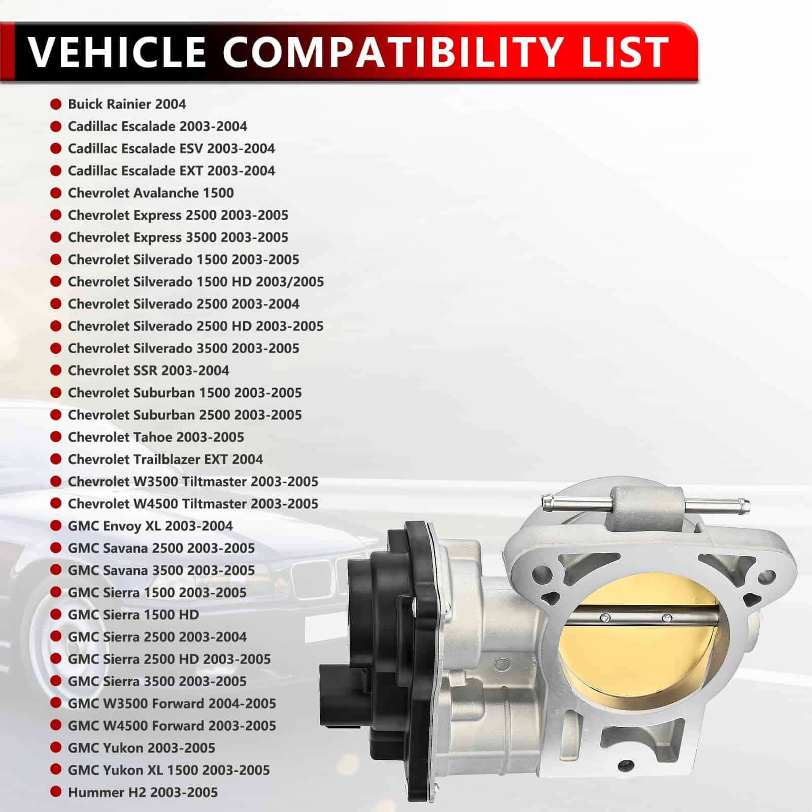 2. Compatibilidad: Cuerpo del Acelerador Apto para Chevy Silverado 1500 2003-2005 V8 4.8L/5.3L/6.0L; para Chevy Silverado 1500 HD 2003/2005 V8 6.0L; para Chevy Silverado 2500 2003-2004 V8 6.0; para Chevy Silverado 2500 HD 2003-2005 V8 6.0L; para Chevy Silverado 3500 2003-2005 V8 6.0L; para Chevy SSR 2003-2004 V8 5.3L; para Chevy Suburban 1500 2003-2005 V8 5.3L; para Chevy Suburban 2500 2003-2005 V8 6.0L; para Chevy Tahoe 2003-2005 V8 4.8L/5.3L; para Chevy Trailblazer EXT 2004 V8 5.3L; para Chevy W3500 Tiltmaster 2003-2005 V8 6.0L; para Chevy W4500 Tiltmaster 2003-2005 V8 6.0L.