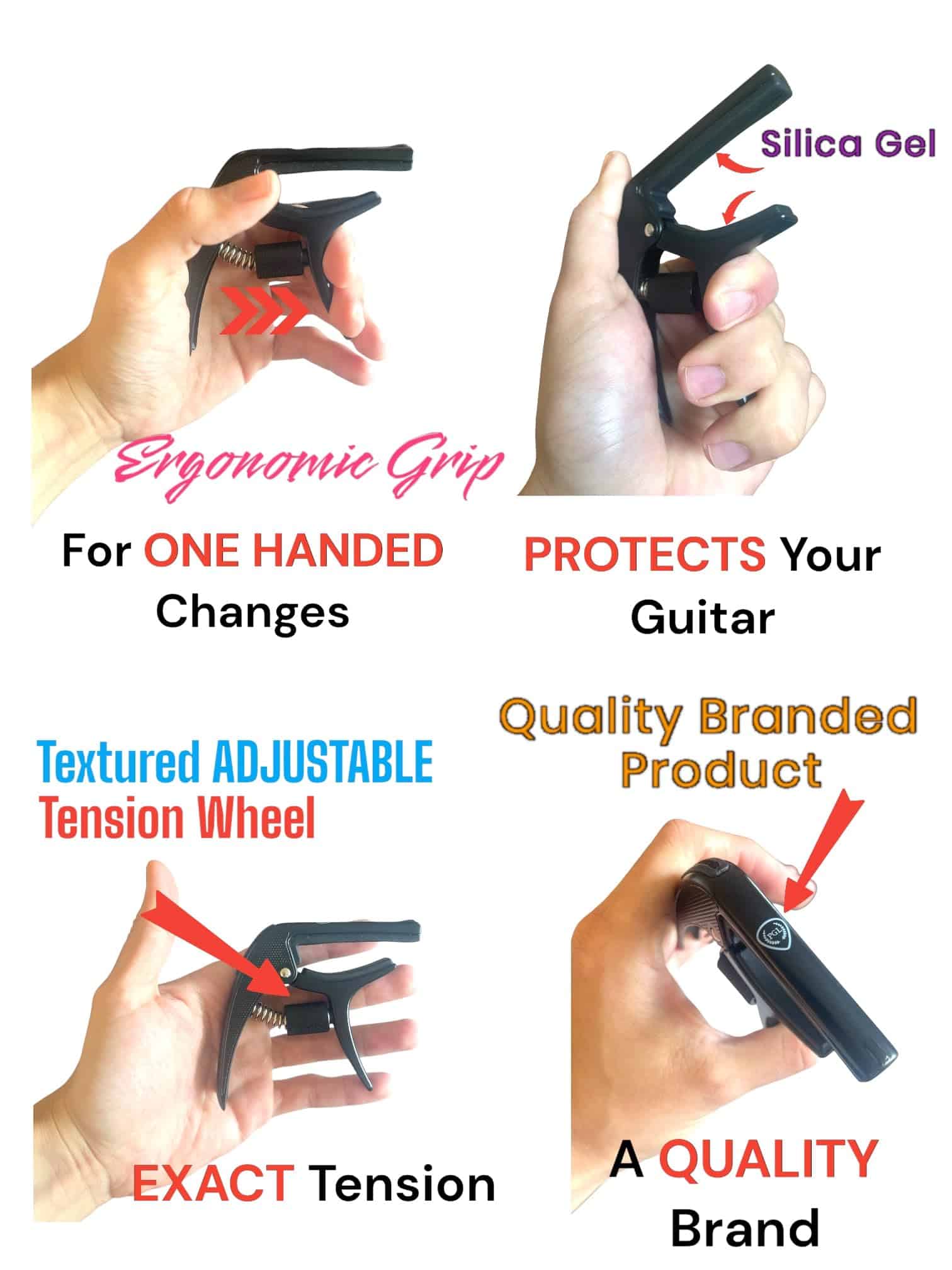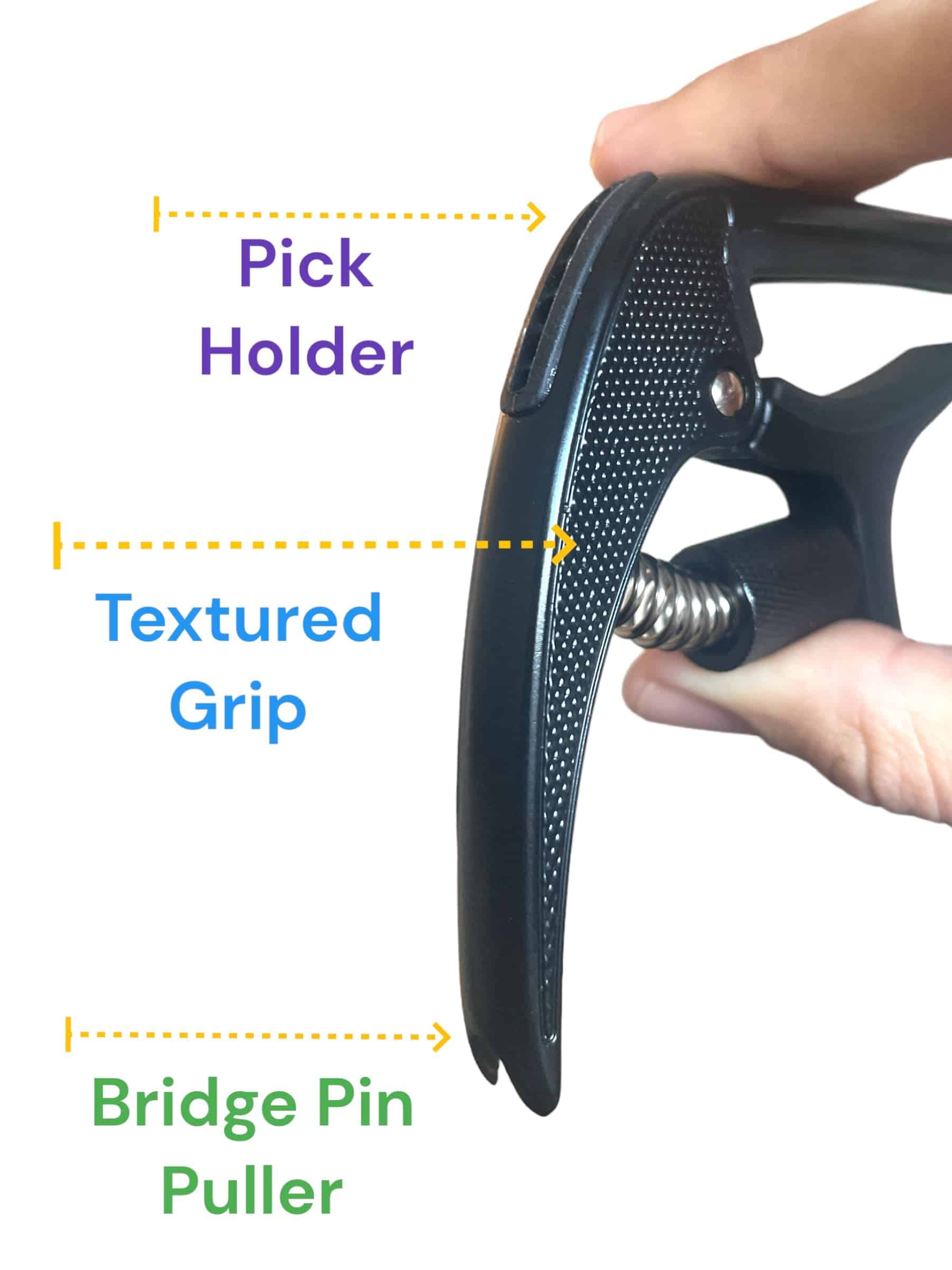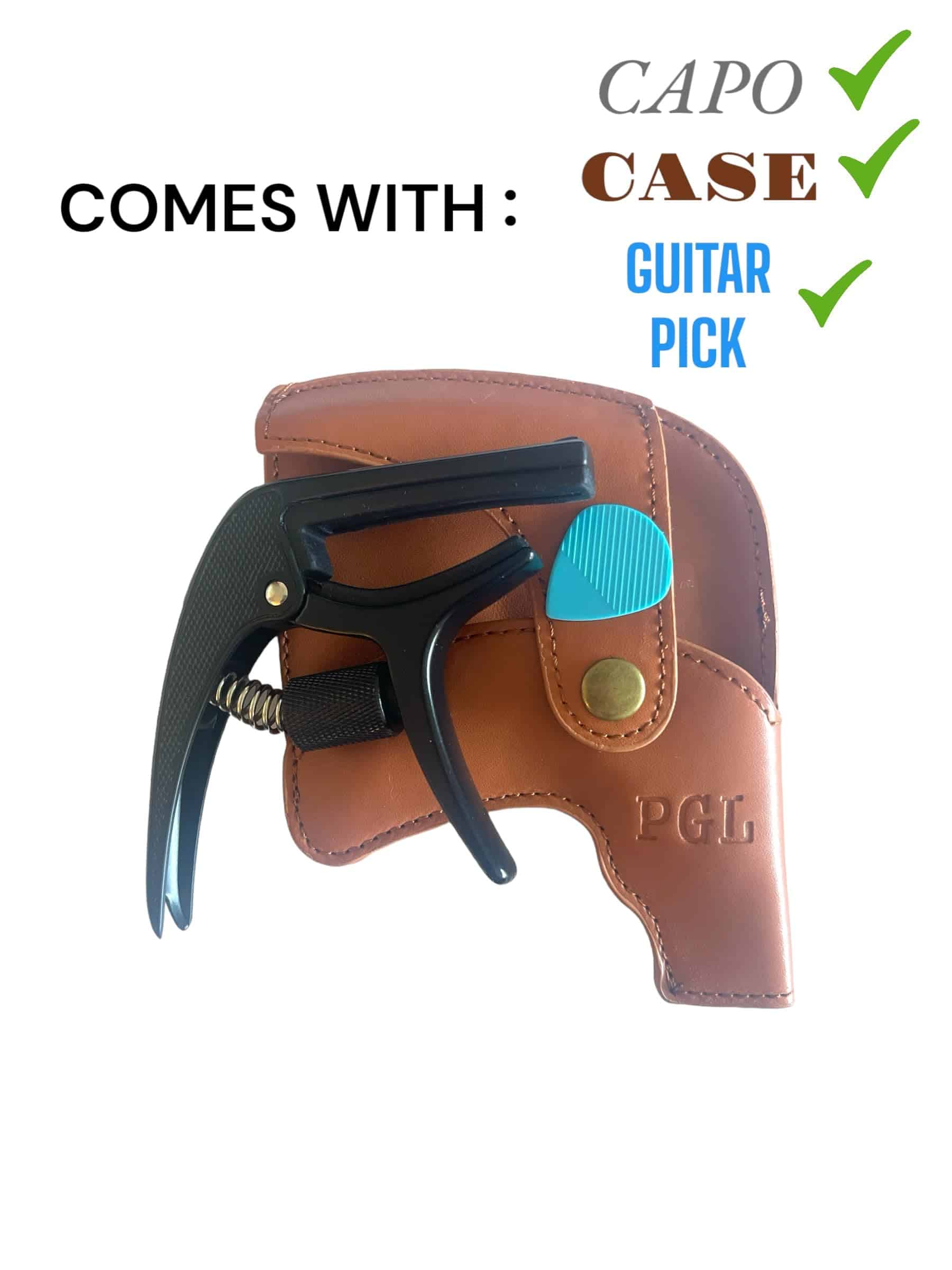 Capo de tensión ajustable PGL para guitarras acústicas y eléctricas. Cuenta con un agarre ergonómico texturizado, estuche de calidad, diseño de una mano, fabricado en zinc para garantizar durabilidad, libre de zumbidos molestos al utilizarlo, extractor de pasador de puente integrado, porta púas conveniente, y una púa texturizada incluida. Todo en un elegante color negro para complementar tu instrumento musical.