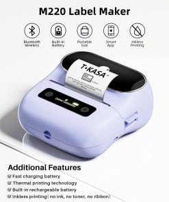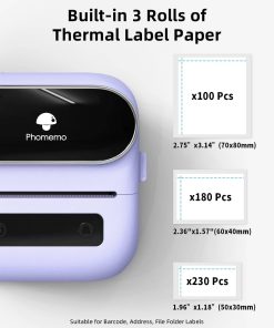 Impresora de etiquetas Phomemo, Impresora térmica Bluetooth para códigos de barras, dirección, hogar, correo, pequeñas empresas, ropa, Máquina portátil de etiquetado con 3 rollos de etiquetas Morado Nuestra impresora de etiquetas Phomemo M220 utiliza la última tecnología térmica para imprimir etiquetas sin necesidad de tinta, tóner o cinta. Solo necesita reabastecerse de etiquetas para seguir imprimiendo. La impresora de etiquetas térmicas viene con 3 rollos de etiquetas de diferente tamaño para sus necesidades de impresión. La aplicación Print Master desarrollada por el equipo de Phomemo proporciona una amplia gama de funciones incorporadas para mejorar su eficiencia en la impresión. Con un solo clic, puede incluir texto, imágenes, códigos de barras, códigos QR, OCR, formulario, cientos de iconos y plantillas predefinidas para uso doméstico y comercial. La impresora de etiquetas Phomemo M220 es compatible con teléfonos móviles IOS, y Android a través de la conexión Bluetooth, así como con la conexión USB para MAC y Windows 10. Asegúrese de seguir el tutorial de instalación del software para una mejor experiencia. La batería de 2200 mAh de la impresora de etiquetas Phomemo M220 ofrece hasta 36 rollos de impresión continua. También cuenta con un modo de suspensión automático que reduce el consumo de energía y extiende el tiempo de uso. La impresora de etiquetas Bluetooth M220 de 3.14 pulgadas tiene una amplia variedad de usos, desde etiquetar productos en pequeñas empresas como ropa, artesanías, joyas, hasta direcciones, códigos de barras, envíos, precios, fechas e ingredientes. Ahorre tiempo en la escritura manual de etiquetas y enfoque su atención en el crecimiento de sus negocios. Con la aplicación ‘Print Master’, puede comenzar a imprimir desde su teléfono o tableta a través de Bluetooth. Para imprimir desde una computadora portátil o PC, descargue el controlador M220 y la aplicación ‘Labelife’ desde el sitio web de Phomemo y conéctelo mediante el cable de datos USB.