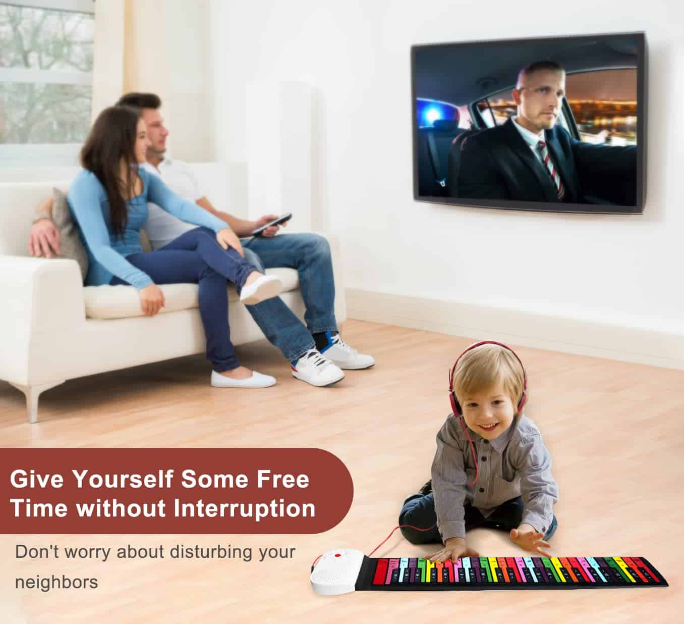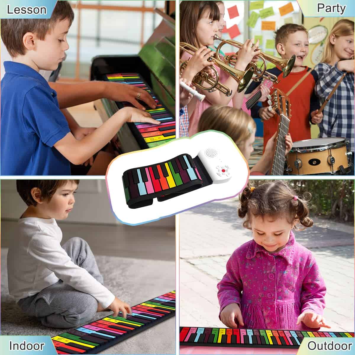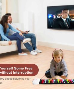 3. Toca en Cualquier Lugar: El teclado de piano para niños se puede tocar en cualquier superficie que desees, como una mesa, el suelo y la ventana. Ni siquiera tienes que abrirlo completamente para tocar. El piano flexible se puede enrollar a un tamaño pequeño en una bolsa pequeña para que lo guardes o lo lleves contigo. 6-8 horas de duración de la batería y altavoces potentes pueden evitar que seas molestado por cables, lo cual es adecuado para una fiesta familiar, fiesta de compañeros de clase, fiesta de cumpleaños. Simplemente tócalo para aumentar el ambiente feliz.