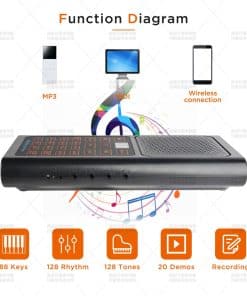 Piano electrónico de 61 teclas. 1. Teclado clásico de 61 teclas, el teclado de cuarta generación con una dinámica super fuerte y una sensación cómoda al tacto. 2. Procesador de configuración de alta gama, tres veces más rápido, música más estándar. 3. Altavoces duales actualizados incorporados, tonos suaves y excelentes. 4. Acompañamiento de Bluetooth se puede conectar. Canta mientras tocas, es más interesante. 5. 128 tonos incorporados. 6. 128 ritmos incorporados. 7. 20 demos incorporados, para aprender y escuchar clásicos. 8. Diseño de apariencia ligero y delgado, conciso y hermoso, con fácil portabilidad. 9. Disponible para conectar auriculares y altavoces externos. 10. Batería de litio incorporada, recargable, no necesita más pilas. 11. Puede conectarse a la computadora para editar la música que haces. 12. Viene con un altavoz de 2w. Protección del producto: función de protección de la batería de litio, cuando el voltaje es menor de 2.9V, la batería de litio activa la función de protección contra la sobre descarga. El rendimiento es que la máquina no se puede encender o se apagará automáticamente después de encenderse. Por favor, añade energía a tiempo.