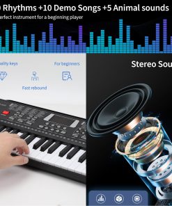 3. Piano de 61 teclas multifuncional El piano de teclado eléctrico está equipado con 61 teclas, una variedad de sonidos de instrumentos y una variedad de acompañamientos de percusión de batería, 6 canciones de demostración, 16 tonos de instrumentos, el piano eléctrico puede tocar múltiples notas de acordes, diferentes teclas inteligentes pueden lograr funciones como retardo, vibrato, grabación, programación y más.
