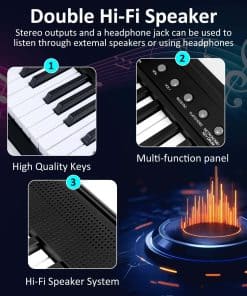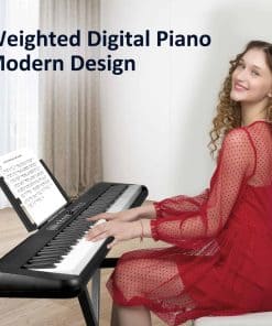Desata tu potencial creativo con una amplia gama de opciones de sonido, que abarcan 128 voces e instrumentos diferentes y ritmos. Esta versatilidad te permite explorar y experimentar con una variedad de estilos musicales. Sumérgete en el mundo de la música con 80 canciones demo incluidas, que sirven como un recurso valioso para la práctica y el rendimiento, enriqueciendo tu repertorio musical y proporcionando inspiración. Equipado con un teclado estándar sensible al tacto, este piano digital garantiza que experimentes la sensación genuina y la respuesta de un piano tradicional, adaptándose a personas de todos los niveles de habilidad. Disfruta de la comodidad de la funcionalidad Bluetooth, que permite conexiones sin esfuerzo con otros dispositivos. Esta característica amplía tus horizontes creativos, facilitando la colaboración y la exploración musical. Con el Estuche de Transporte incluido, puedes llevar tu música a donde vayas, permitiéndote tocar tus melodías favoritas donde la inspiración golpee. El Soporte y los Auriculares facilitan la práctica y el rendimiento sin limitaciones, asegurando que tu música te acompañe en tu viaje artístico.