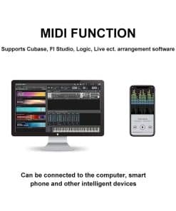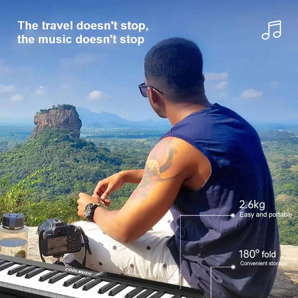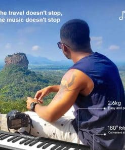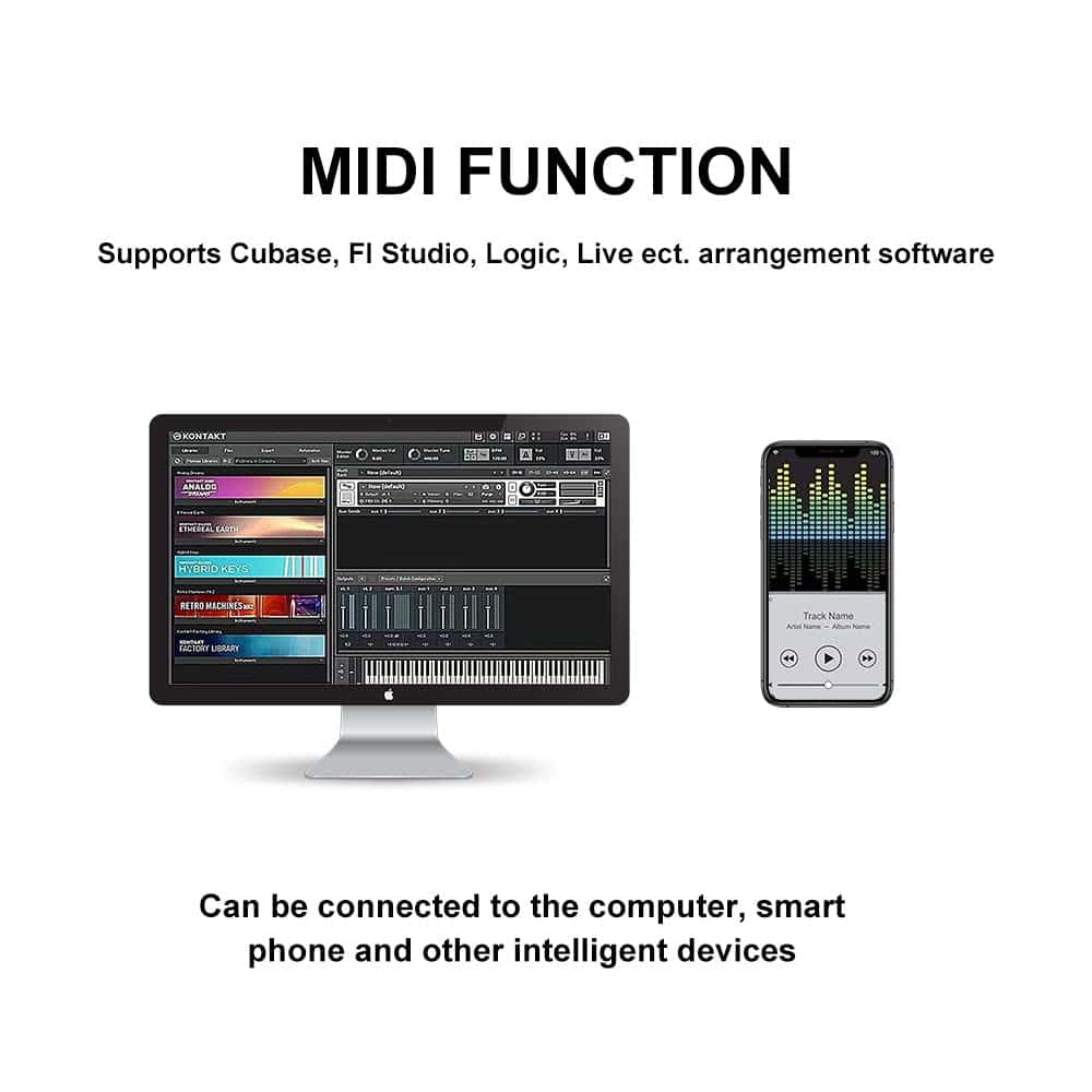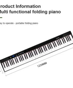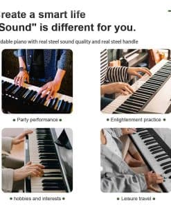 1. Piano Eléctrico Portátil. 2. TERMINAL MIDI: La función MIDI te permite conectar la computadora, teléfono inteligente y otros dispositivos inteligentes para componer música. Puedes usar el cable micro USB para conectar la computadora, teléfono inteligente y otros dispositivos inteligentes. 3. MÚLTIPLES MODOS DE ALIMENTACIÓN: Diseñado con tres modos de fuente de alimentación de adaptador de corriente, puerto USB, batería de litio integrada. Después de una carga completa, puedes usarlo de forma continua durante 4 horas. Usarlo por mucho tiempo te evitará preocuparte por la batería cuando lo saques a espectáculos. 4. FUNCIONES DE BOTÓN RICAS: Metrónomo/Grabar/Sustain/Kit de batería/Tmepo+-/Transpose+-/Acorde/Vibrato/Dinámica y más. Las funciones ricas te sumergen en el mundo de la música. Además, 128 ritmos, 128 tonos y 30 demos hacen que tocar sea más fascinante. 5. TECLAS ESTÁNDAR DE TAMAÑO COMPLETO: 88 teclas de tamaño completo sensibles al tacto elaboradas exquisitamente según la proporción 1:1 de teclas de piano, diseño profesional de teclado, teclas de fuerza, que mejoran la sensación al tocar y la práctica de digitación.