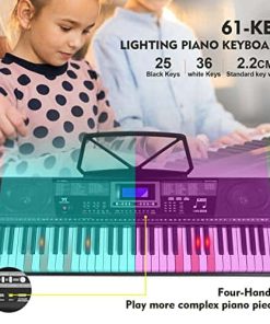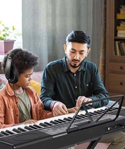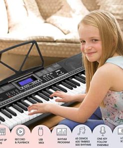 El teclado de piano de aprendizaje de 61 teclas MUSTAR MEKS-500 está diseñado especialmente con la función de teclas iluminadas y 3 modos de enseñanza inteligente. Modo de una tecla, Modo de seguimiento y Modo de conjunto, perfecto para principiantes para comenzar rápidamente y mejorar su habilidad interpretativa. Las mejores opciones de regalos de cumpleaños para niños, amigos y familiares. Adopta DREAM Source: el teclado de piano de aprendizaje MUSTAR cuenta con 65 canciones demo, 600 tonos, 500 ritmos preestablecidos y 2 altavoces estéreo integrados para brindarte una auténtica experiencia de piano. Adopta fuente de sonido DREAM y pedal de sustain para que la calidad del sonido sea más realista y rica. Conexiones de dispositivos: con USB MIDI, el teclado de piano eléctrico se puede conectar al teléfono inteligente/computadora para descargar aplicaciones para una enseñanza o interpretación más conveniente. Este teclado de piano también permite tocar acordes de bajo automático con un solo dedo y con dedos, con la capacidad de seleccionar timbres de acordes, programar/editar ritmos, y utilizar efectos como transposición, afinación, vibrato, sustain & conjunto. Modo de voz dual: permite combinar dos voces juntas, por ejemplo, piano y batería, el teclado de piano MUSTAR ofrecerá una experiencia de juego rica. El modo de teclado doble dividirá el teclado en dos partes que te permitirán tocar diferentes sonidos de instrumentos o grados de timbre al mismo tiempo. El teclado de aprendizaje MUSTAR está recién diseñado con dos métodos de suministro de energía (adaptador y batería), ya sea que estés practicando en casa o de fiesta al aire libre, puedes tocar el piano en cualquier momento y lugar. El kit de piano súper valor incluye teclado ligero, atril de música, pedal de sustain, soporte de piano, auriculares, micrófono, adaptador de corriente y cables OTG USB.