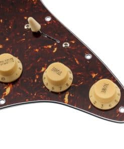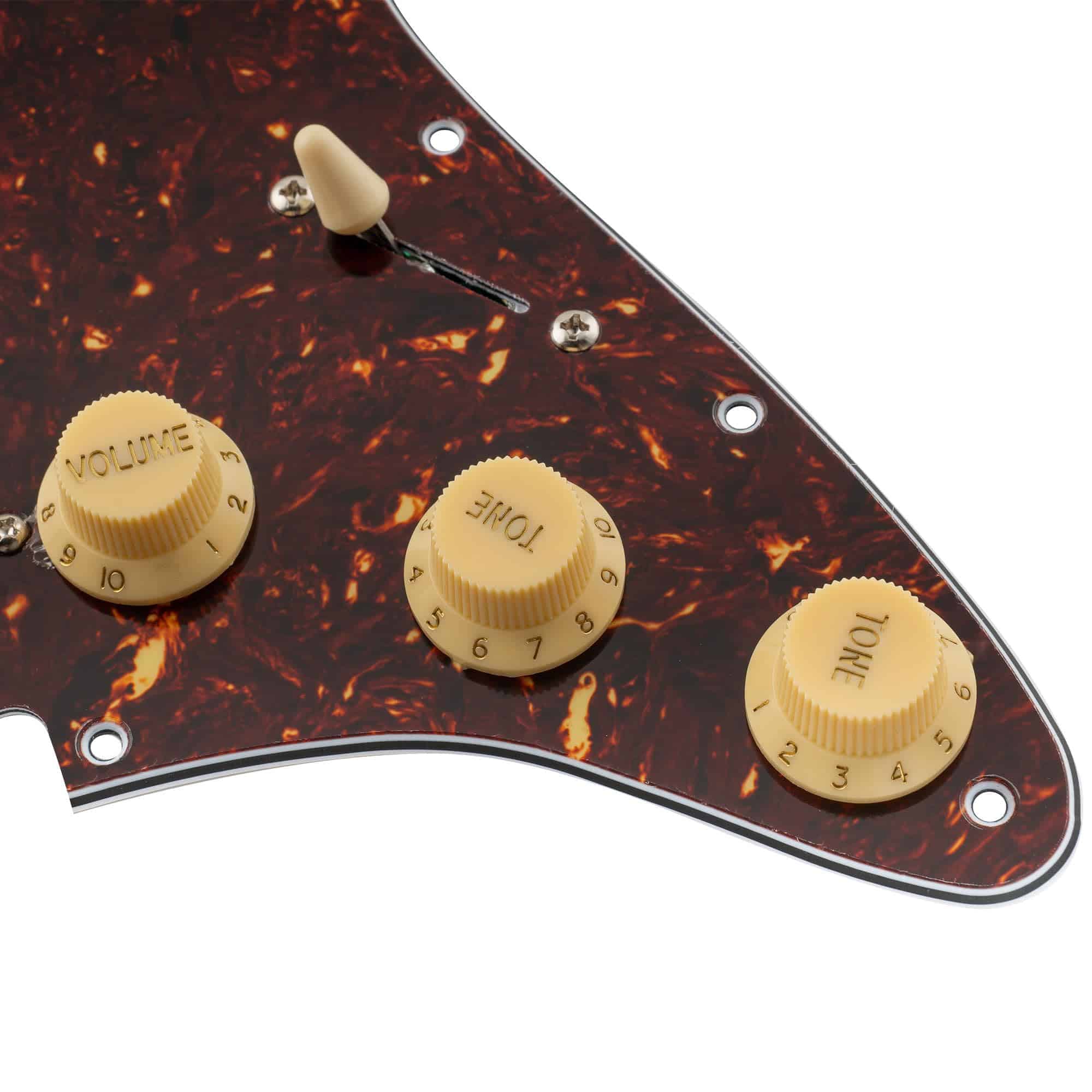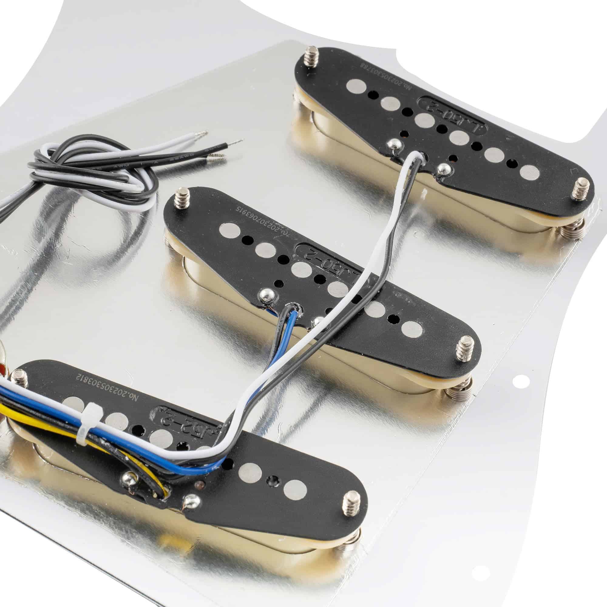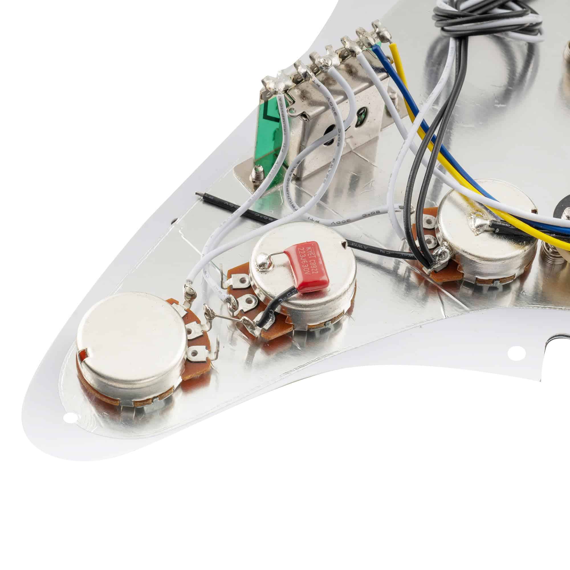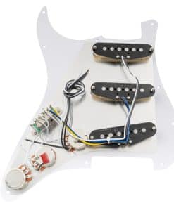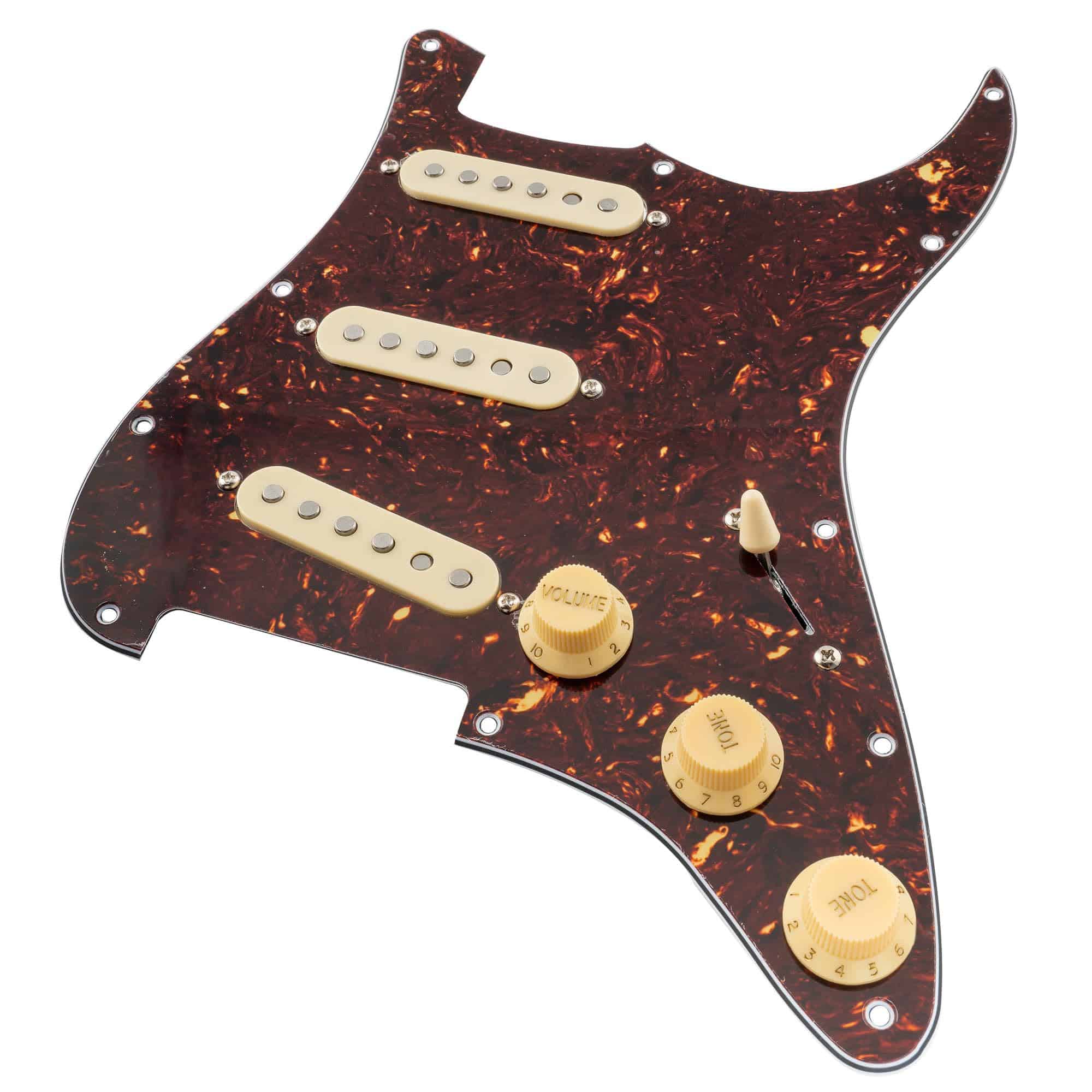 Buena opción para mejorar la Squier Strat SSS u otra guitarra de importación de estilo similar, también se adapta a la mayoría de las guitarras eléctricas estilo Strat SSS modernas estándar americanas/mexicanas, lleva tu tono al siguiente nivel. Cuenta con pastillas de bobina simple con imanes de Alnico 5 escalonados (5,8K/5,8K/7,2K), tonos de estilo vintage, es similar a las pastillas F Custom 69 Strat, postes escalonados para una salida equilibrada, pastilla central de polaridad invertida (RWRP) para cancelación de ruido, produce agudos claros y graves profundos y resonantes, funciona especialmente bien con pedales permitiendo que los graves retumben y los agudos se eleven. Recomendado para Blues, Rock, Classic Rock. Construido a mano en casa con piezas seleccionadas, se enfoca en cada detalle durante el cableado, pruebas adecuadas realizadas por técnicos experimentados. Viene con la guía del usuario que incluye un diagrama de cableado profesional para resolver tu problema de cableado. El paquete incluye: 1 pickguard precableado. Pastillas (Cuello/Centro/Puente): Resistencia de 5,8K/5,8K/7,2K, Imán: Alnico 5, Espaciado de poste: 50mm/50mm/52mm; Potes: A250K(T) x 2 + B250K(V); Interruptor de 5 vías de estilo de importación; Capacitor de .022 F; Cables de PVC.