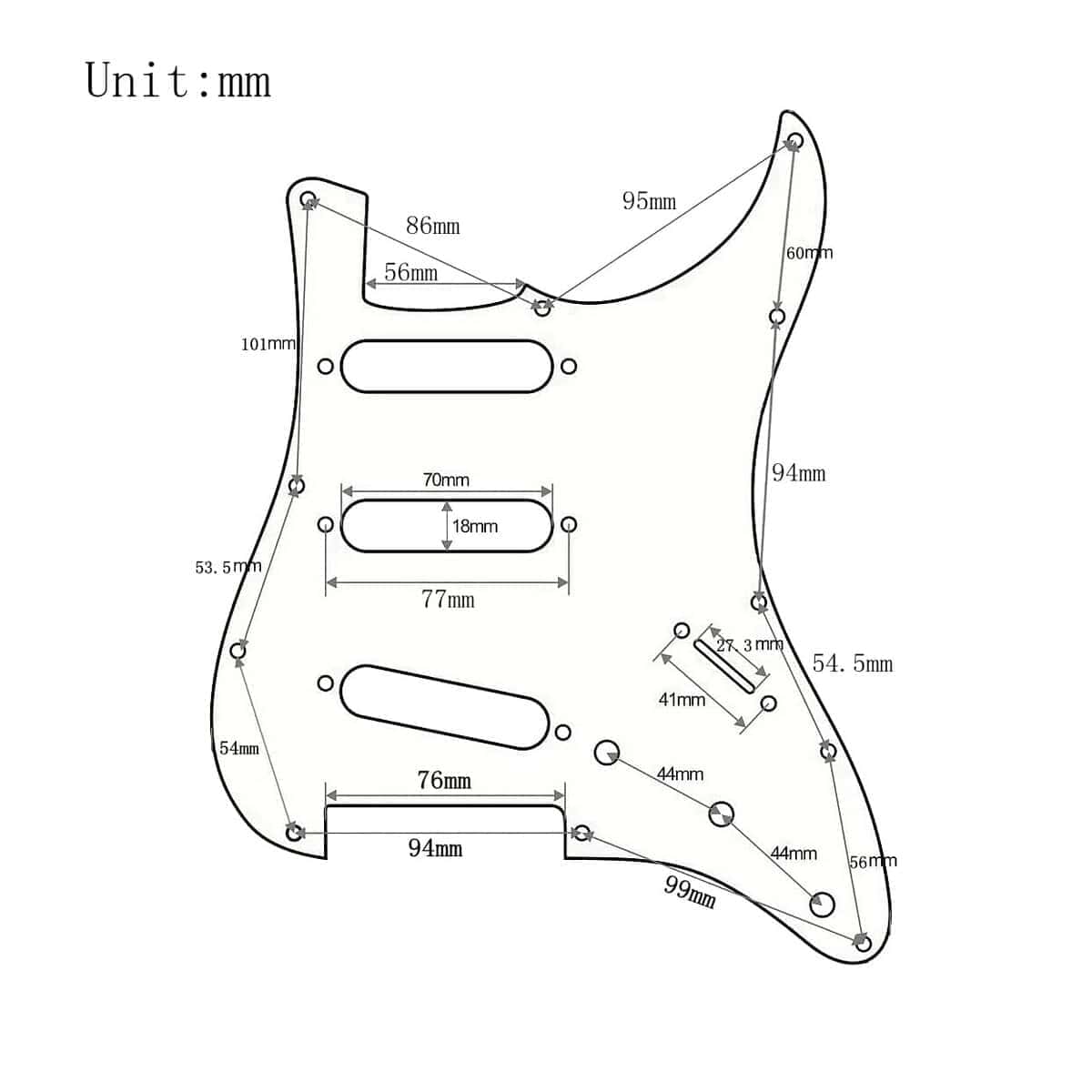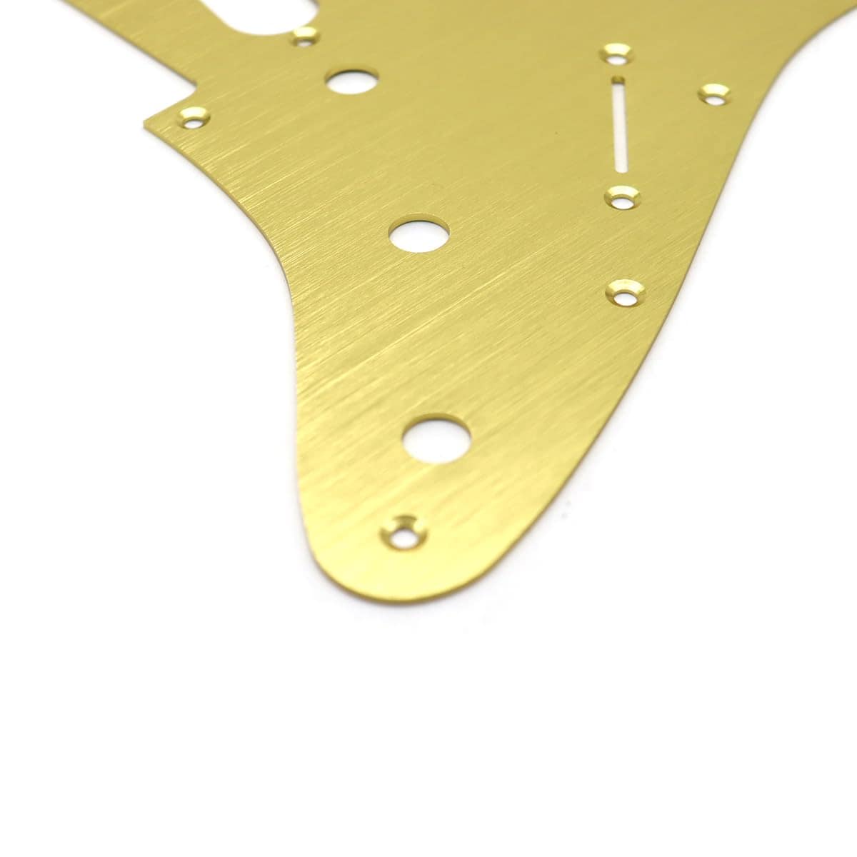11 agujeros de tornillo en el lateral del pickguard. Material: Metal/Aluminio. Apto para la mayoría (NO todos) con tres pastillas de bobina simple, es posible que necesites una pequeña modificación si utilizas guitarras de otros modelos.