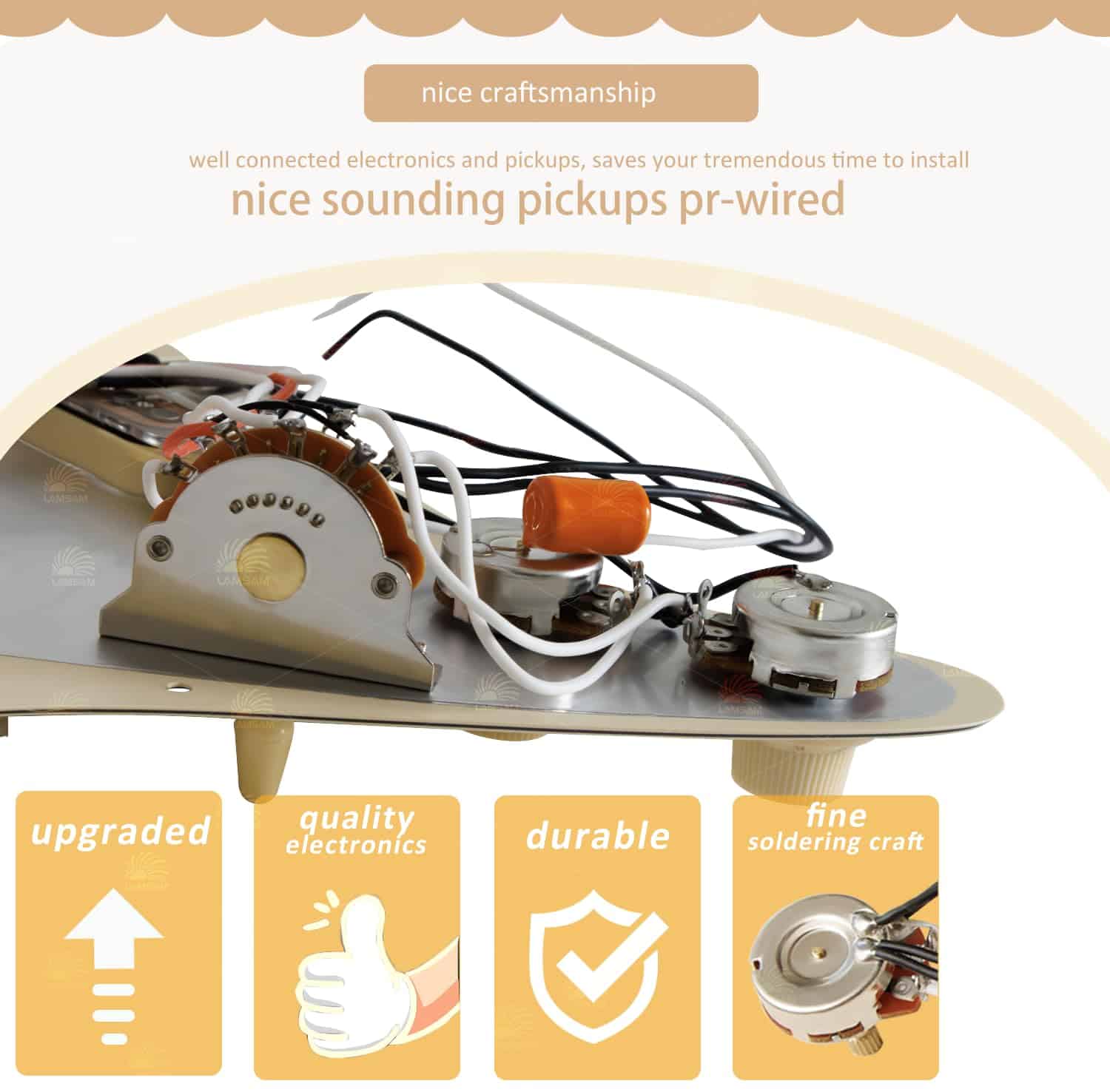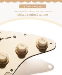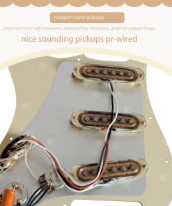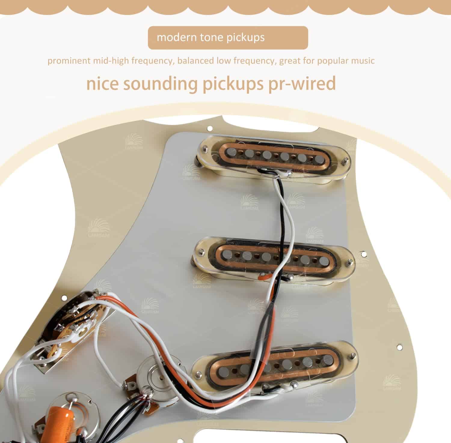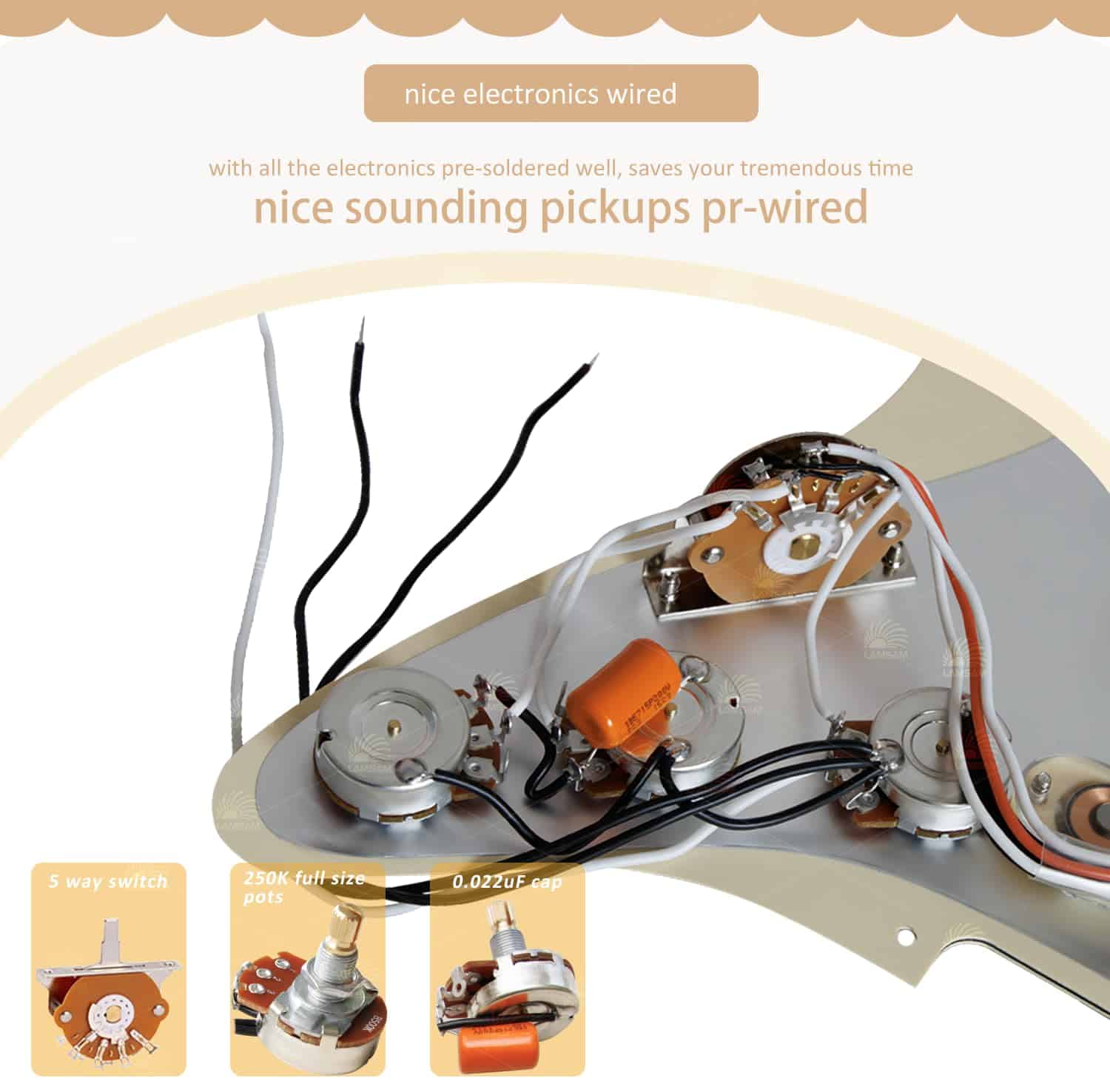 Pickguard de guitarra eléctrica de 6 cuerdas pre-cableado LAMSAM cargado con pastillas single coil de tono moderno SSS Alnico 5 con controles de volumen y tono, interruptor de 5 posiciones, placa posterior incluida en color crema. Las pastillas y controles (interruptor de 5 posiciones, 1 potenciómetro de volumen y 2 de tono) están completamente cableados a la placa. Mínima soldadura: simplemente conecte 2 cables negros a tierra y el cable blanco al jack de salida. Interruptor de pastillas de 5 posiciones; potenciómetros de tamaño completo A250/B250k – eje dividido de bronce; capacitancia naranja 0.022uf, 600V. Compatible con guitarras eléctricas con 11 agujeros de montaje, configuración estándar de pastillas single coil-single coil-single coil; pickguard de 3 capas con gran blindaje trasero, consulte las especificaciones en la galería de fotos. Incluido 1 x pickguard de guitarra eléctrica de 6 cuerdas pre-cableado, 1 x placa posterior, 17 x tornillos de montaje, 1 x diagrama de cableado.