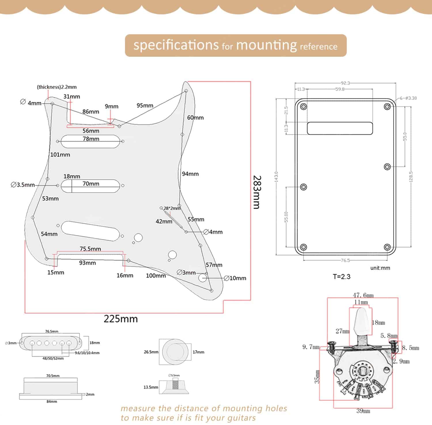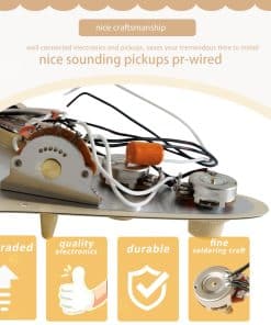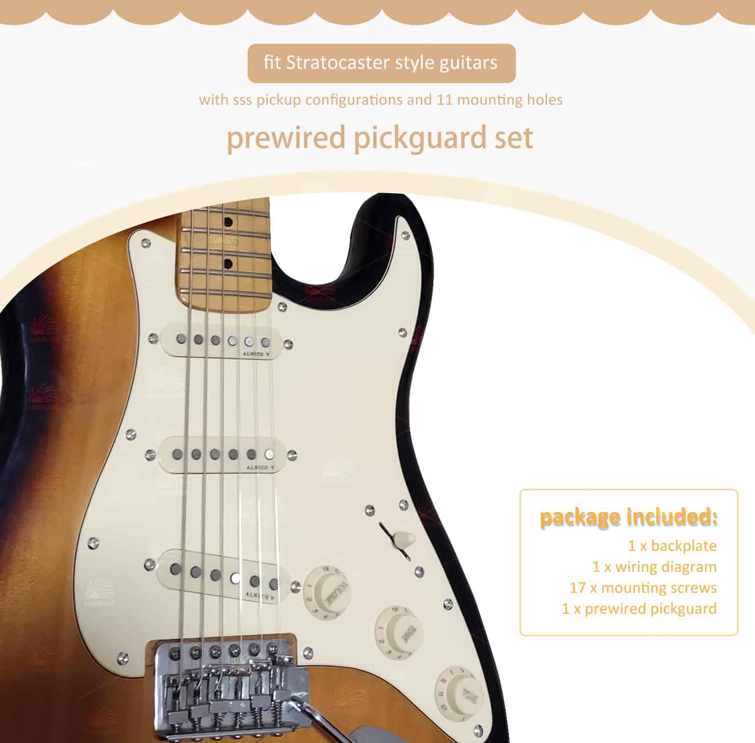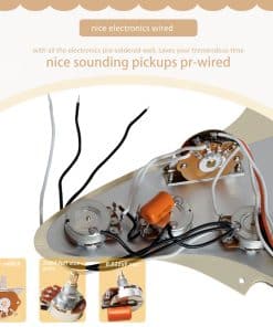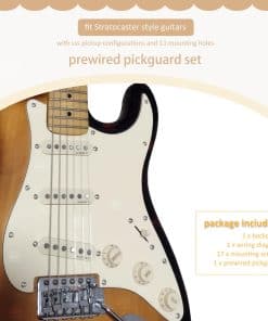 Pickguard de guitarra eléctrica de 6 cuerdas pre-cableado LAMSAM cargado con pastillas single coil de tono moderno SSS Alnico 5 con controles de volumen y tono, interruptor de 5 posiciones, placa posterior incluida en color crema. Las pastillas y controles (interruptor de 5 posiciones, 1 potenciómetro de volumen y 2 de tono) están completamente cableados a la placa. Mínima soldadura: simplemente conecte 2 cables negros a tierra y el cable blanco al jack de salida. Interruptor de pastillas de 5 posiciones; potenciómetros de tamaño completo A250/B250k – eje dividido de bronce; capacitancia naranja 0.022uf, 600V. Compatible con guitarras eléctricas con 11 agujeros de montaje, configuración estándar de pastillas single coil-single coil-single coil; pickguard de 3 capas con gran blindaje trasero, consulte las especificaciones en la galería de fotos. Incluido 1 x pickguard de guitarra eléctrica de 6 cuerdas pre-cableado, 1 x placa posterior, 17 x tornillos de montaje, 1 x diagrama de cableado.