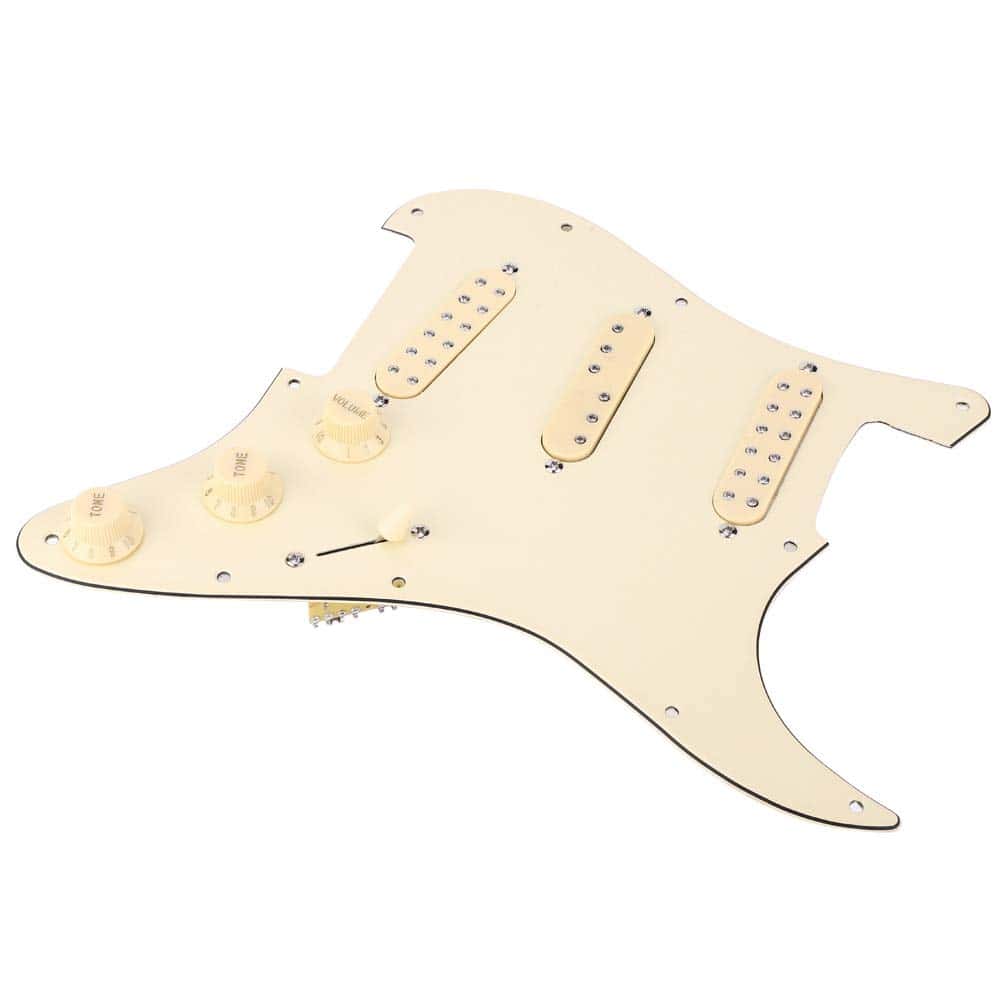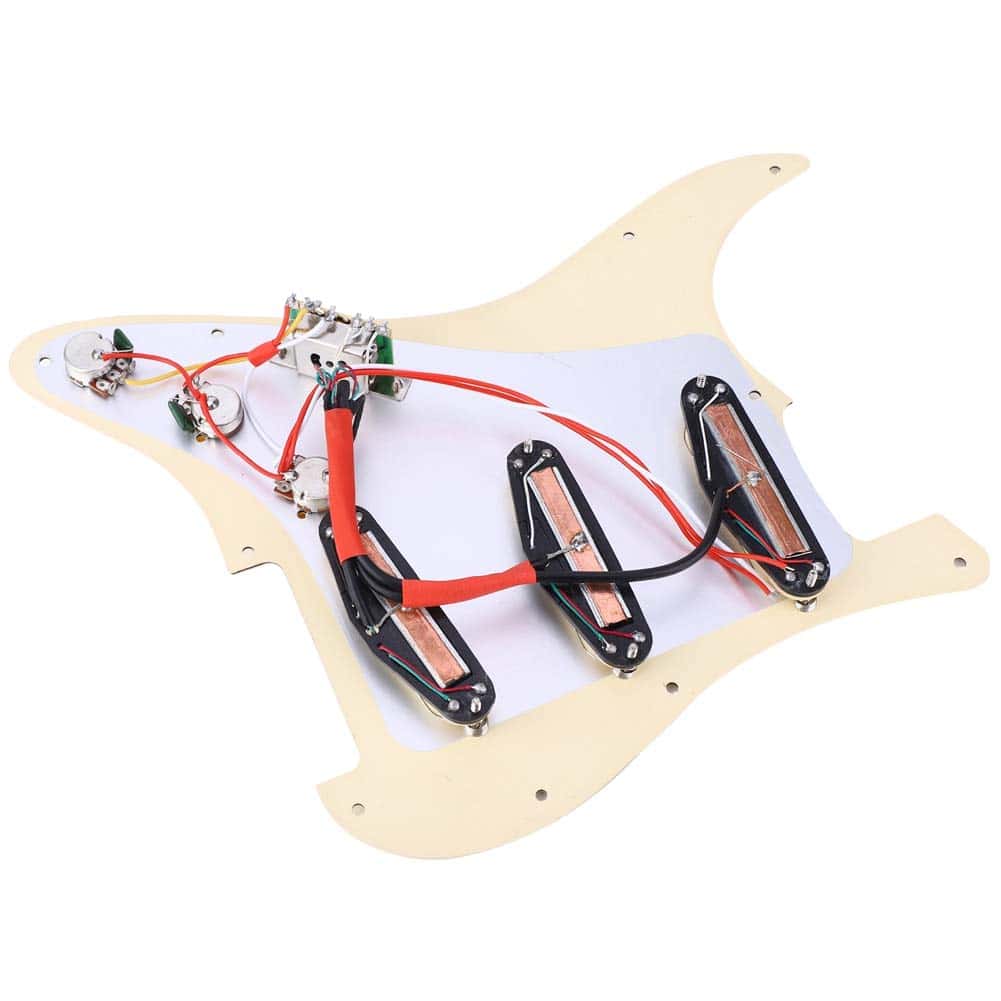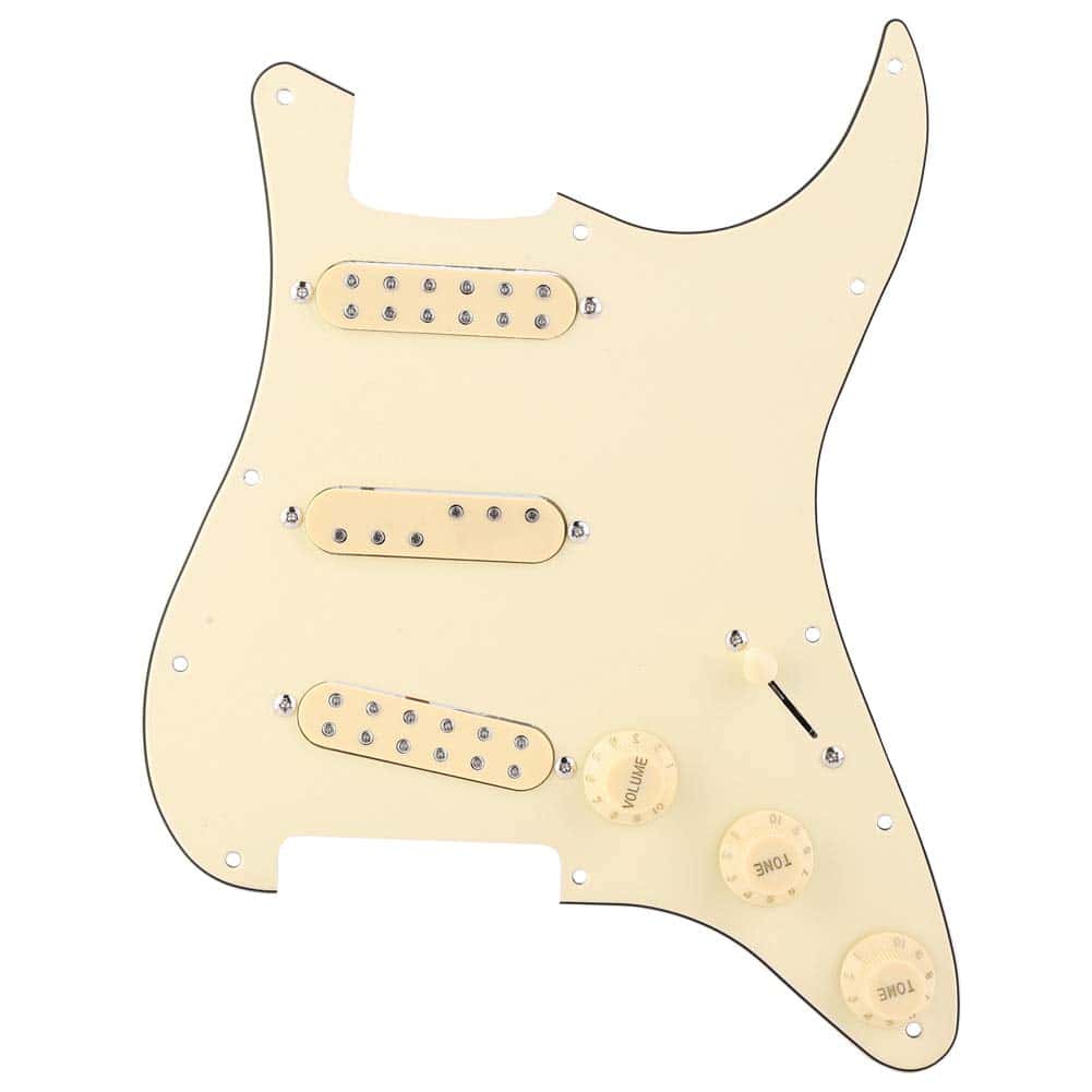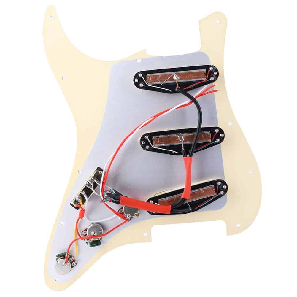 El pickguard de guitarra tiene tres pastillas dobles para producir un sonido clásico y hermoso. El panel está hecho de 3 capas de PVC, que pueden proteger mejor tu guitarra. El interruptor es un interruptor de cinco vías, el cableado es un control de volumen y dos controles de tono. Todo lo que tienes que hacer es soldar el socket de entrada y estar listo para tocar. Hecho de material de metal y plástico de alta calidad, resistente, duradero y con una larga vida útil.