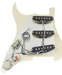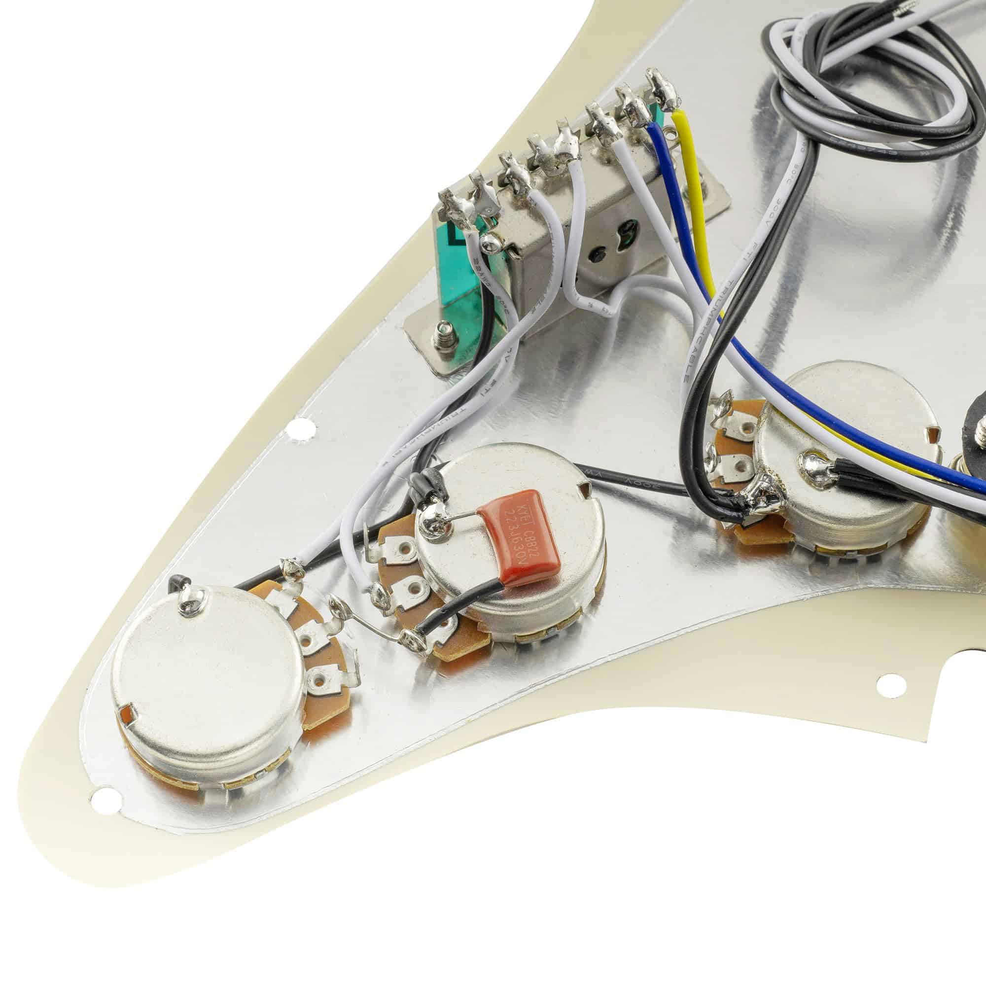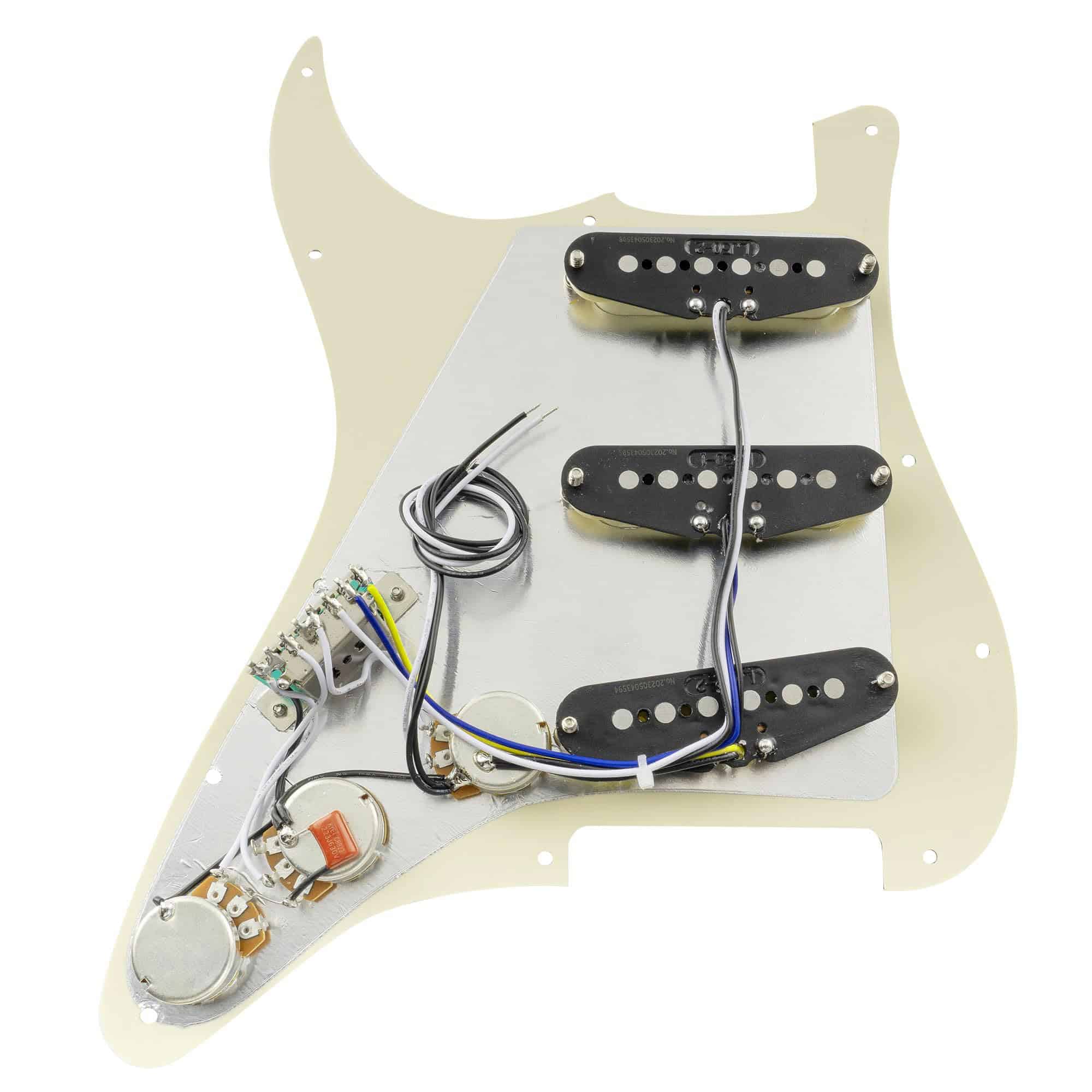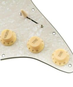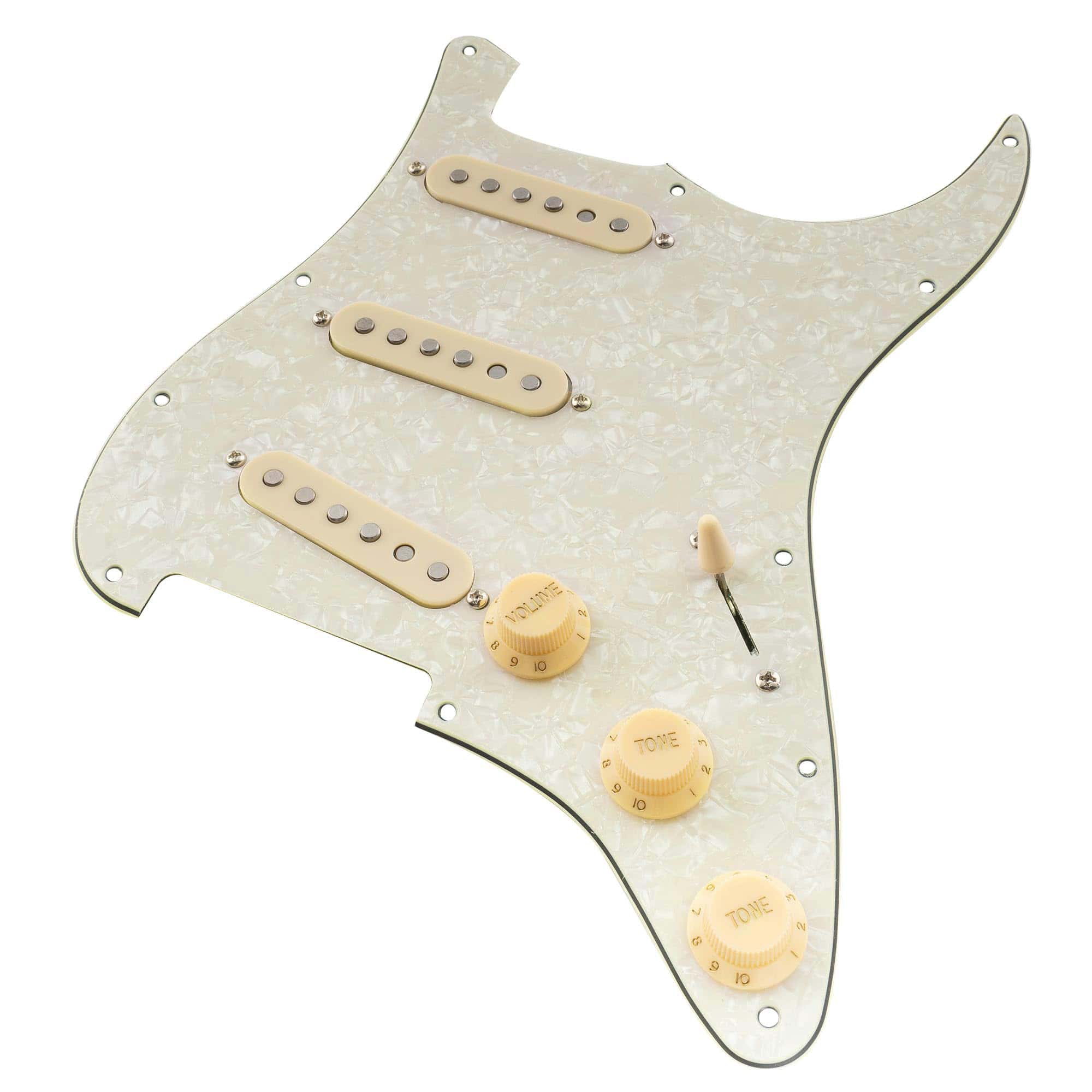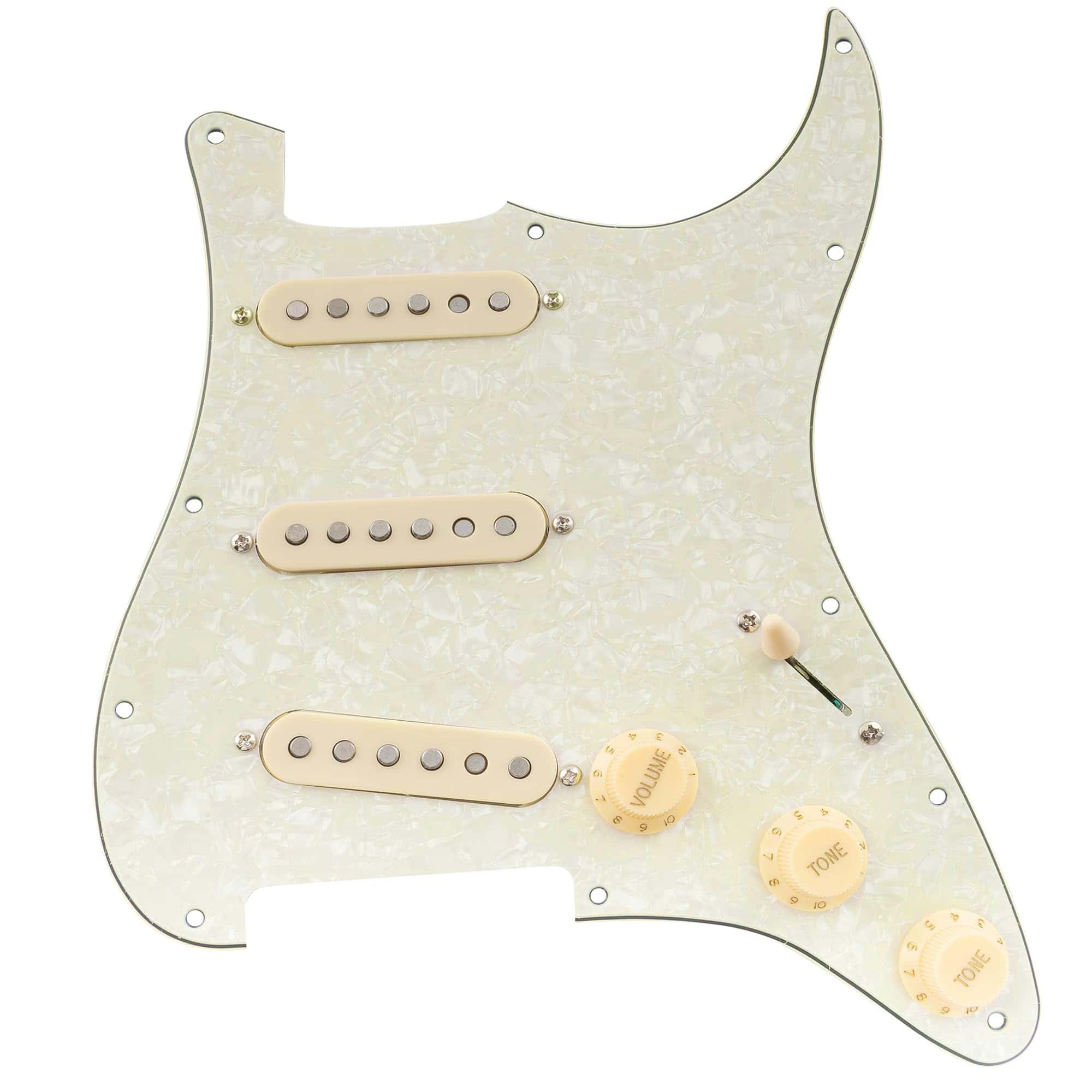 El pickguard pre-cableado Musiclily Pro SE estándar SSS con pastillas de bobina simple de imán Alnico 5 escalonado para guitarra eléctrica estilo ST, 4 capas de perla blanca envejecida es una excelente elección para mejorar la Squier Strat SSS u otra guitarra de importación de estilo similar, también compatible con la mayoría de las guitarras eléctricas estilo Strat SSS modernas estándar americanas/mexicanas, lleva tu tono al siguiente nivel. Cuenta con pastillas de bobina simple con polos escalonados de imán Alnico 5 (5.8K/5.8K/7.2K), tonos de estilo vintage, similar a las pastillas Strat de Frankenstein Custom 69, polos escalonados para una salida equilibrada, pastilla central con polaridad inversa y reversa (RWRP) para cancelación de ruido, produce agudos claros y transparentes y graves contundentes, funciona especialmente bien con pedales permitiendo que los graves resuenen y los agudos se eleven. Recomendado para Blues, Rock, Classic Rock. Construido a mano en nuestra casa con piezas seleccionadas, nos enfocamos en cada detalle durante el cableado, pruebas adecuadas realizadas por técnicos experimentados. Viene con una guía del usuario que incluye un diagrama de cableado profesional para resolver tus problemas de cableado. El paquete incluye: 1 pickguard pre-cableado. Pastillas (Mástil/Medio/Puente): Resistencia de 5.8K/5.8K/7.2K, Imán: Alnico 5, Espaciado de polos: 50mm/50mm/52mm; Potenciómetros: A250K(T) x 2 + B250K(V); Interruptor de 5 posiciones de estilo de importación; Condensador de .022 F; Cables de PVC.