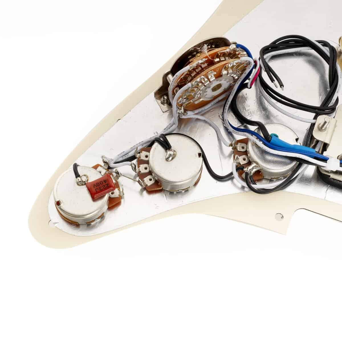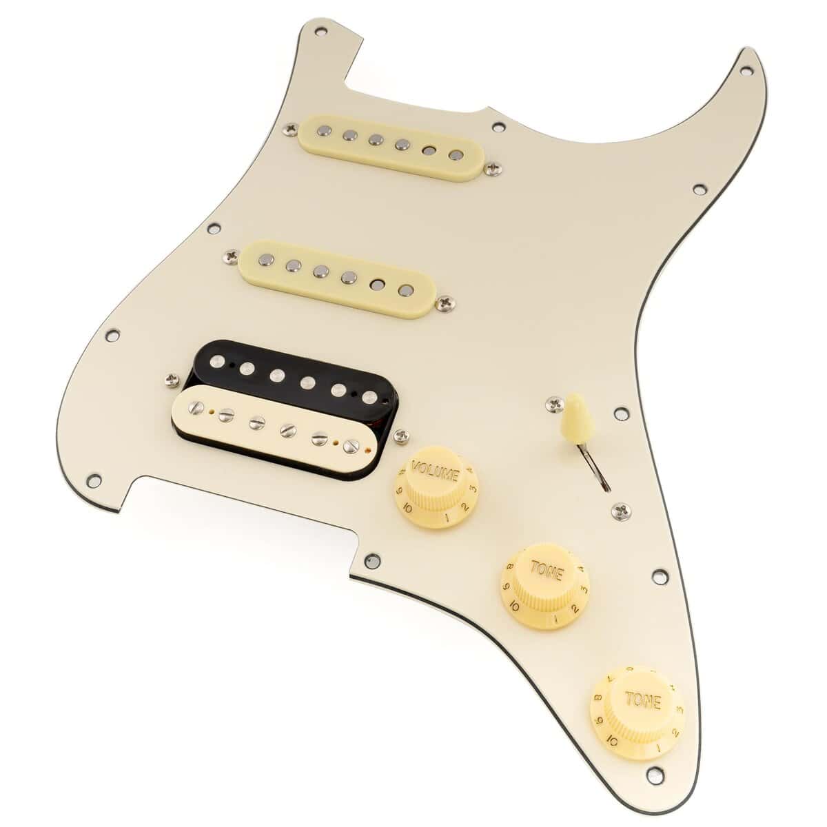 Buena elección para actualizar Squier Strat HSS u otra guitarra de estilo importado similar, también se adapta a la mayoría de las guitarras eléctricas estilo Strat HSS modernas estándar americanas/mexicanas, lleva tu tono al siguiente nivel. El interruptor súper de 5 vías ofrece más opciones de tono único. Características pastillas de cuello/medio de magnetos de Alnico 5 con piezas polares escalonadas, tonos de estilo vintage, similar al F Custom 69 Strat pickups, piezas polares escalonadas para una salida equilibrada, pastilla media inversa enrollada y polaridad inversa para cancelación de ruido, funciona especialmente bien con pedales. Humbucker descubierto de puente 8.8K, con magnetos de Alnico 5. Construido a mano en nuestra casa con partes seleccionadas, enfocándonos en cada detalle durante el cableado, pruebas adecuadas realizadas por técnicos experimentados. Viene con la guía del usuario que tiene un diagrama de cableado profesional para resolver tu problema de cableado. El paquete incluye: 1 pickguard pre-cableado. Pastillas (Cuello/Medio/Puente): Resistencia de 5.6K/5.6K/8.8K, tolerancia de 0.5K/0.5K/1K, Imán: Alnico 5, Espaciado de las piezas polares: 50mm/50mm/52mm; Potenciómetros: A250K(T) x 2 + B250K(V); Interruptor súper de 5 vías; Capacitor .022uF; Cables de PVC.