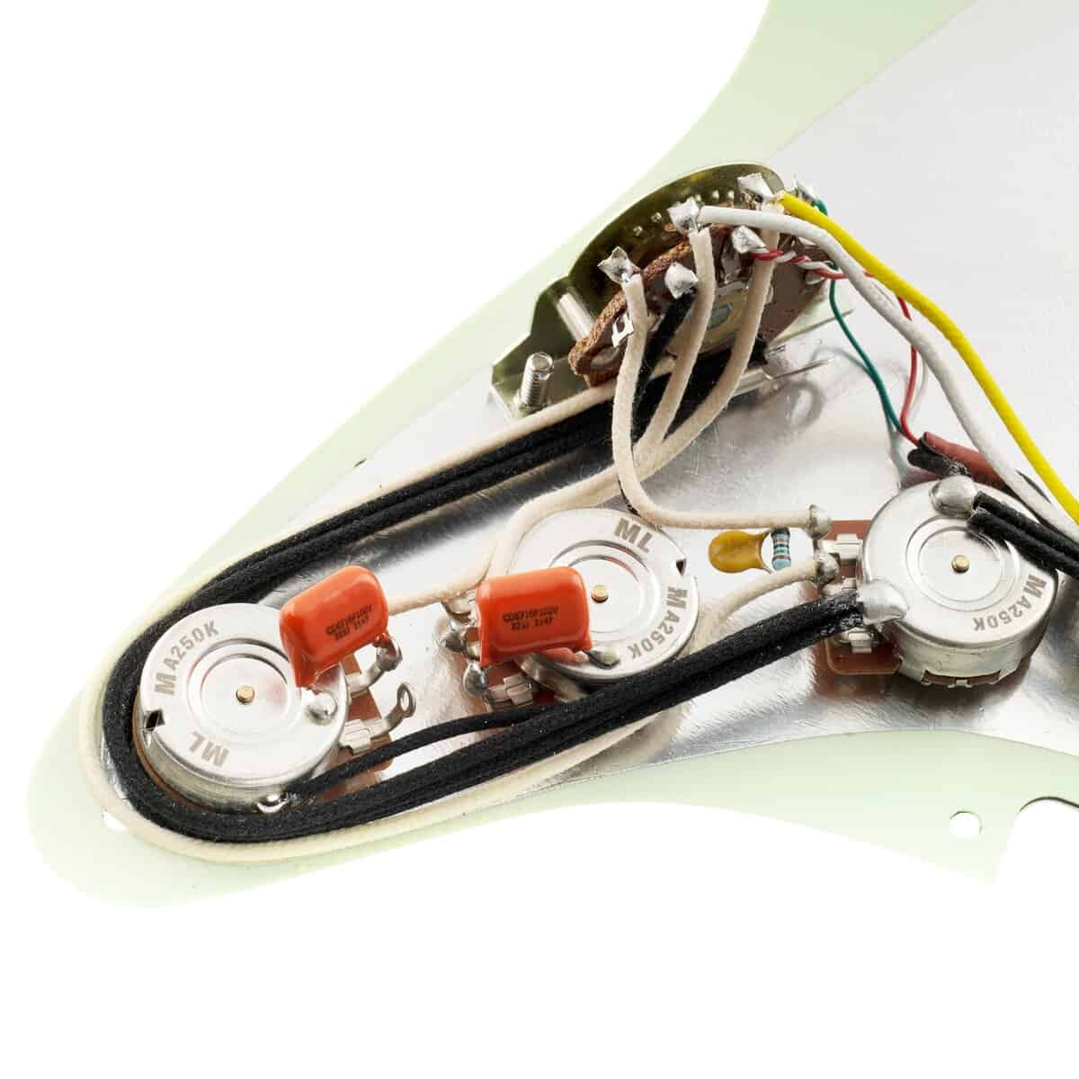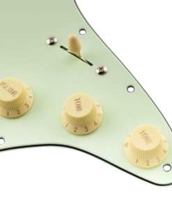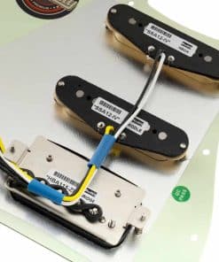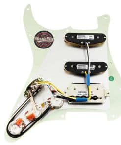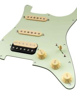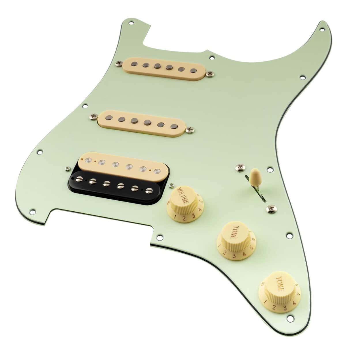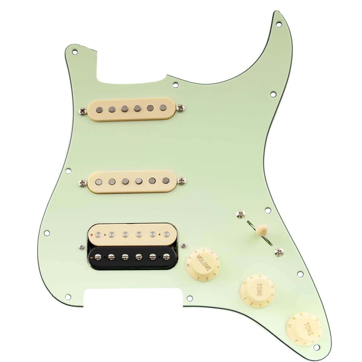 Pickguard precableado Musiclily Pro Auto-Split HSS with Artec Pickups Alnico 5 Magnet for ST Style Electric Guitar, 3Ply Mint Green. Pickguard montado a mano por técnicos experimentados en casa, con pastillas Artec con imán de Alnico 5. Incluye guía de usuario con diagrama de cableado profesional para resolver problemas de conexión. Paquete que incluye: 1 pickguard precableado. Pastillas Artec (Neck/Middle/Bridge): Resistencia de 6.3K/6.5K/16.8K, Imán: Alnico 5; Espaciado de polos: 50mm/52mm/52.5mm; Pots: Eje completo de latón estriado serie HD A250K x 3; Interruptor de 5 vías de alta resistencia de estilo de importación coreana y jack de salida; Condensador Orange Drop .022 F x 2 y Mod de Atenuación de Agudos; Cableado de estilo vintage de empuje hacia atrás.