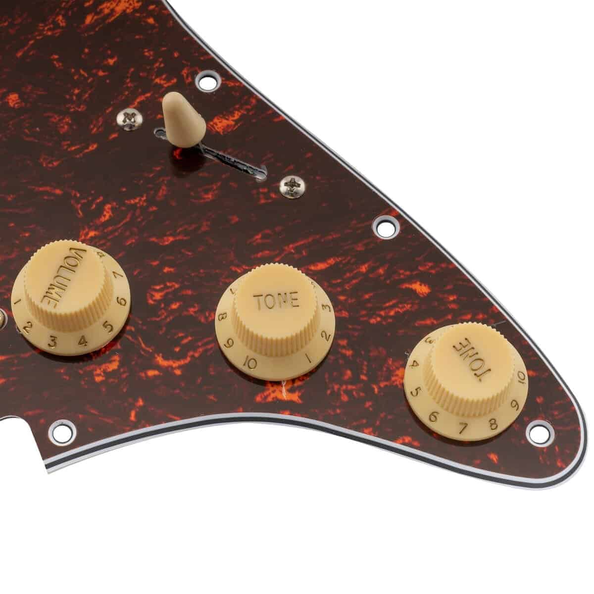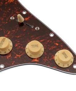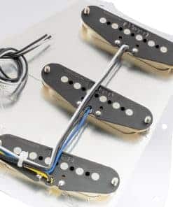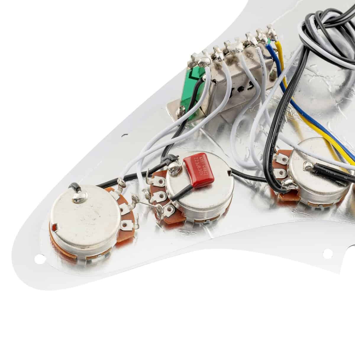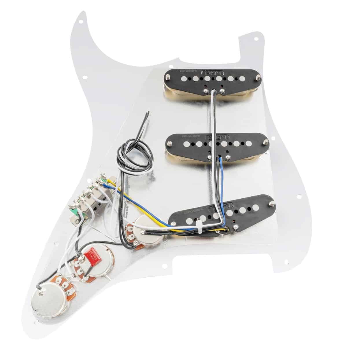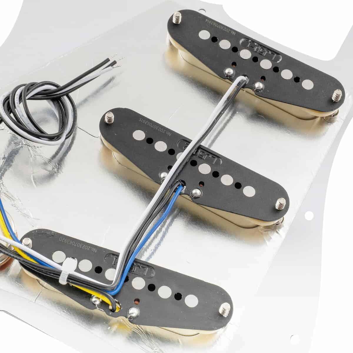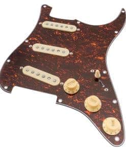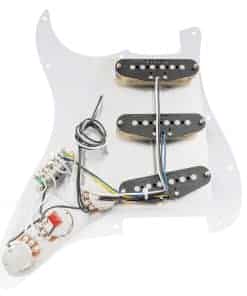 Buena elección para mejorar Squier Strat SSS u otra guitarra de importación similar, también se adapta a la mayoría de las guitarras eléctricas Strat SSS americanas/mexicanas estándar modernas, lleva tu tono al siguiente nivel. Cuenta con pastillas de bobina simple Alnico 5 escalonadas (5.8K/5.8K/7.2K) con polos magnéticos vintage, tonos de estilo vintage, similar a las pastillas F Custom 69 Strat, polos escalonados para una salida equilibrada, pastilla central con devanado y polaridad invertidos (RWRP) para cancelación de zumbidos, produce agudos claros y graves contundentes, funciona especialmente bien con pedales permitiendo que los graves retumben y los agudos se eleven. Recomendado para Blues, Rock, Classic Rock. Construido a mano en nuestra casa con piezas seleccionadas, centrado en cada detalle durante el cableado, prueba adecuada por técnicos experimentados. Viene con la guía del usuario que tiene un diagrama de cableado profesional para resolver tu problema de cableado. Incluye: 1 pickguard precableado. Pastillas (Mástil/Medio/Puente): Resistencia 5.8K/5.8K/7.2K, Imán: Alnico 5, Espaciado de polos: 50mm/50mm/52mm; Potenciómetros: A250K(T) x 2 + B250K(V); Interruptor de 5 posiciones de estilo importado; Condensador de .022 F; Cables de PVC