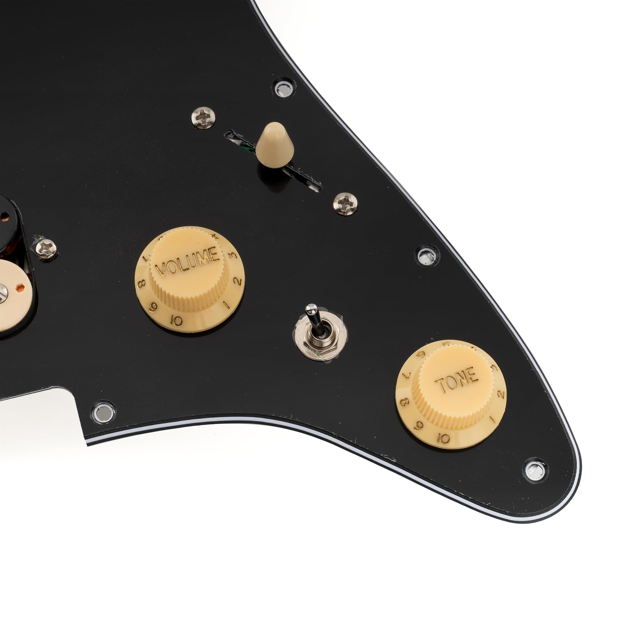 Pickguard precableado Musiclily Pro ST-HH-OMHA Standard HH con Humbuckers de Alnico 5 e Interruptor Mini para Guitarra Eléctrica Estilo ST, 3 capas Negras con Pastilla Zebra. Humbucker sin cubierta, con imanes Alnico 5, alto rendimiento, sonido grueso y completo, produce un extremo bajo apretado y articulado y un potente extremo alto, ideal para rock, metal y otros estilos de música moderna. Construido a mano en la casa con piezas seleccionadas, se enfoca en cada detalle durante el cableado, pruebas adecuadas por técnicos experimentados. Viene con la guía del usuario que tiene diagramas de cableado profesionales para resolver tu problema de cableado. Paquete incluye: 1 pieza de pickguard precableado. Pastillas (Puente/Mástil): Resistencia de 7.5K/16K, tolerancia: 1K, Imán: Alnico 5, Espaciado de polos: 50mm/52mm; Potes: A500K(T) + B500K(V); Interruptor estilo importación de 3 vías y mini interruptor; condensador .047uf; Cables de PVC.