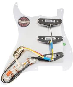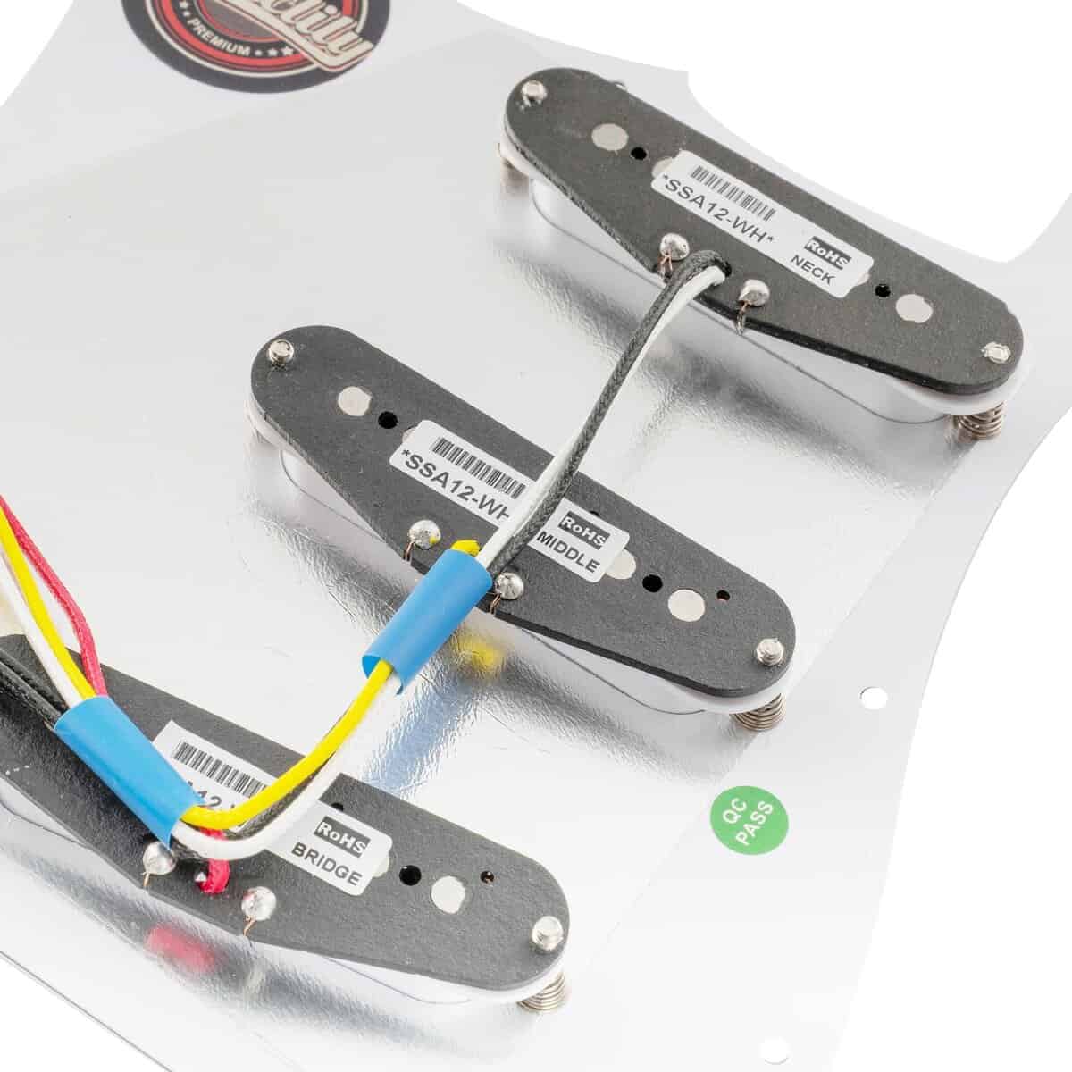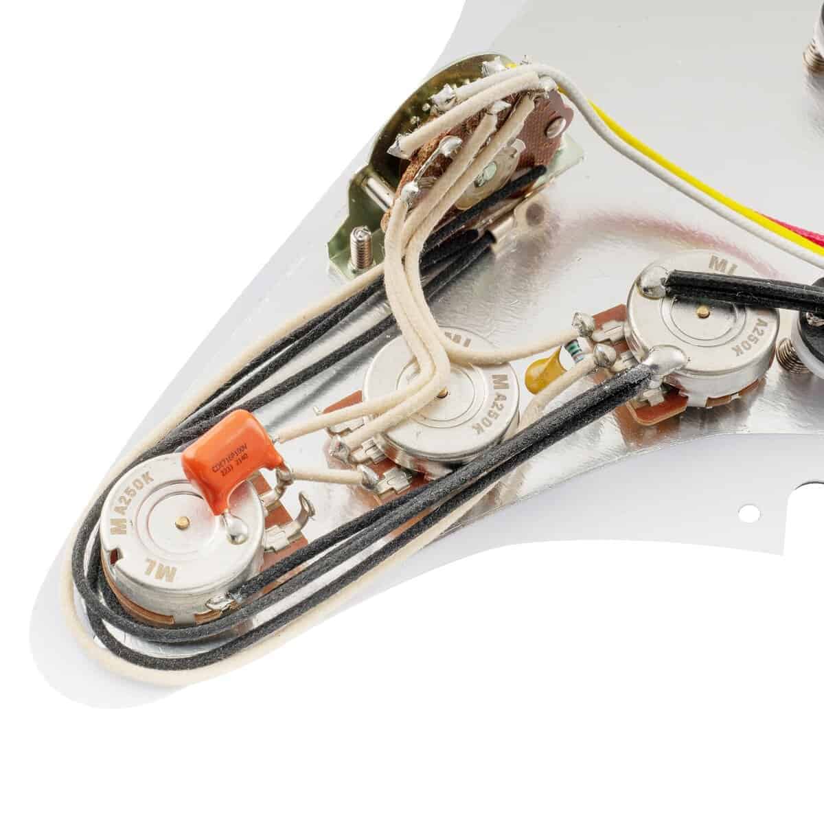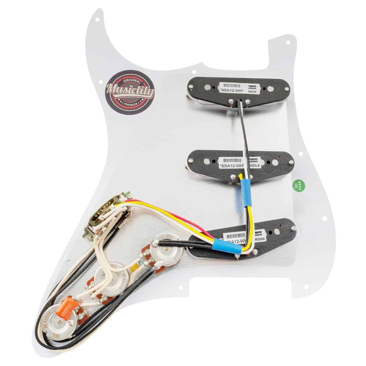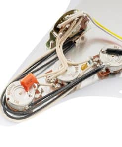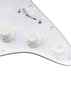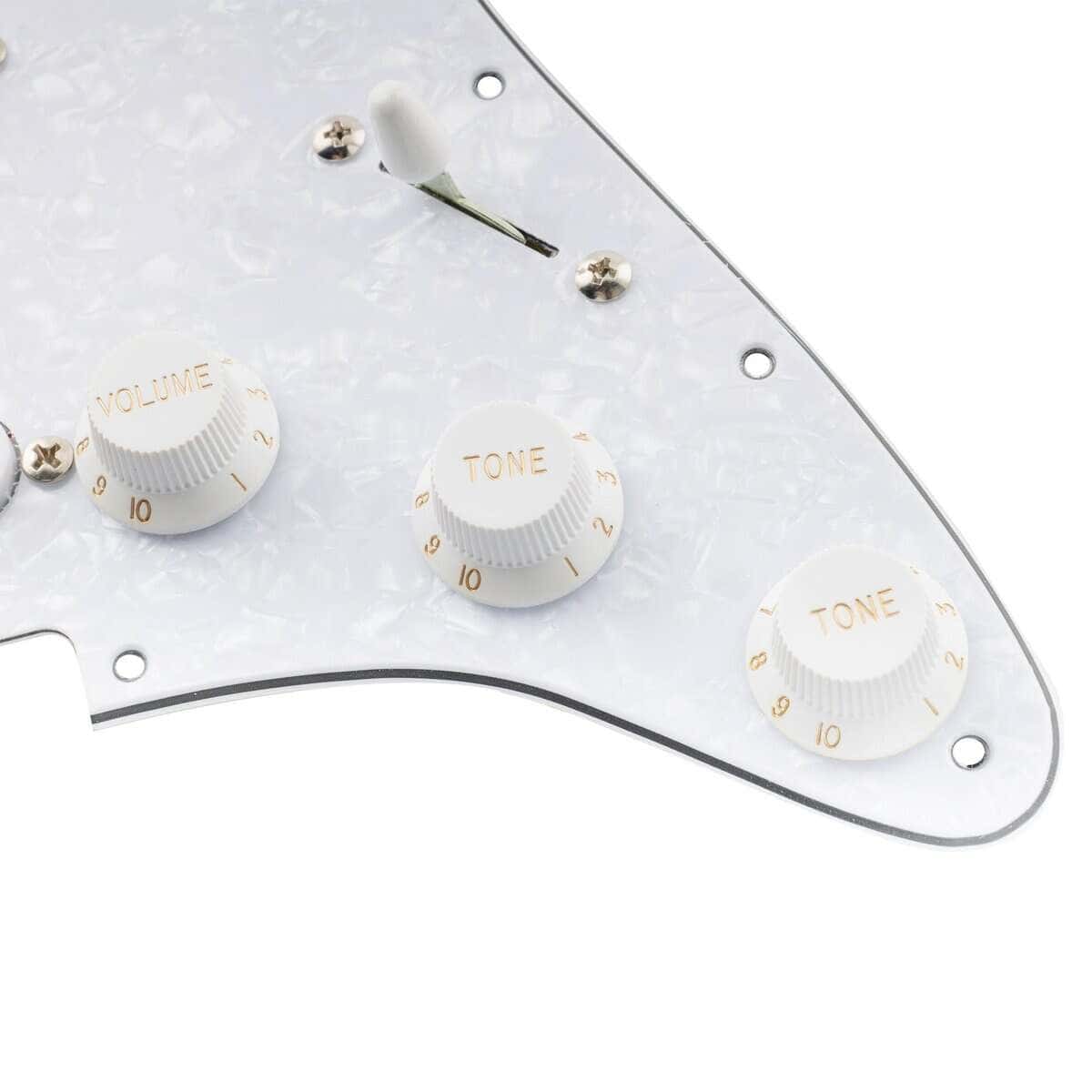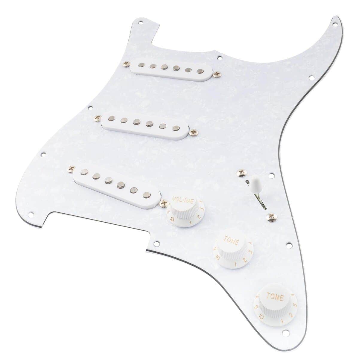 El pickguard precableado Musiclily Pro Standard SSS con pastillas Artec de bobina simple y magnetos de Alnico 5 para guitarra eléctrica estilo ST, 4 capas de perla blanca. Buena elección para mejorar una Squier Strat SSS u otra guitarra de estilo similar importada, también se adapta a la mayoría de las guitarras eléctricas estilo Strat SSS modernas estándar Americanas/Mexicanas, lleva tu tono al siguiente nivel. Con pastillas de bobina simple Artec (6.3K/6.5K/6.5K) con polos de imán de Alnico 5 escalonados, están diseñadas para emular las clásicas pastillas Strat Americanas de los años 60 de Fender, con tonos claros y auténticos sonidos vintage. Pastilla central con bobinado invertido y polaridad invertida para cancelación de ruido. Construido a mano por técnicos experimentados en el local, elegimos piezas premium de recursos confiables, nos enfocamos en cada detalle durante el cableado y la prueba, nos enorgullecemos de nuestro trabajo. Viene con la guía de usuario que tiene un diagrama de cableado profesional para resolver tus problemas de cableado. El paquete incluye: 1 pickguard precableado. Pastillas Artec (Cuello/Medio/Puente): Resistencia 6.3K/6.5K/6.5K, Imán: Alnico 5; Espaciado de polos: 50mm/52mm/52mm; Potes: Eje estriado de latón completo Serie A250K x 3; Conmutador de 5 posiciones de estilo importación hecho en Corea de alta resistencia y jack de salida; Condensador Orange Drop de .022 F y Modificación de Bleed de agudos; Cableado de tela de estilo vintage de empuje hacia atrás.