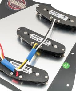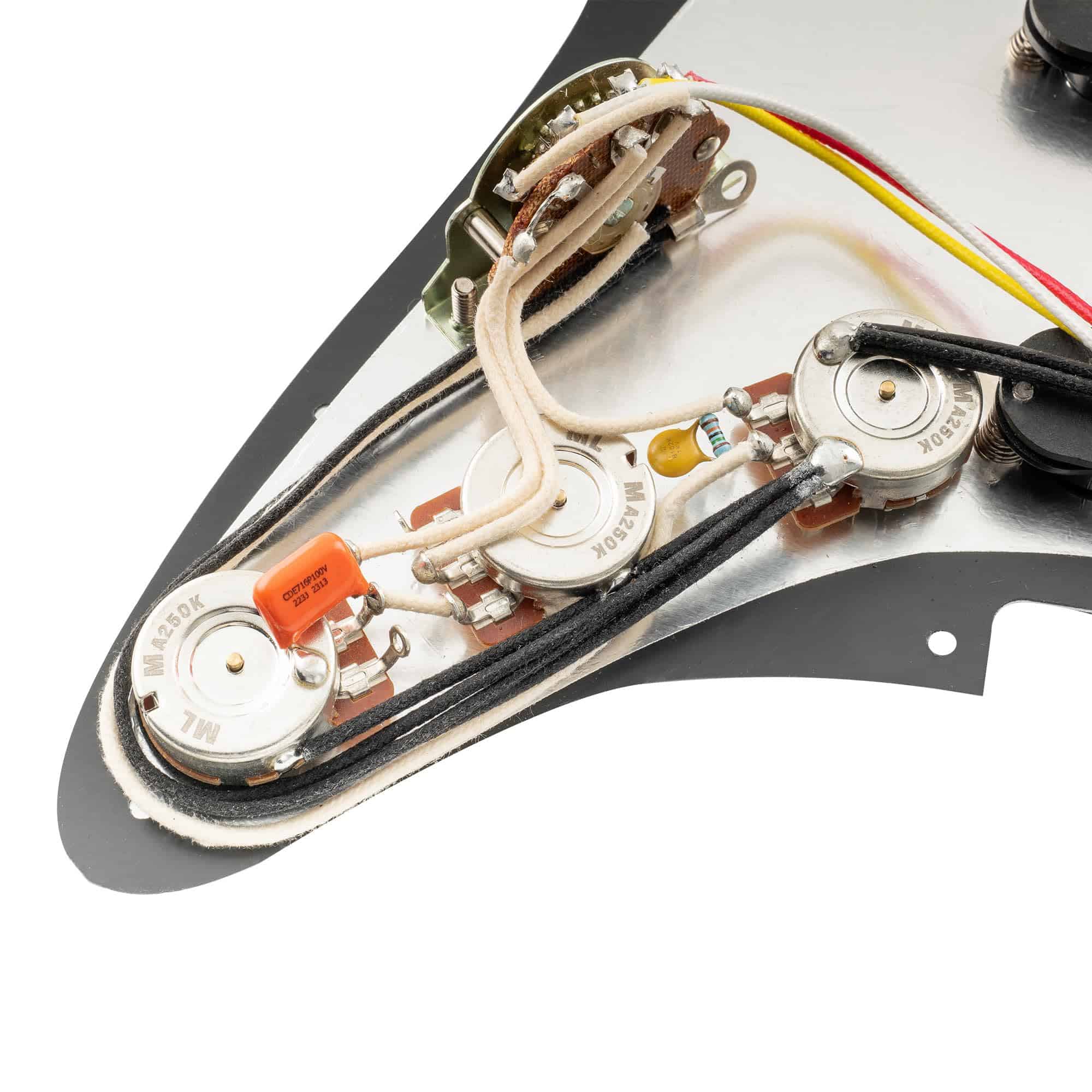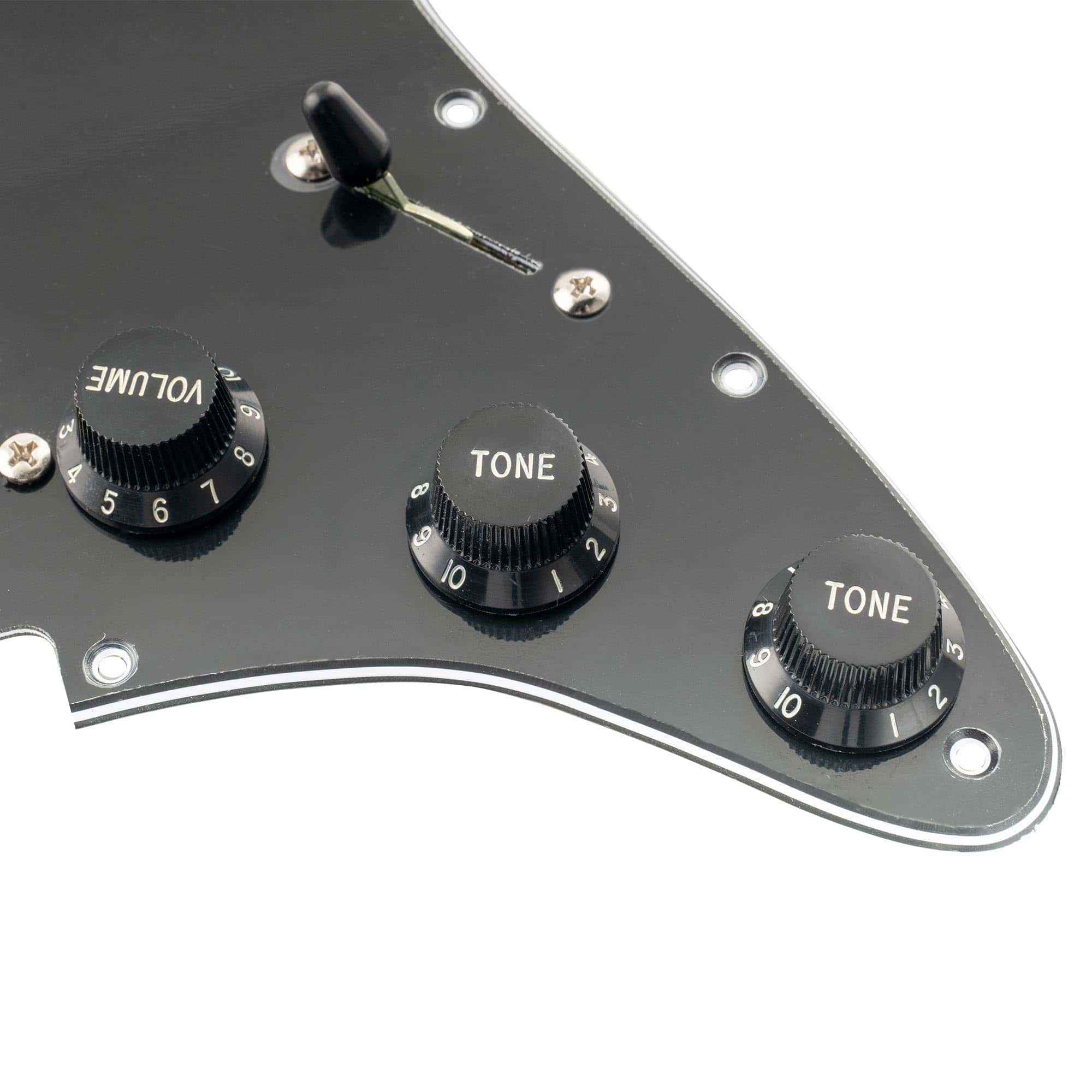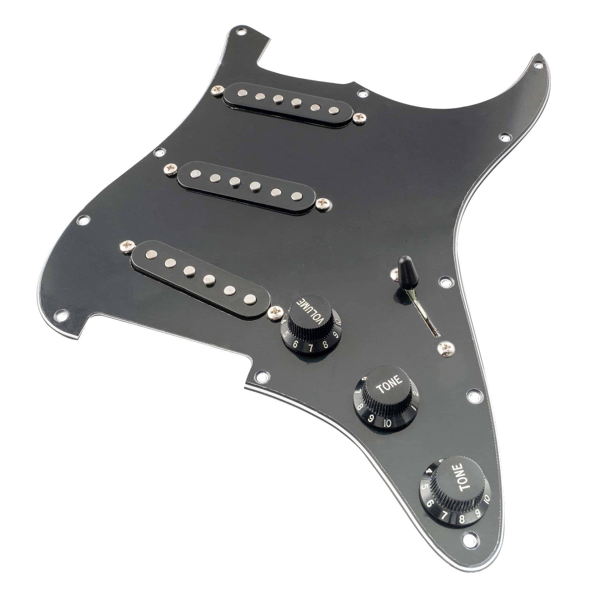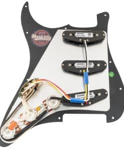 El pickguard precableado Musiclily Pro es una excelente elección para mejorar tu guitarra Squier Strat SSS u otros modelos de importación similares, también es compatible con la mayoría de las guitarras eléctricas de estilo Strat SSS Americano/Mexicano estándar moderno, lleva tu tono al siguiente nivel. Incluye pastillas de bobina simple Artec (6.3K/6.5K/6.5K) con imanes de polo de Alnico 5 escalonados, diseñadas para emular las clásicas pastillas Strat americanas de los años 60 de Fender, con tonos claros y campanudos y un sonido vintage auténtico. Pastilla central con polaridad y bobinado inversos para cancelación de ruido. Montado a mano por técnicos experimentados en nuestras instalaciones, elegimos partes premium de recursos confiables, nos enfocamos en cada detalle durante el cableado y la prueba, nos enorgullecemos de nuestro trabajo. Viene con una guía del usuario que incluye un diagrama de cableado profesional para resolver tus problemas de cableado. El paquete incluye: 1 pickguard precableado. Pastillas Artec (Cuello/Medio/Puente): Resistencia de 6.3K/6.5K/6.5K, Imán: Alnico 5; Espaciado de polos: 50mm/52mm/52mm; Perillas: Serie HD de eje estriado de latón completo A250K x 3; Interruptor de 5 vías resistente de estilo importado fabricado en Corea y conector de salida; Condensador Orange Drop de .022 F y Mod de retención de agudos; Cableado con revestimiento estilo vintage en retroceso.