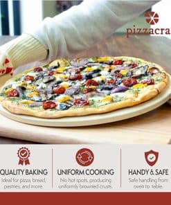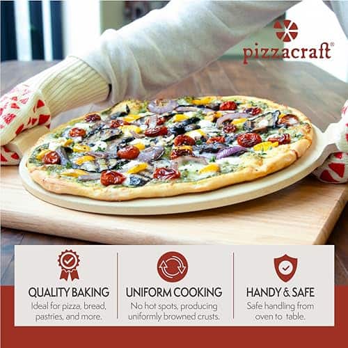 La Piedra para Pizza Redonda PC0104 de Pizzacraft cuenta con asas incorporadas para facilitar su manipulación. Las piedras ThermaBond son fabricadas con la exclusiva tecnología ThermaBond de Pizzacraft; formulada especialmente para eliminar la rotura por choque térmico, promover una distribución de calor uniforme y retenerlo, y garantizar durabilidad para una cocción consistente en el horno o la parrilla. Esta piedra para pizza es perfecta para pizza, pan, pasteles y otros productos horneados.