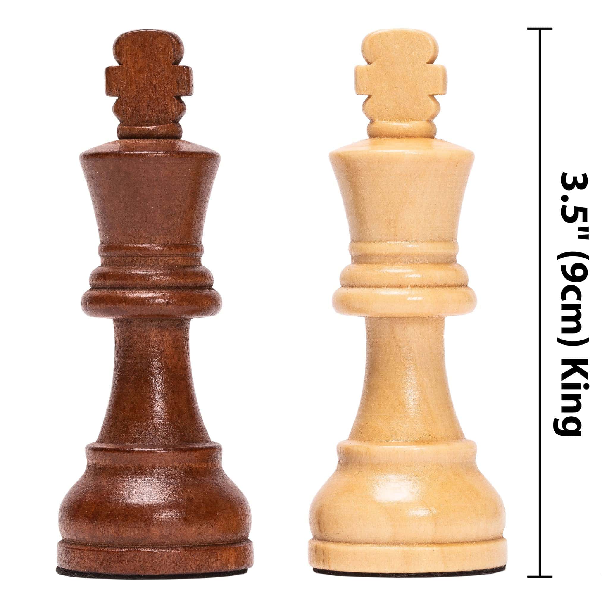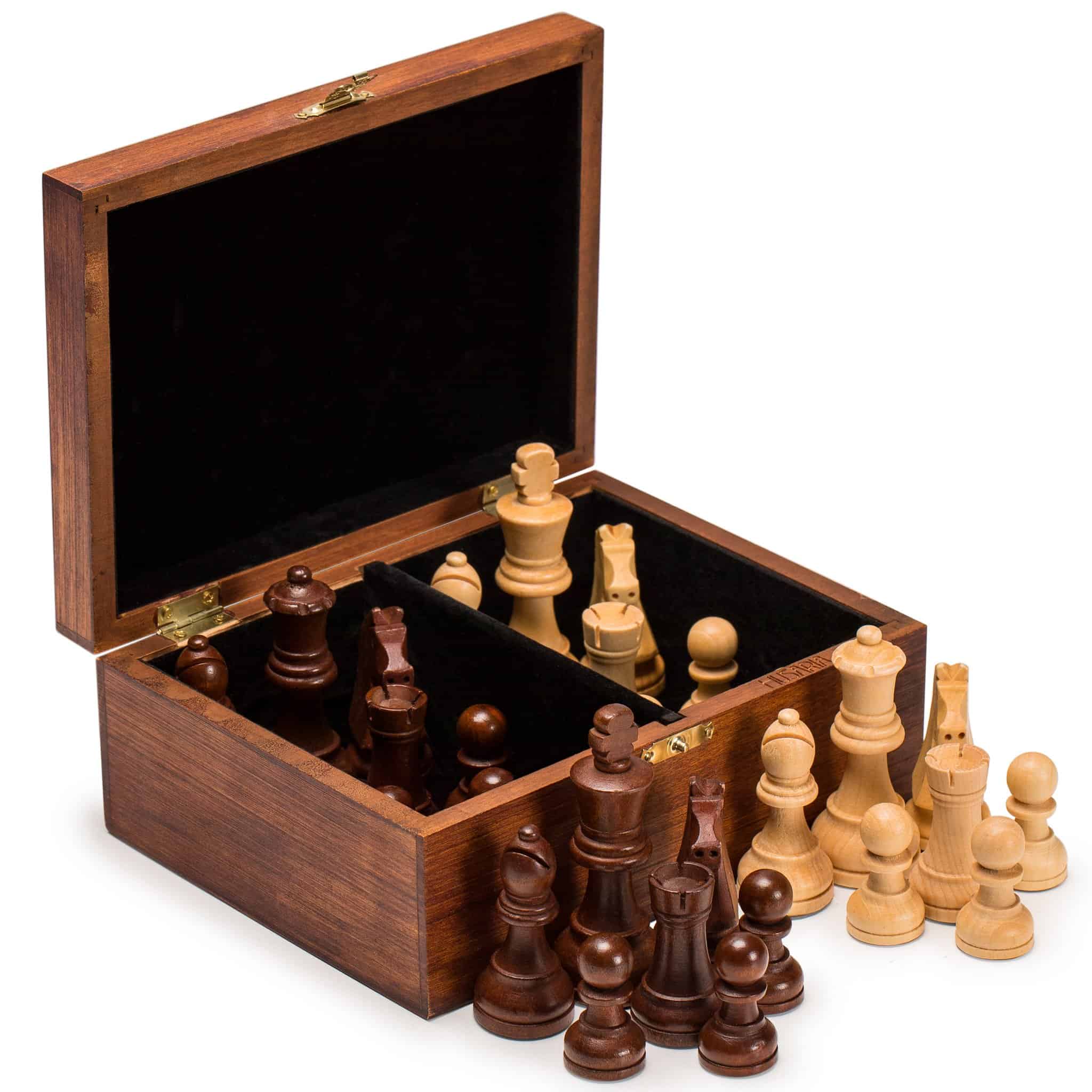 Las piezas de ajedrez Staunton han sido el estándar para los torneos de ajedrez desde 1849. Estas clásicas piezas de ajedrez de madera vienen acompañadas de una elegante caja de madera.