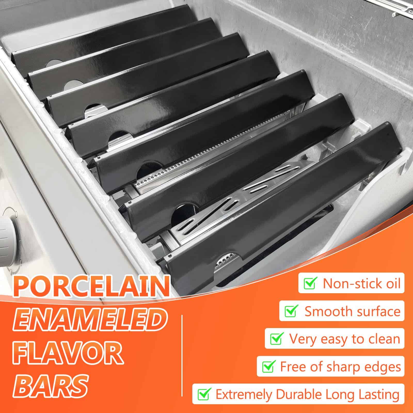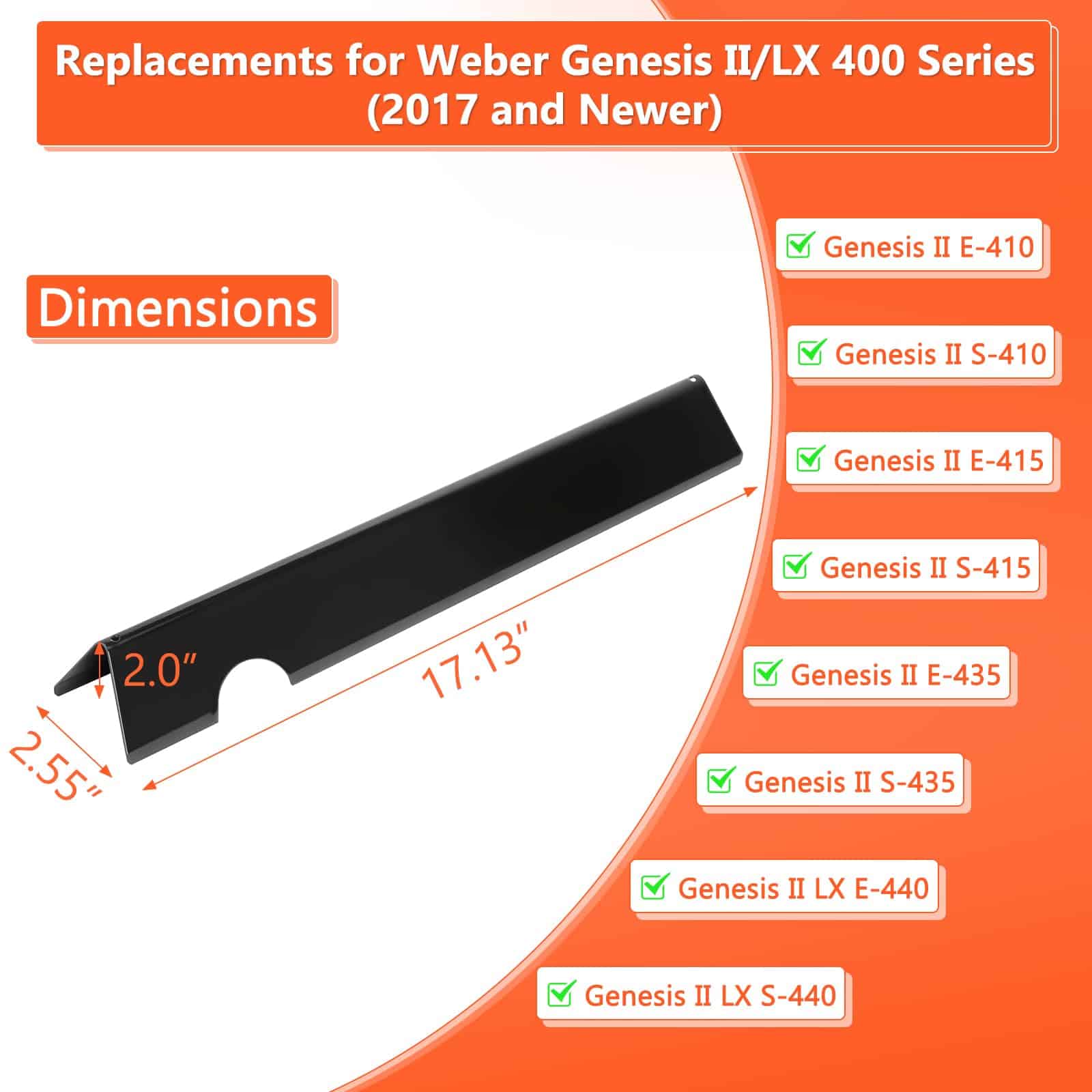 1. Perfecto para Weber GS4 Genesis II 400. 2. Dimensiones y paquete: Cada barra saborizante para Weber Genesis II mide 17.13″ x 2.55″ x 2.0″ (L x A x H). Paquete incluye 7 piezas de barras saborizantes esmaltadas porcelana para Weber Genesis II.
