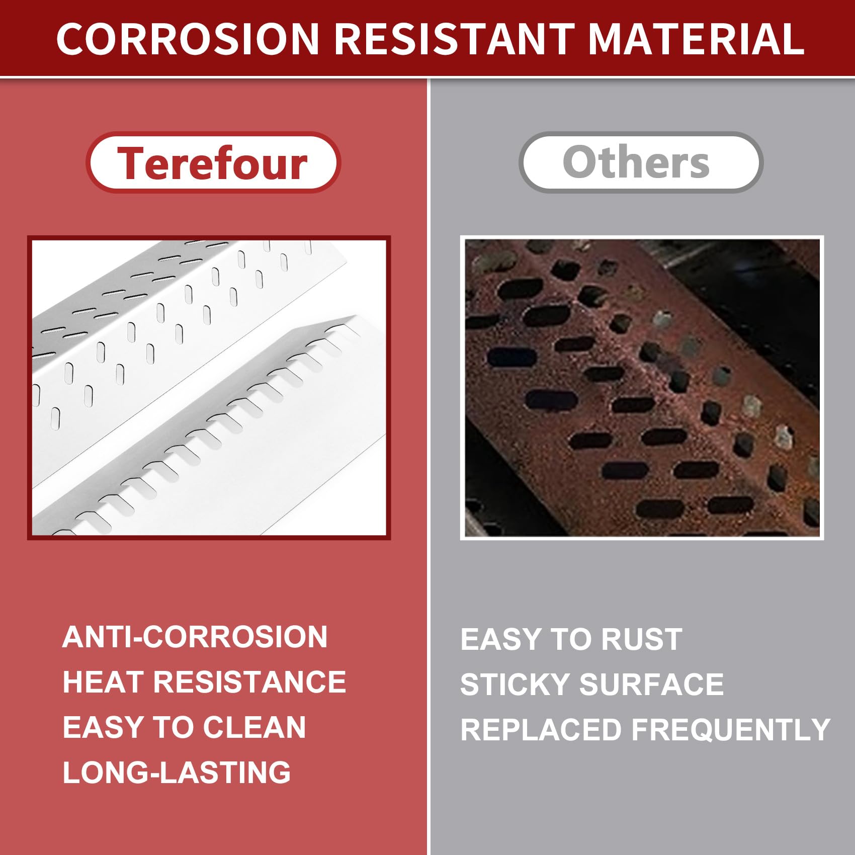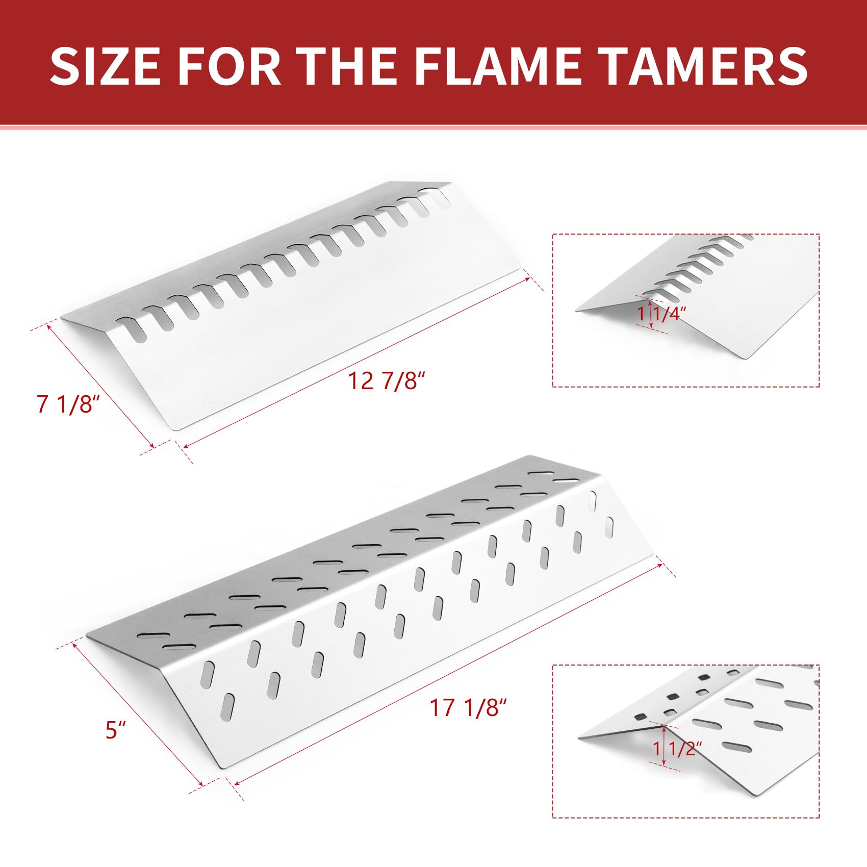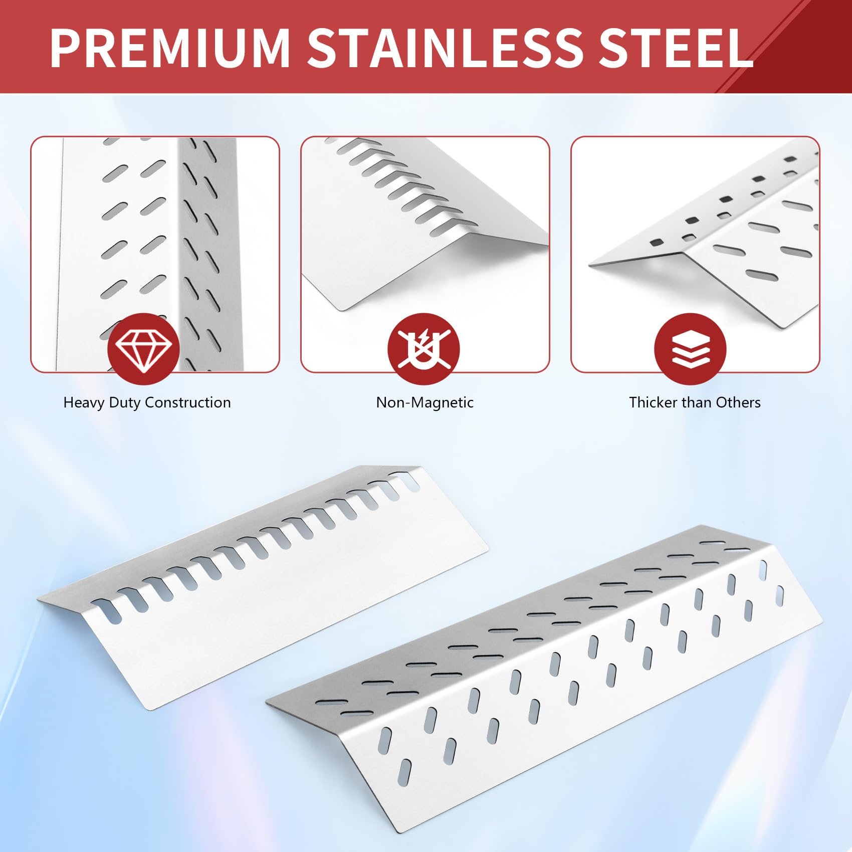 Piezas de repuesto para parrilla Bull, incluye placa de escudo térmico y flame tamer para diversos modelos como Angus 4 Quemadores, Brahma, Cal Flame G4 Outlaw, Steer Premium, Lonestar 4 Quemadores, Outlaw 4 Quemadores, y Lion Premium. Hechas de acero inoxidable resistente, duradero y con resistencia a la oxidación, corrosión y calor. Evitan que los alimentos se expongan directamente a la llama, ayudan a atrapar goteos y aceite, añaden un sabor ahumado a los alimentos y calientan los alimentos de manera uniforme para lograr un delicioso sabor a la parrilla al aire libre o en reuniones gourmet al aire libre.