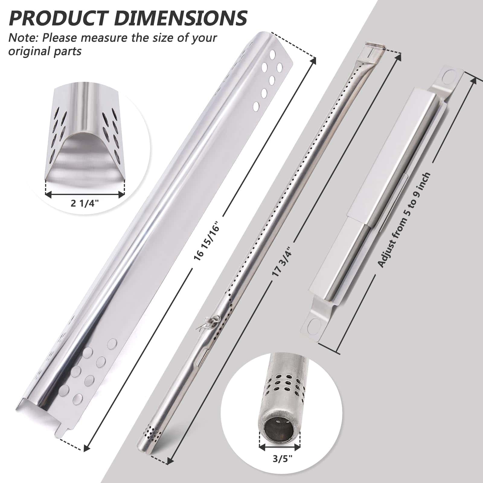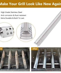 Conjunto de piezas de repuesto de alta calidad para varios modelos de parrillas Charbroil. Incluye quemadores de acero inoxidable, placas calefactoras y tubos cruzados ajustables. Compatible con los modelos de parrillas mencionados en la descripción.