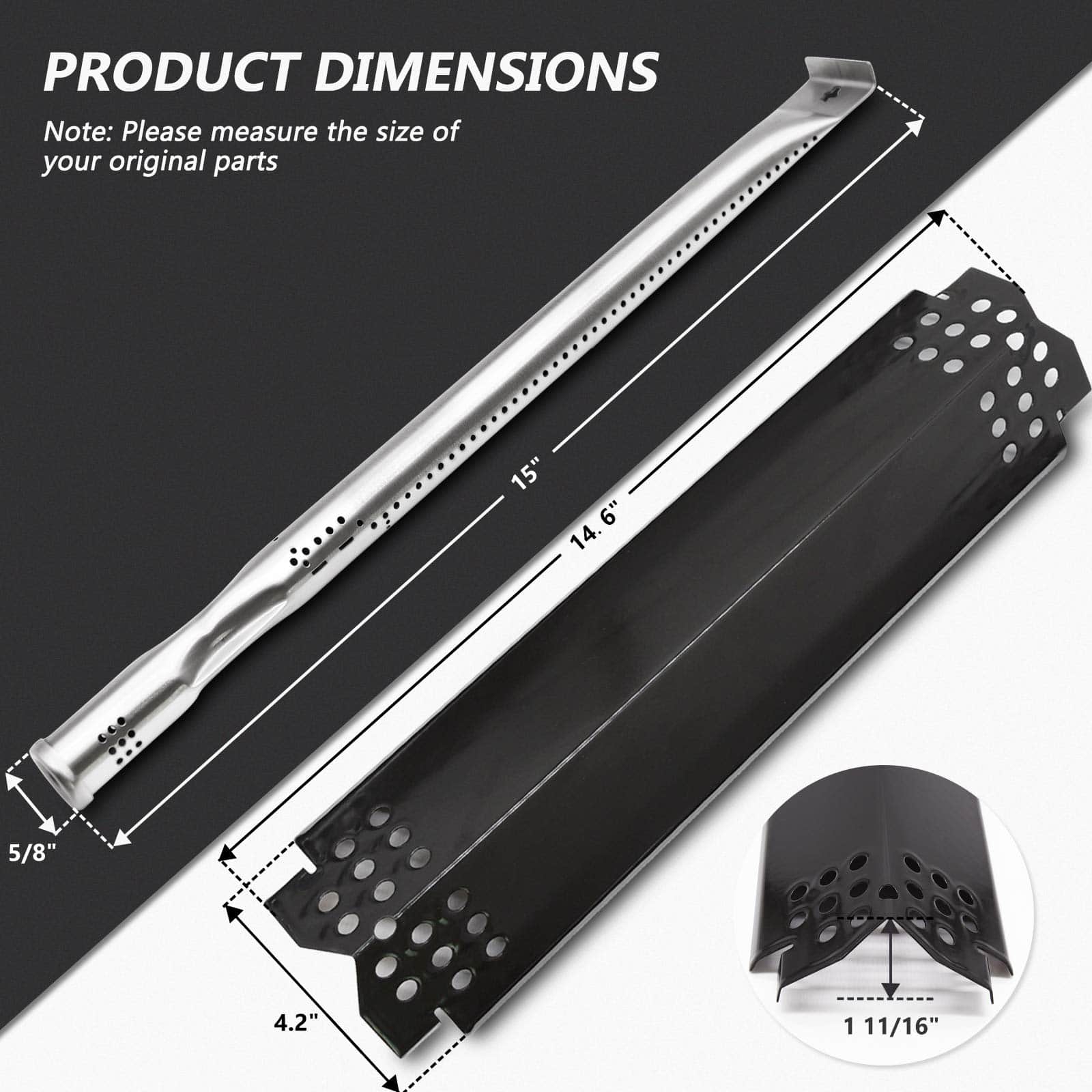 ¡La Pieza de Repuesto para Parrilla que Siempre Necesitaste! Cambiar tus tubos quemadores de parrilla de forma regular ayudará a aumentar la efectividad de tu parrilla; Ayuda a que tu parrilla dure más tiempo y también ahorra combustible; Crea una superficie de calentamiento más uniforme. Especificación: Lo que obtienes: 5 x Protectores de Calor, 5 x Tubos de Quemadores & 5X Encendedores; Dimensiones de la Carpa Térmica: L 14.6″x W 4.2″ x H 1.7″; Material de la Placa de Calor: Acero Porcelanizado; Dimensiones de los Tubos de Quemadores: 15″ x 5/8″; Material de los Tubos Quemadores de Tubería: Acero Inoxidable; Longitud del Cable de los Encendedores: 95cm/37.4 pulgadas. Pieza de Repuesto para Parrilla de Gas Nexgrill: Se adapta al Modelo Nexgrill: 720-0882A, 720-0896, 720-0896B, 720-0896C, 720-0925, 720-0896E. Preguntas Frecuentes: P: ¿Estos se ajustarán a mi nexgrill 720-0882a? R: Sí, se ajustan a la parrilla de gas nexgrill 720-0882a. P: ¿Se ajustarán a mi nexgrill 720-0896? R: Claro, estos tubos quemadores se ajustarán a tu parrilla de gas nexgrill 720-0896. Pero necesitas un quemador sellador adicional para usar con la parrilla de gas nexgrill 720-0896 ya que nexgrill 720-0896 utiliza dos tipos diferentes de tubos quemadores. P: ¿Está hecho de acero esta pieza? R: La placa de calor está hecha de acero porcelanizado y los tubos de tubería son de acero inoxidable, materiales de alta calidad al igual que la pieza original. Aviso Cálido: Confirmar amablemente el modelo de su parrilla y revisar dos veces el tamaño de sus Piezas Originales de la Parrilla antes de realizar su pedido; Nexgrill 720-0896 utiliza 2 tipos diferentes de quemadores: 1X Quemador Sellador y 4X Quemadores de Tubería, por favor, tengan en cuenta que nuestro producto incluye 5 tubos quemadores idénticos.