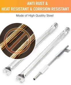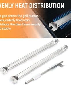 4. Dimensiones y Materiales: Juego de 3 barras flavorizer para parrilla Weber Spirit, cada una mide 15.3″L x 3.5″W x 2.5″H. Set de quemador para parrilla Weber en acero inoxidable, incluye 2 quemadores principales y 1 quemador auxiliar. Los dos quemadores principales miden 18″L, el quemador auxiliar mide 10.5″L.
