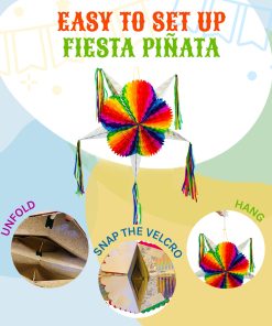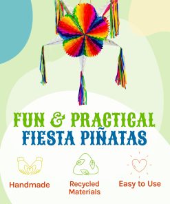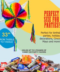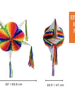 ¡Cada temporada de vacaciones, Mardi Gras y fiesta de Cinco de Mayo son un poco más festivas con una piñata! ¡Esta puede contener 4-5 libras de dulces, pero también puede servir solo como un adorno colgante! ¡Es casi demasiado bonita para golpear con un palo, pero si es necesario, es necesario! ¡Súper colorida y ligera, y hecha en Puebla, Puebla, México – la diversión está asegurada! Plegada para envío: Altura: 19″ Longitud: 19″ Ancho: 2.5″ Ancho Expandido: 33″ desde las puntas de la estrella hasta el centro florido tiene 17″ de ancho. Peso: 2.75 libras