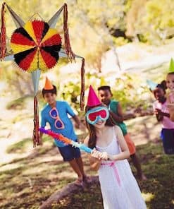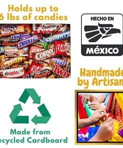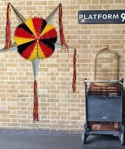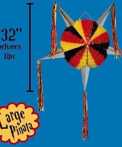 Piñata grande con forma de estrella de 5 puntas en los colores negro, rojo y amarillo, diseñada para dar un toque mágico a tus celebraciones. Esta piñata es ideal para cumpleaños temáticos de Harry Potter o fiestas de magos, así como para eventos como Oktoberfest, donde su elegante diseño con la bandera alemana la convierte en un accesorio festivo y divertido. Hecha a mano por expertos artesanos mexicanos, esta piñata es plegable y resistente, soportando hasta 6 lb de dulces para garantizar la diversión de todos los asistentes.