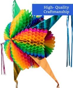 3. Artesanía Auténtica: Nuestra tradicional piñata arcoíris está hecha a mano en el centro de México por artesanos locales que se enorgullecen de su trabajo y herencia. Estas piñatas mexicanas están hechas de cartulina blanca de primera calidad, papel de seda teñido a mano y serpentinas de papel de aluminio para crear un diseño de piñata cónica resistente.