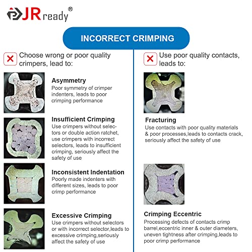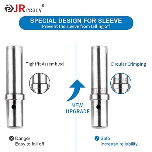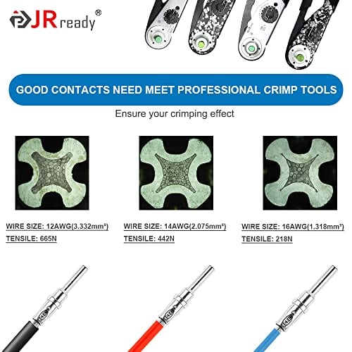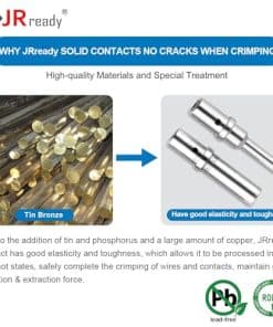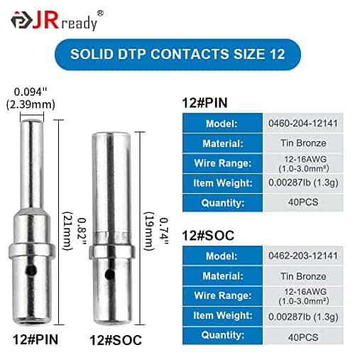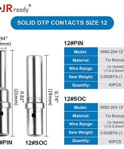 1. Amplio rango de cables: Terminal JRready dtp abarca cables de 12 AWG a 16 AWG 1.0 – 3.0 mm. Compatible con terminales estándar de 12-14AWG, retrocompatible con 16AWG. 2. Series de conector adecuadas: AEC Series, DRB Series, DTP Series (conector deutsch calibre 12), Series HD10, HD20, HD30, DT, HD, JIFFY SPLICE. 3. Versatilidad: Los conectores DT se aplican ampliamente en remolques, embarcaciones, camiones, autobuses, vehículos todo terreno, construcción, agricultura, minería, vehículos de emergencia, silvicultura, recreativos, marinos, motocicletas, reparación de equipos pesados. 4. Material de alta calidad: Bronce estañado (niquelado). Los terminales JRready están hechos de cobre de alta calidad, no se agrietan al crimpado correcto. Hemos tratado especialmente el barril de la cola para garantizar que cada crimpado no se rompa. 5. Kit de contactos JRready DTP incluye: 40 pares, contacto de pin 0460-204-12141 / contacto de socket 0462-203-12141.