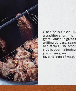 Pit Barrel Cooker Junior es el accesorio perfecto para tu fumador de barril. Con su rejilla de alambre de hierro cromado duradero, podrás colgar carne y asar vegetales simultáneamente. La rejilla de acción dual te permite aprovechar al máximo el espacio de cocción. Un lado cerrado es ideal para asar hamburguesas, mariscos, filetes y verduras, mientras que el otro lado abierto te permite colgar costillas, lomo de cerdo y mucho más. Cocina sin esfuerzo y ahorra tiempo con esta versátil rejilla. Con GrillGrate personalizado, podrás lograr marcas de sellado perfectas y ahumar una amplia variedad de alimentos. Construido con hierro cromado de alta resistencia, este accesorio duradero te acompañará en todas tus aventuras culinarias al aire libre.