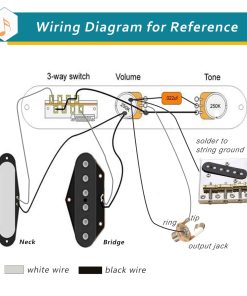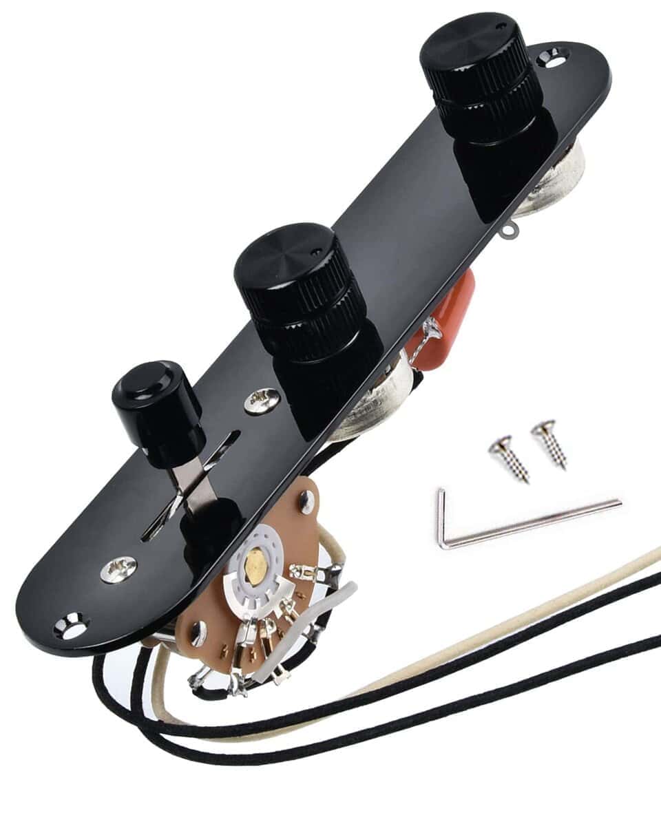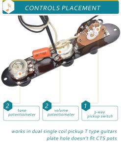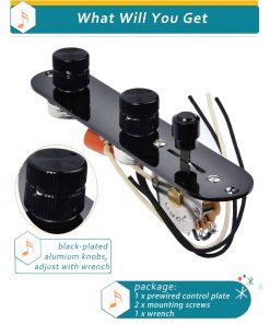 Placa de Control de Guitarra Totalmente Cargada LAMSAM, Interruptor de Cuchilla de 3 vías Preconectado Potenciómetros Grandes Capacitor Naranja, Controles de Volumen Tono Estriados Ajuste para Guitarras con Pastillas de Bobina Simple, Negro. Esta placa de control de guitarra pre-cableada está hecha de material sólido y viene con un arnés de cableado pre-instalado, lo que la hace fácil de instalar con la cantidad mínima de soldadura. Las perillas de control estriadas y el capacitor naranja de 0.022uf ayudan a limpiar completamente su tono y permiten que la calidad completa de sus pastillas brille. Equipado con potenciómetros de tamaño completo de 250k con eje de latón dividido y un interruptor de cuchilla de 3 vías con punta negra, esta placa de control de guitarra es la actualización definitiva para su Telecaster. Funciona en guitarras tipo T de doble pastilla de bobina simple y es ideal para sus construcciones o reparaciones de Telecaster. Obtendrás 1 paquete de control de guitarra eléctrica para 6 cuerdas totalmente cargado y 2 tornillos de montaje para una fácil instalación.