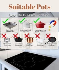 2. Características de Seguridad para una Protección Última: La Placa de Inducción Weceleh toma en serio la seguridad. Viene equipada con bloqueos de seguridad para niños, protección contra sobrecalentamiento, apagado automático cuando se deja desatendido, protección contra desbordamiento y detección automática de ollas. Disfruta de la tranquilidad mientras cocinas. 3. Fácil Uso con Control Táctil Preciso y Construcción Duradera: La Placa de Inducción Weceleh está diseñada para un uso fácil y una durabilidad duradera. La superficie superior de vidrio liso se controla mediante sensor táctil, con 9 ajustes de nivel de potencia y un temporizador de 99 minutos. Además, las bobinas de inducción de cobre proporcionan un uso más prolongado que otros materiales de aluminio. 4. Actualización con Moderna Tecnología de Inducción, Garantía de 12 meses: La Placa de Inducción Weceleh es la elección perfecta para aquellos que desean mejorar su cocina con tecnología moderna. Disfruta de una cocción eficiente y segura con tecnología electromagnética que te ayuda a ahorrar en gastos de energía. Estamos seguros de la calidad de nuestros productos, ofrecemos una garantía de 12 meses para los clientes. 5. Compatible con Utensilios de Cocina Magnéticos: Los utensilios de cocina de acero inoxidable magnético, hierro fundido y hierro esmaltado son utilizables en placas de inducción. Para verificar si tu utensilio de cocina es adecuado para el uso en placas de inducción, simplemente utiliza un imán para probar la base del utensilio de cocina.