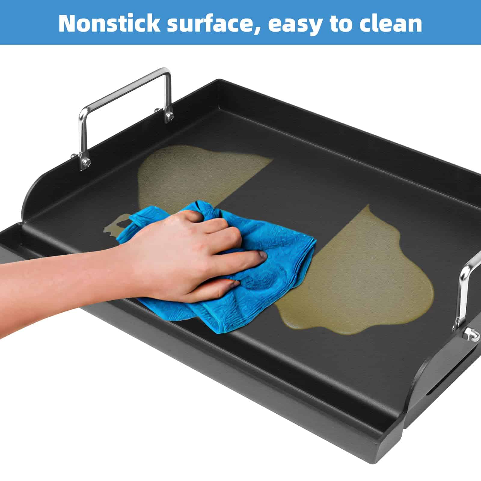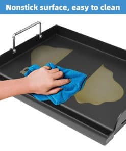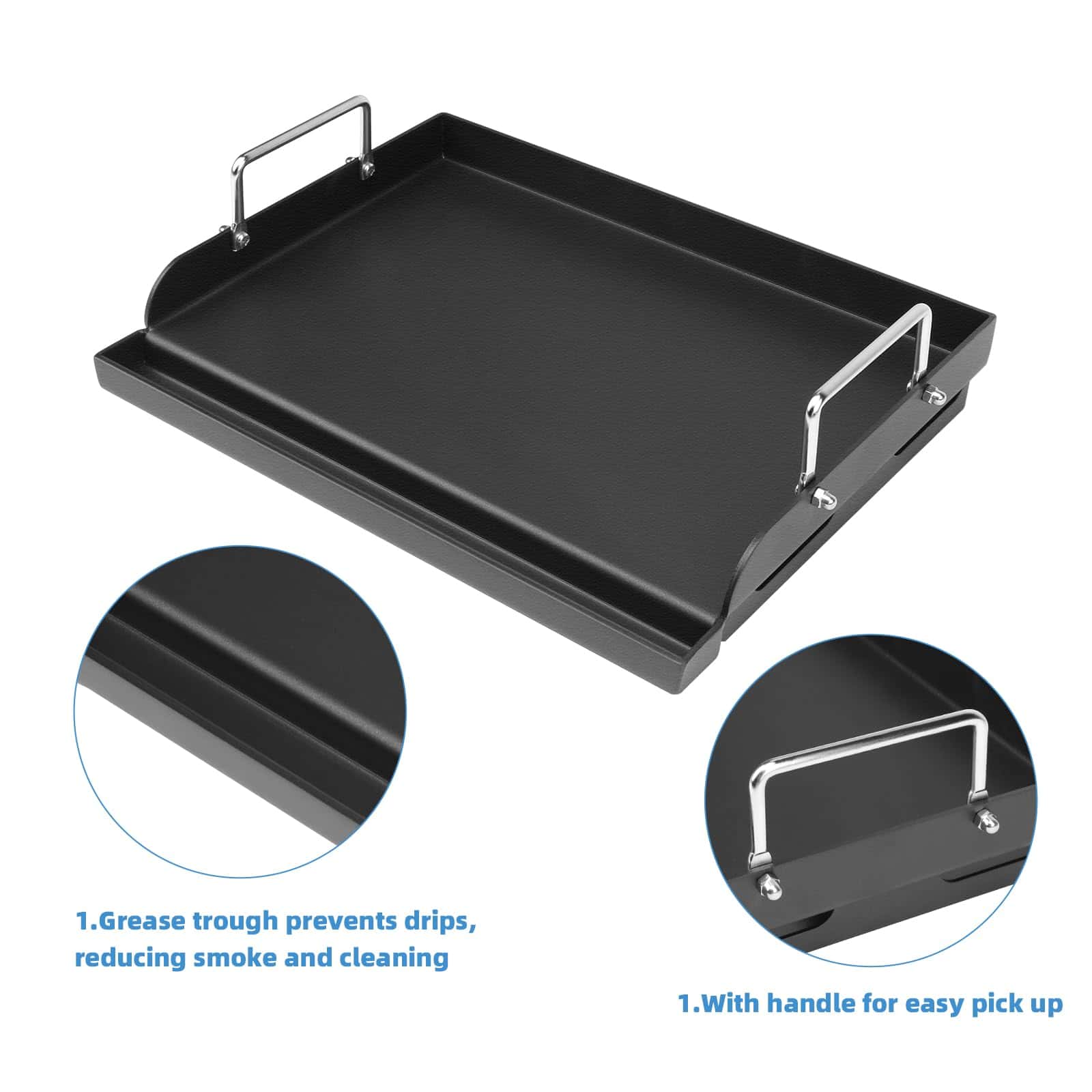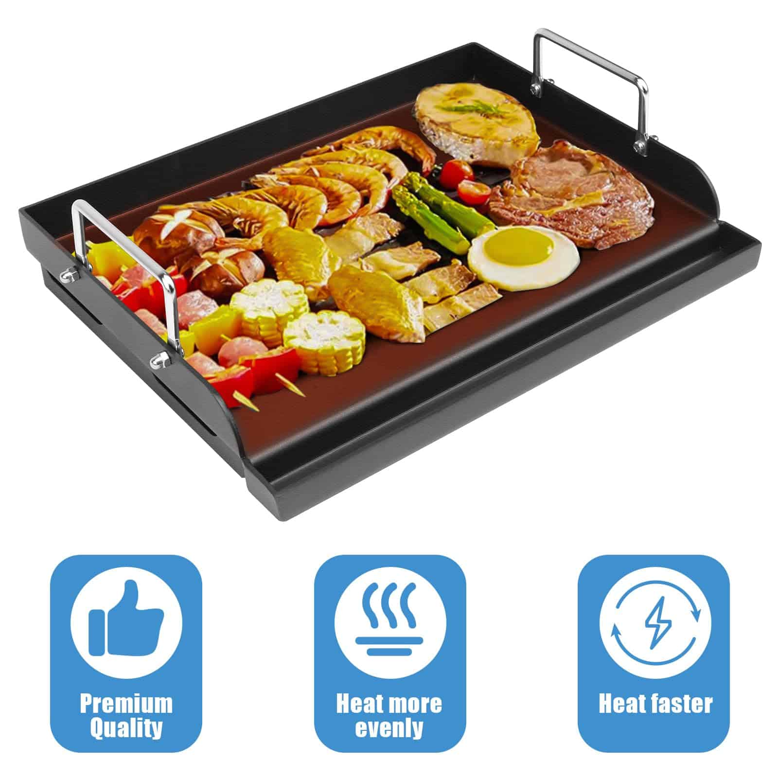 Placa de Plancha de 17″ x 13″ para Parrilla de Gas, ideal para aquellos que desean agregar una superficie plana y espaciosa a su parrilla. Esta placa de plancha cuenta con un recubrimiento antiadherente de alta calidad que facilita la limpieza y evita que los alimentos se peguen. Con un surco para grasa integrado y manijas desmontables, esta placa de plancha es versátil y fácil de usar en parrillas de gas, carbón o eléctricas. Fabricada con metal resistente y duradero, esta placa de plancha garantiza una distribución uniforme del calor y una excelente resistencia al calor. Apta para una amplia variedad de modelos de parrillas, esta placa de plancha es ideal para cocinar una amplia gama de alimentos con facilidad y precisión.