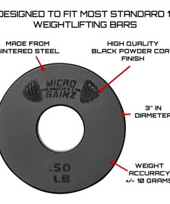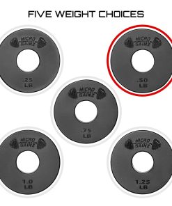 Las placas fraccionarias negras de Micro Gainz hacen que sea sencillo distinguir entre varios discos de peso mientras haces ejercicio; Este set incluye 2 placas de pesas fraccionarias estándar de 1 pulgada de .50 lb cada una. Nuestras placas de gimnasio estándar están fabricadas con acero sinterizado resistente para soportar el uso diario, con un recubrimiento en polvo de larga duración de color; Cada placa garantiza años de rendimiento confiable en todos los niveles de fuerza. El set de placas fraccionarias micro de Micro Gainz está calibrado con una tolerancia de peso de +/- 10 gramos, lo que te permite realizar ajustes precisos de peso incremental para un entrenamiento de fuerza controlado y efectivo con barras. Las placas de peso fraccionarias calibradas de Micro Gainz están diseñadas para la mayoría de barras estándar de 1″ mancuernas con capacidad de carga y barras de levantamiento de pesas EZ curl, ofreciendo una compatibilidad versátil para tus necesidades de entrenamiento. Micro Gainz proporciona placas fraccionarias de peso que resuelven la necesidad de incrementos de peso más pequeños, ayudando a la progresión de la fuerza con soluciones duraderas y calibradas para levantadores; ¡Gana músculo 1 libra a la vez!
