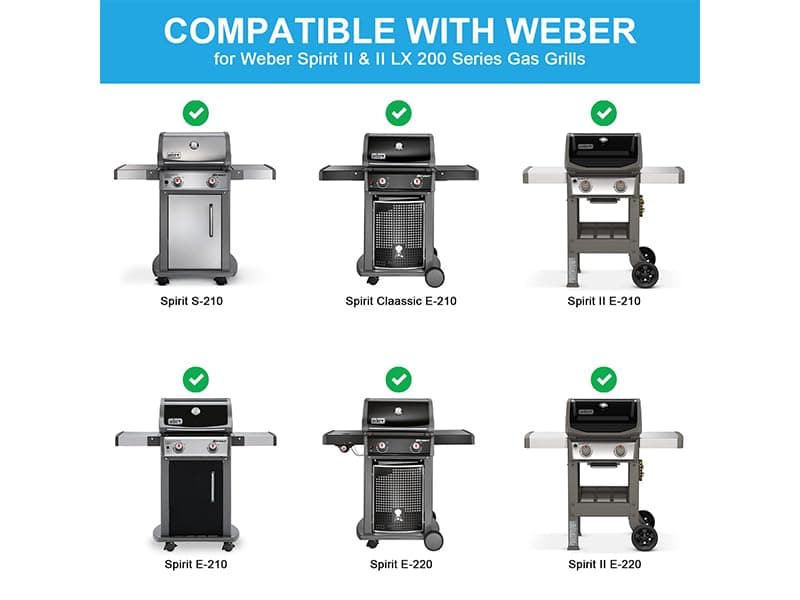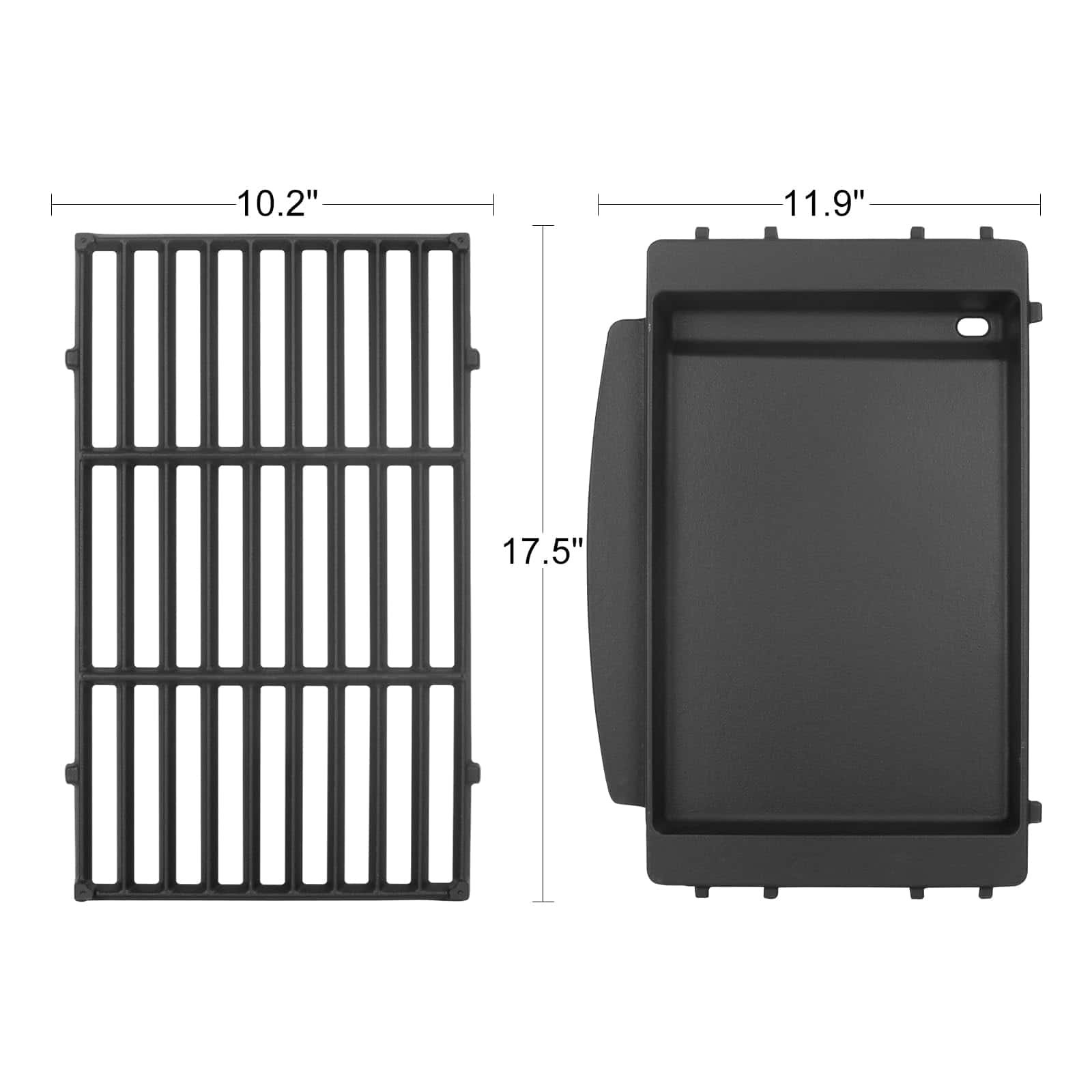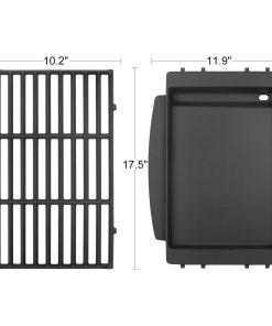 La Plancha de Cocina de Hierro Fundido 7658 y la Rejilla de Parrilla 7637 para parrillas Weber GS4 Spirit II y Serie I 200 son accesorios perfectos para tu parrilla Weber. Son compatibles con las series Weber Spirit 200 y Spirit II 200, incluyendo los modelos E-210, E-220, S-210, S-220. Hechas de hierro fundido con esmalte mate, estas piezas distribuyen el calor de manera uniforme para cocinar tus alimentos de manera eficiente. La plancha tiene unas dimensiones de 17.5 x 11.9 pulgadas mientras que la rejilla de parrilla mide 17.5 x 10.2 pulgadas. Son ideales para cocinar una variedad de alimentos como panqueques, huevos, tocino, verduras, mariscos y mucho más. Además, son fáciles de limpiar y mantener. Asegúrate de que este accesorio se ajuste a tu parrilla Weber antes de comprarlo y disfruta de deliciosas comidas preparadas en tu parrilla con la Plancha de Cocina de Hierro Fundido y la Rejilla de Parrilla Weber.