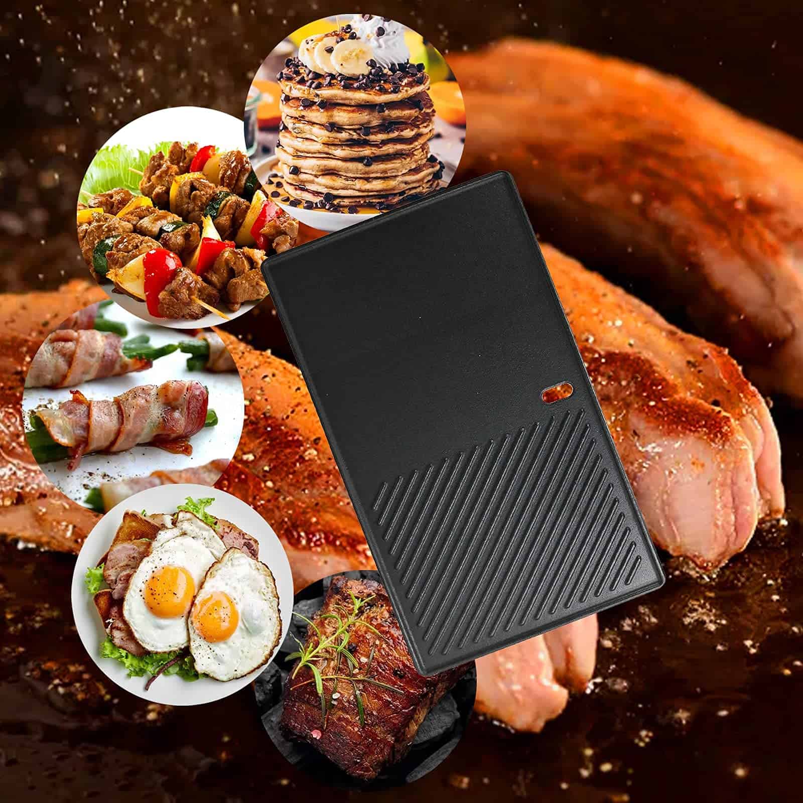 5. Antiadherente y fácil de limpiar – Simplemente aplique aceite de cocina al asar. Después de usar, limpie con agua caliente y un cepillo para evitar que se pegue. El diseño reversible asegura la liberación de alimentos sin esfuerzo y una fácil limpieza.