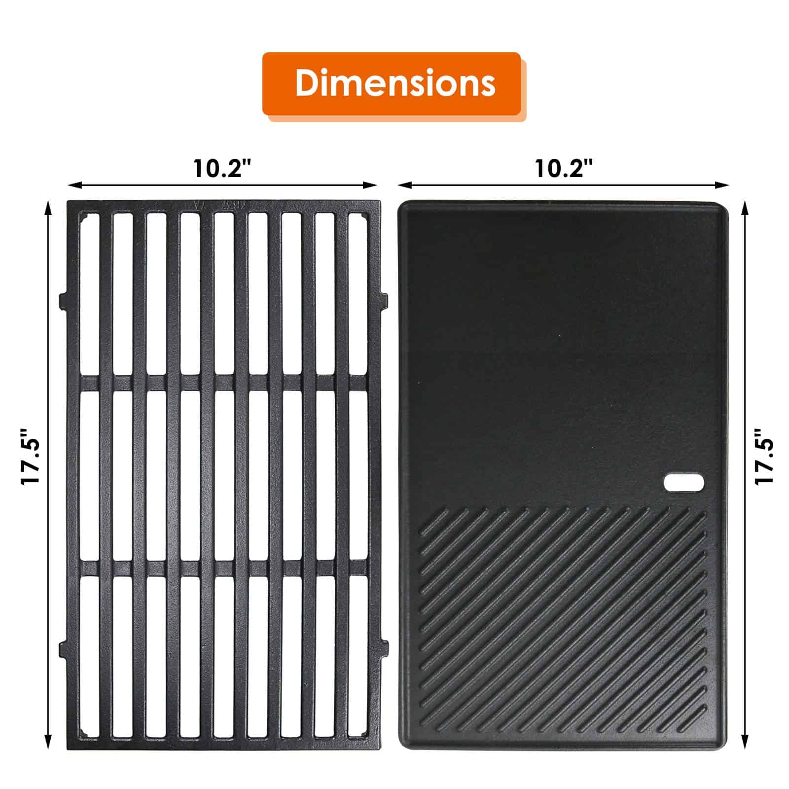 3. Dimensiones del producto – Rejilla: 17,5″ x 10,2″, plancha: 17,5″ x 10,2″, y 17,5″ x 20,4″ Paquete total incluye -1x rejilla de cocción, 1x plancha de cocción.